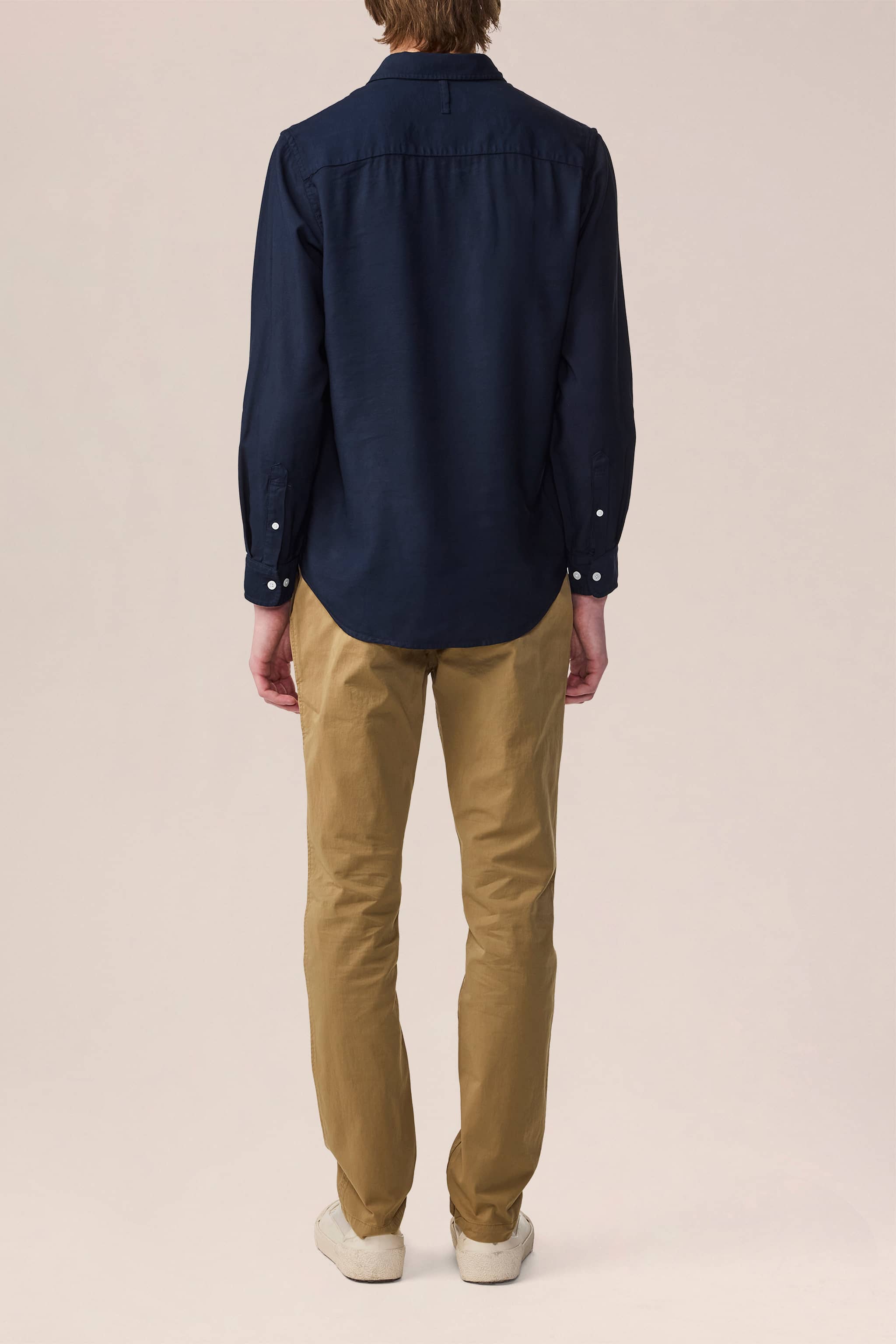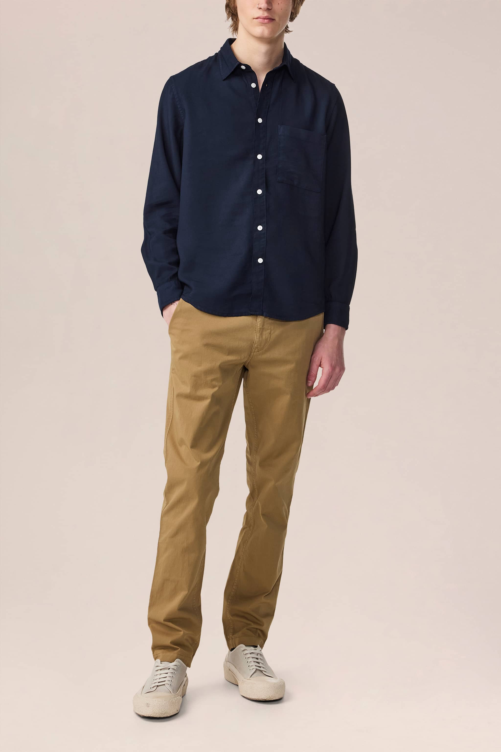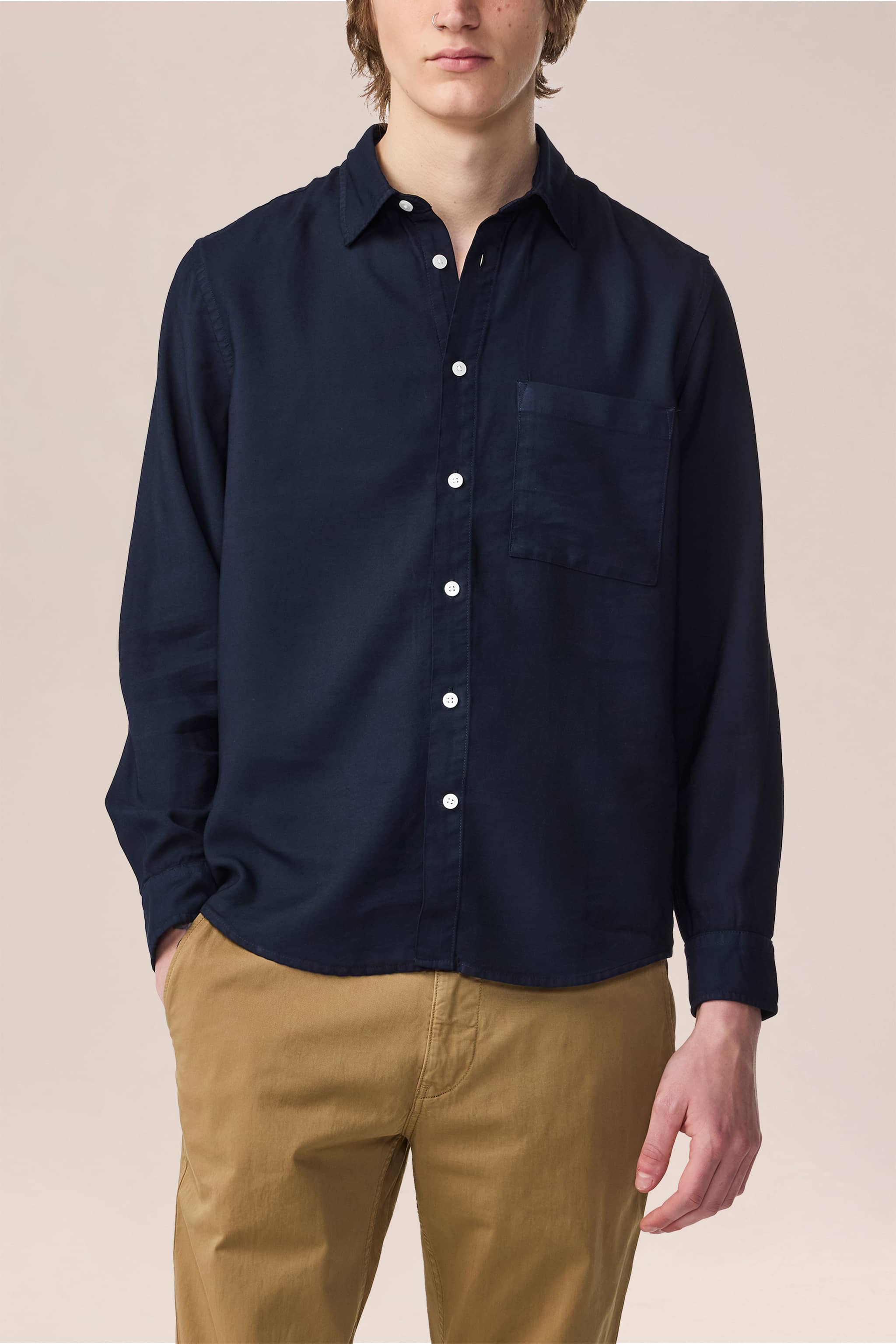 Langærmet button-down skjorte fremstillet i skinnende, LENZING™ ECOVERO™ viskose stoffarvet twill. Udstyret med knapper i perlemor.