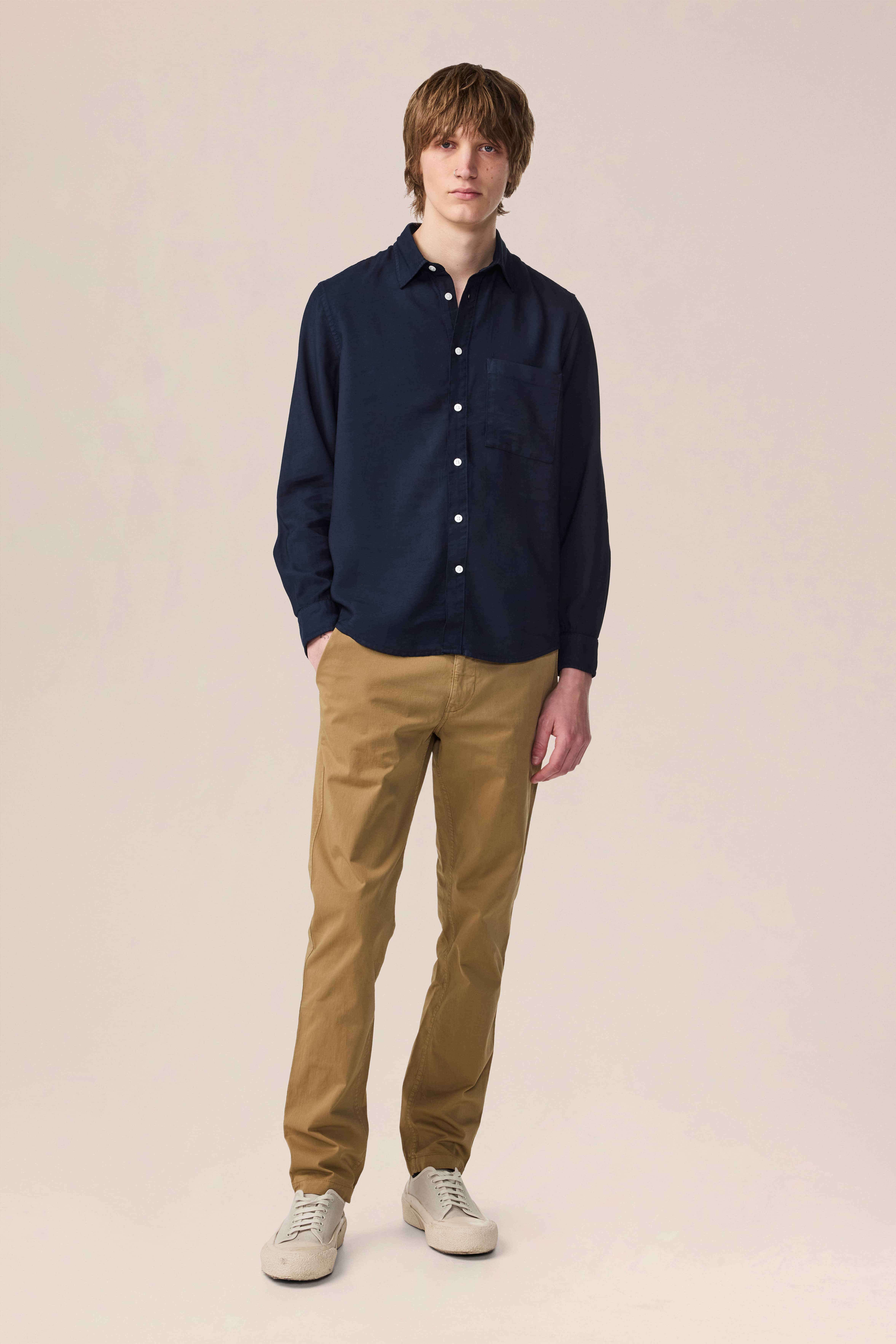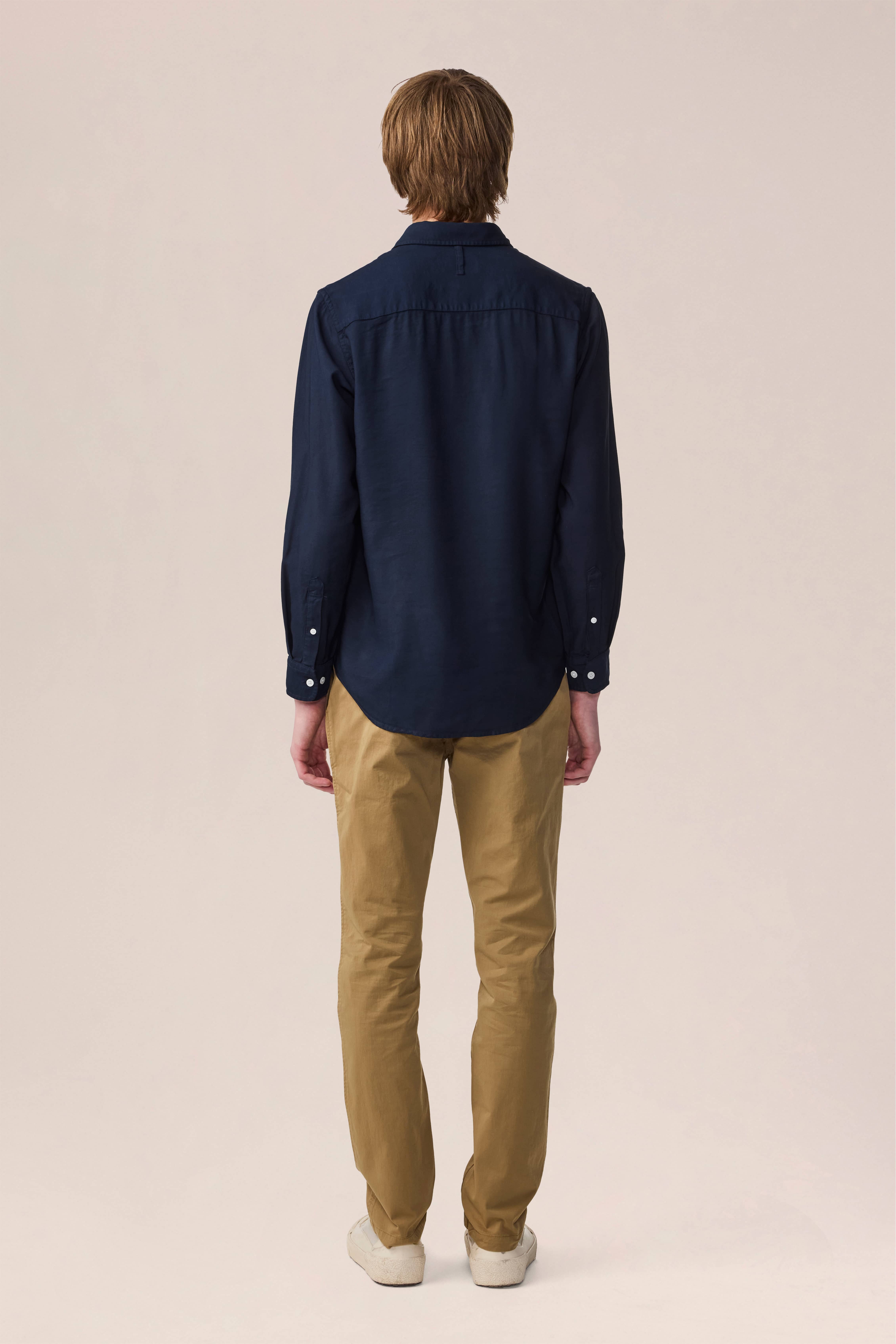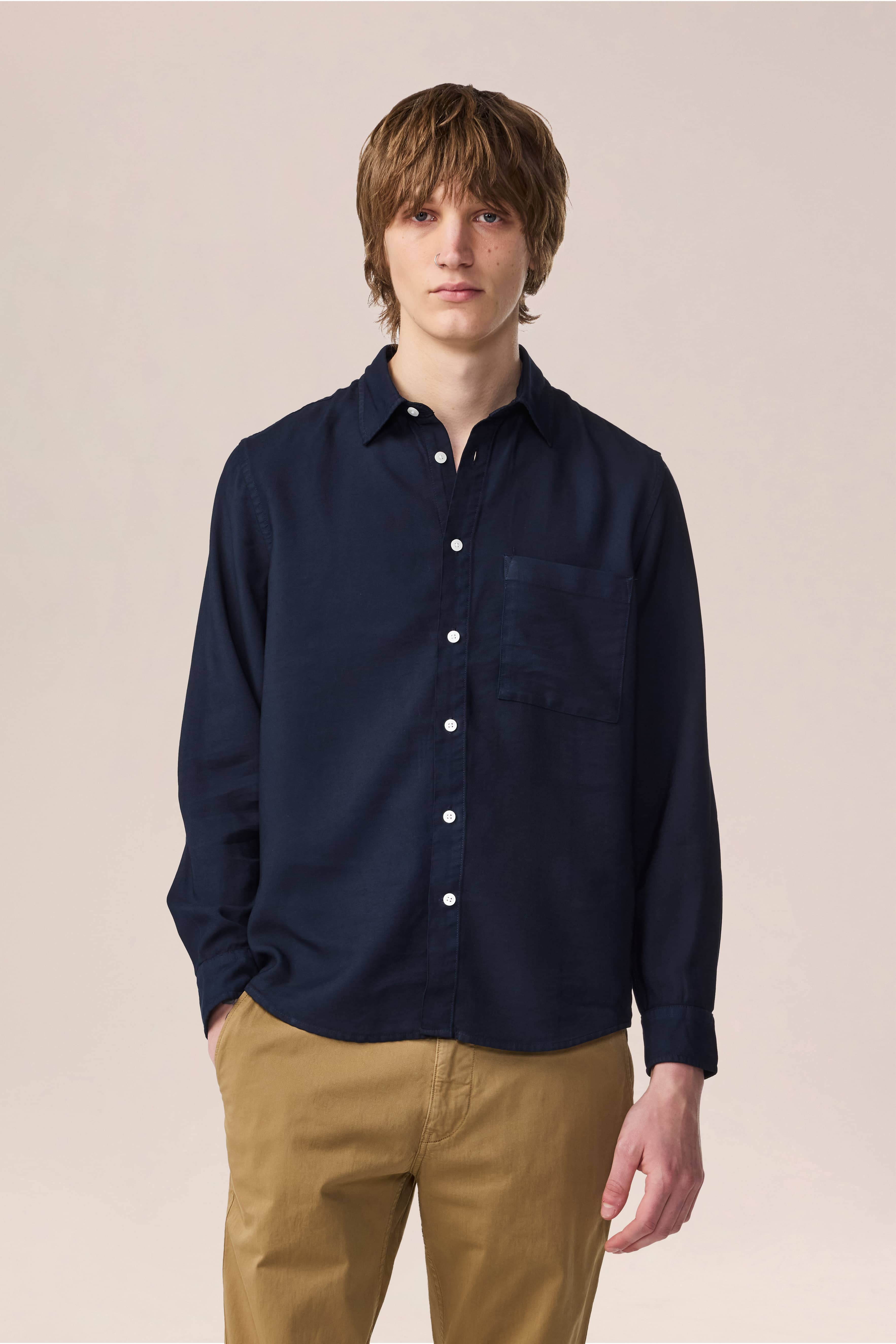 Langærmet button-down skjorte fremstillet i skinnende, LENZING™ ECOVERO™ viskose stoffarvet twill. Udstyret med knapper i perlemor.