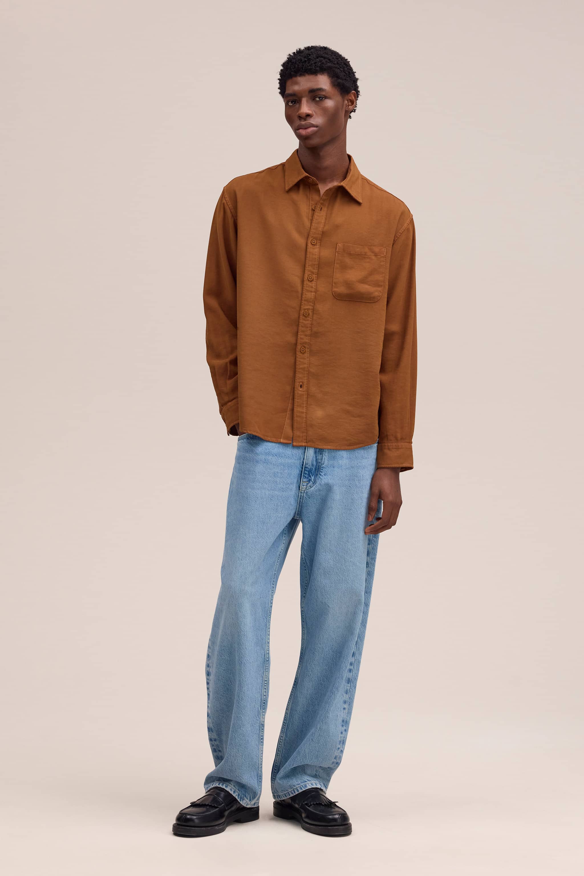 Skjorte i mellemtyk LENZING™ ECOVERO™ viskose-twill med regular fit. Stoffet føles blødt og glat med et elegant fald. Designet med bred stolpelukning, buet underkant og let sænkede skuldre. Enkelt påsyet brystlomme, farveafstemte NN.07-knapper og aftagelige kravestivere.