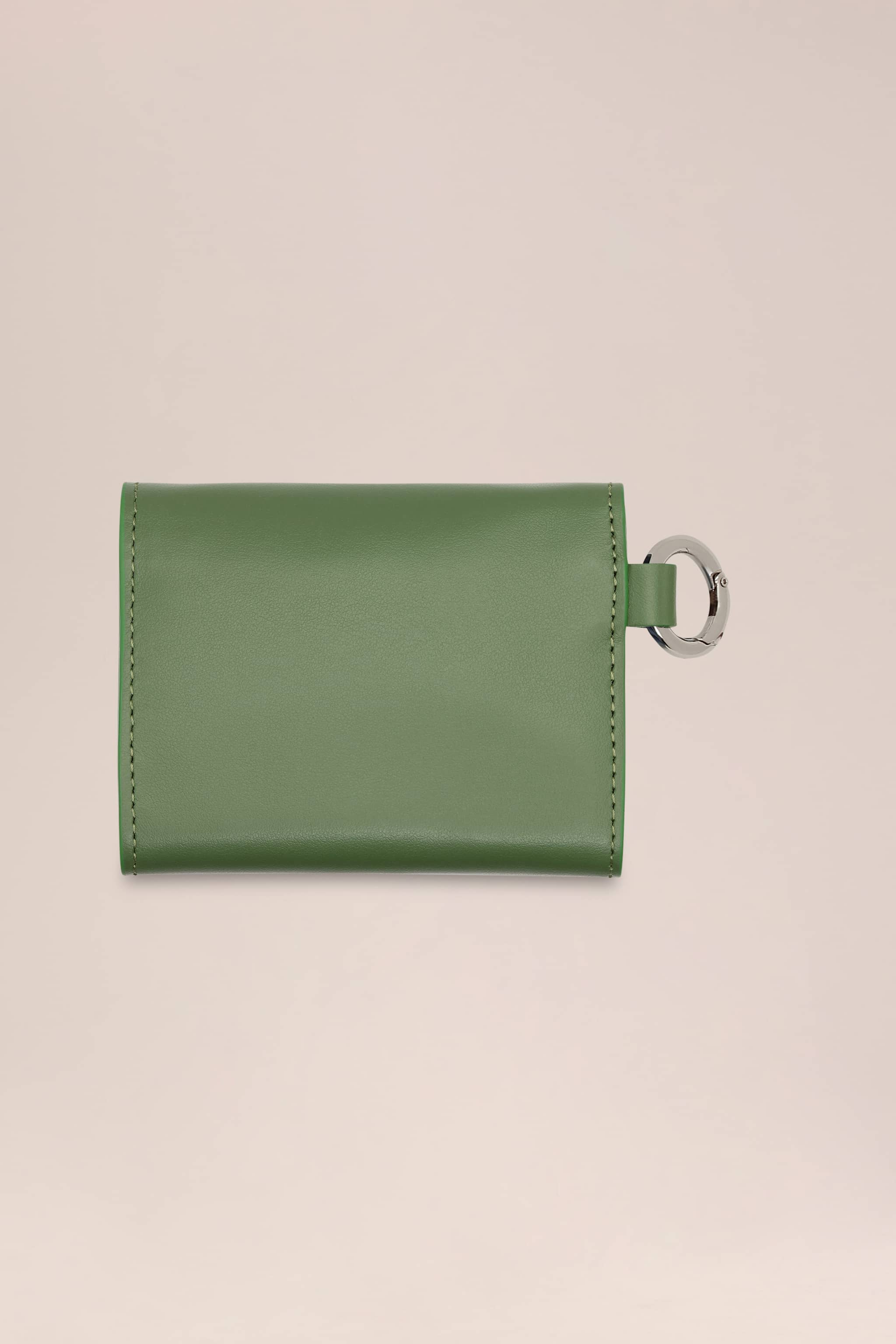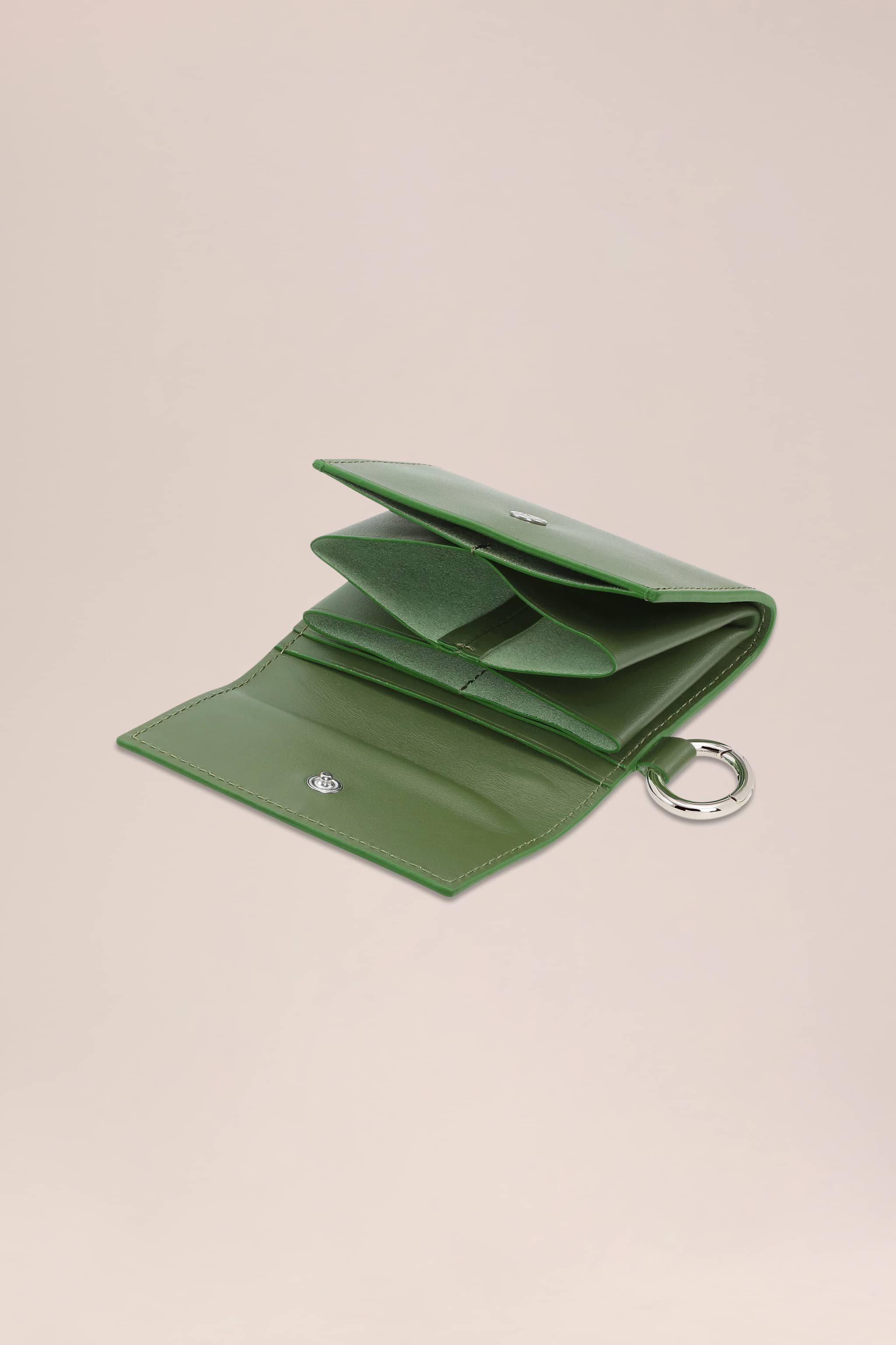 Pung i nervet læder med blød, glat håndfornemmelse i et kompakt, foldbart design. Indersiden er foldet, så du får tre kortlommer samt to ekstra slots, og den lukkes sikkert med trykknap. Broderet blomsterdetalje og karabinkrog til nem fastgørelse på taske eller bælte.