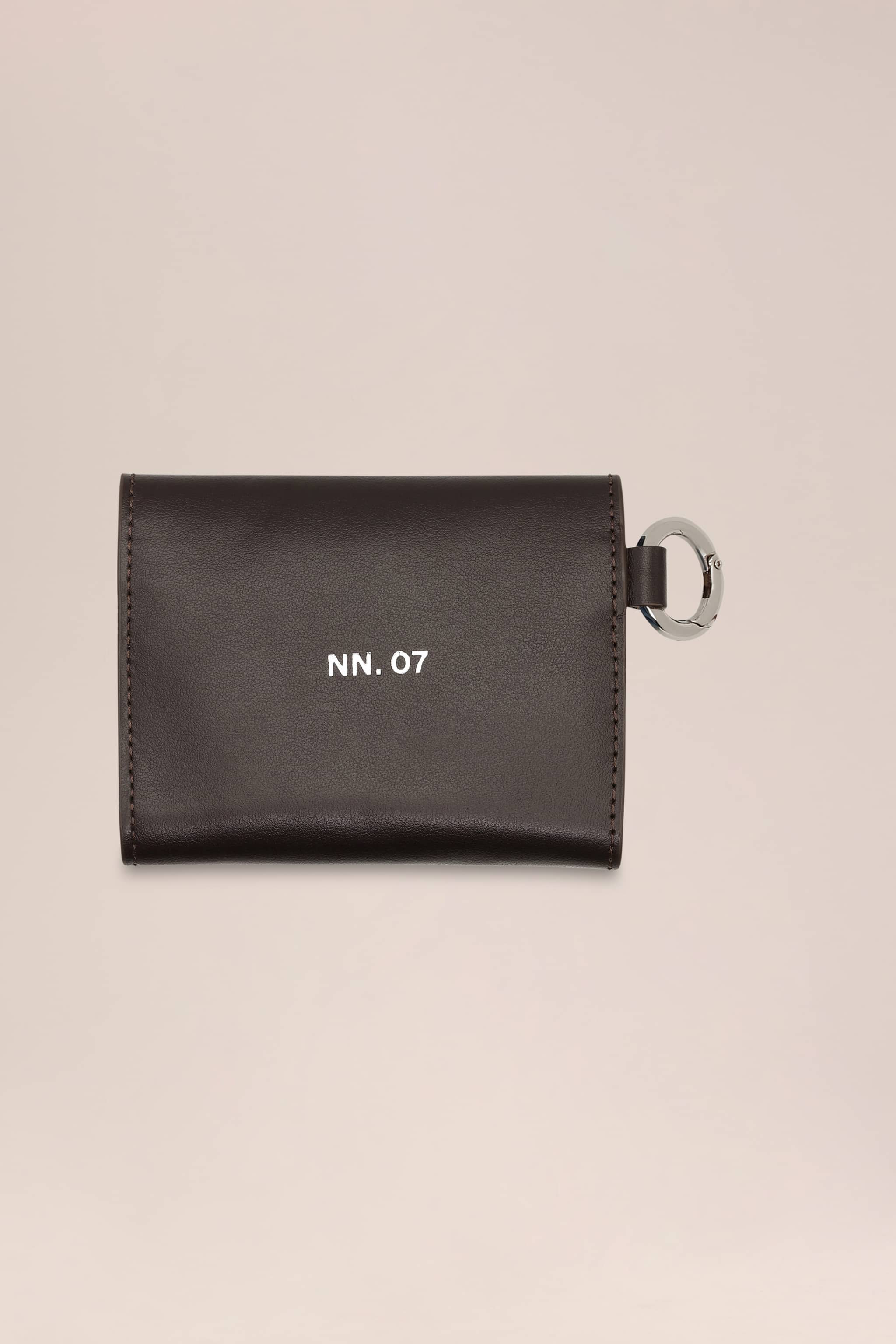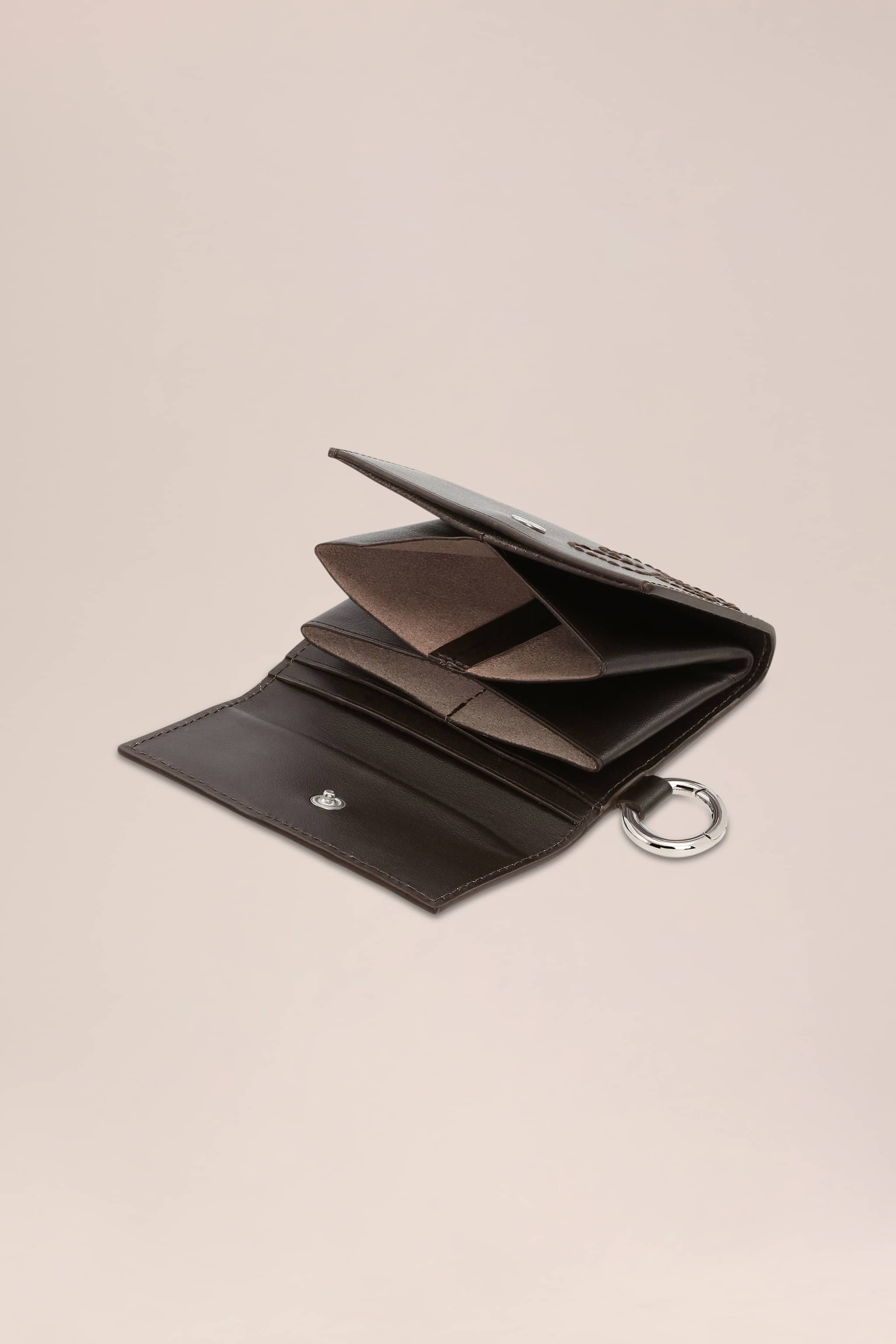 Pung i nervet læder med blød, glat håndfornemmelse i et kompakt, foldbart design. Indersiden er foldet, så du får tre kortlommer samt to ekstra slots, og den lukkes sikkert med trykknap. Broderet blomsterdetalje og karabinkrog til nem fastgørelse på taske eller bælte.