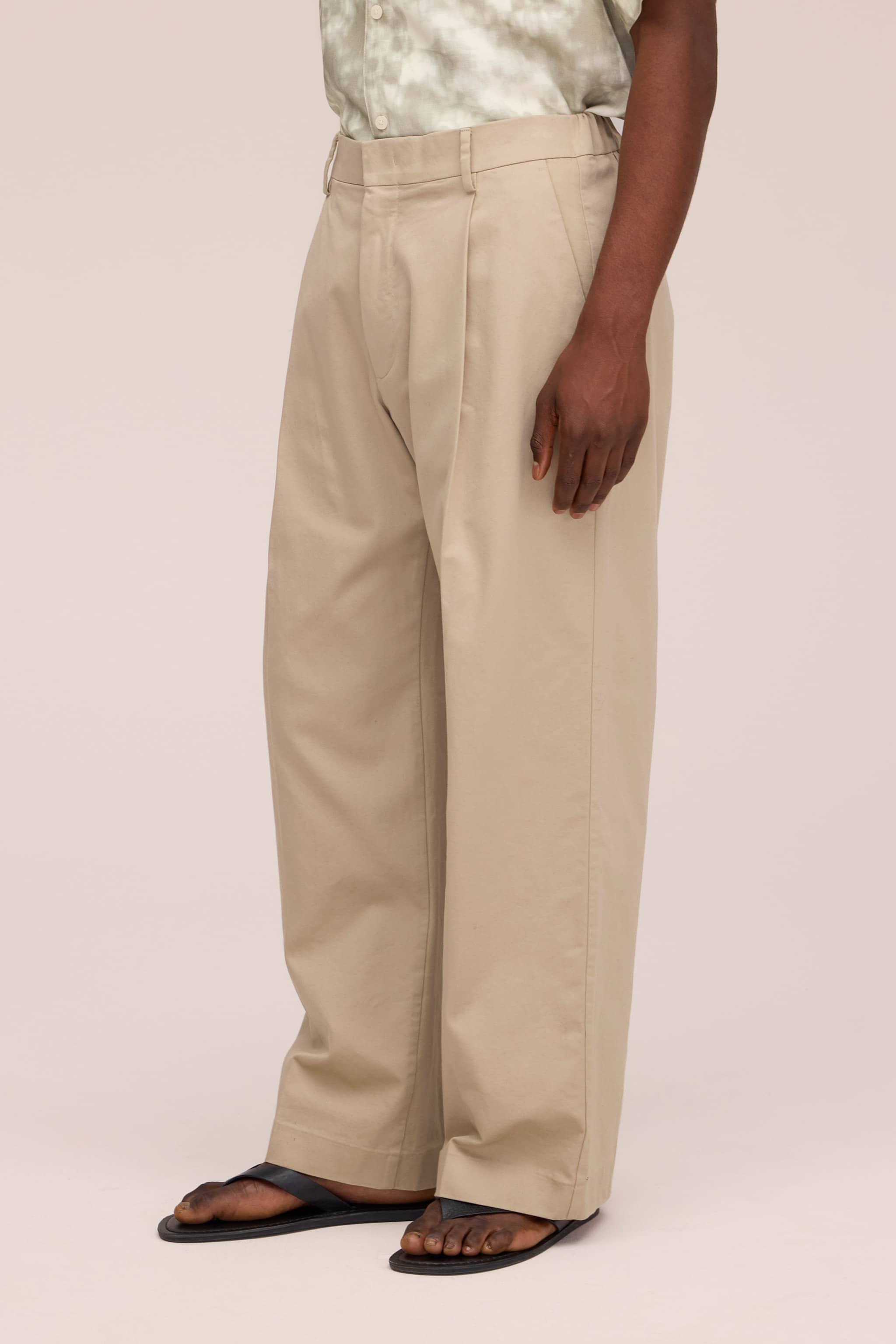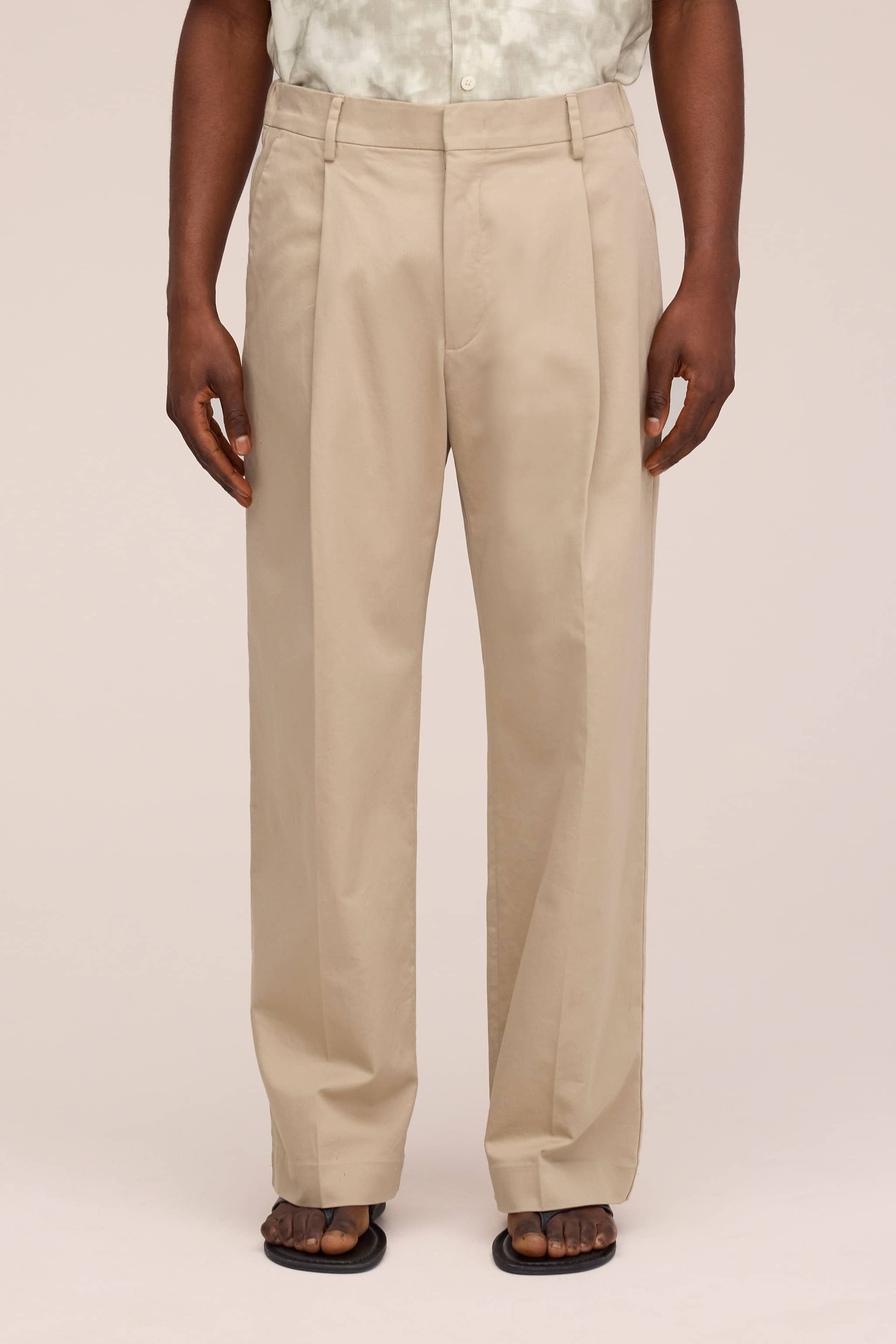Relaxed fit bukser med plisseringer fremstillet af blød økologisk, 250 g/m² bomuld med glansfuld satin-finish. Designet med dobbelte plisseringer foran og hook and bar-lukning, og byder på en blød, men skarp håndfornemmelse.