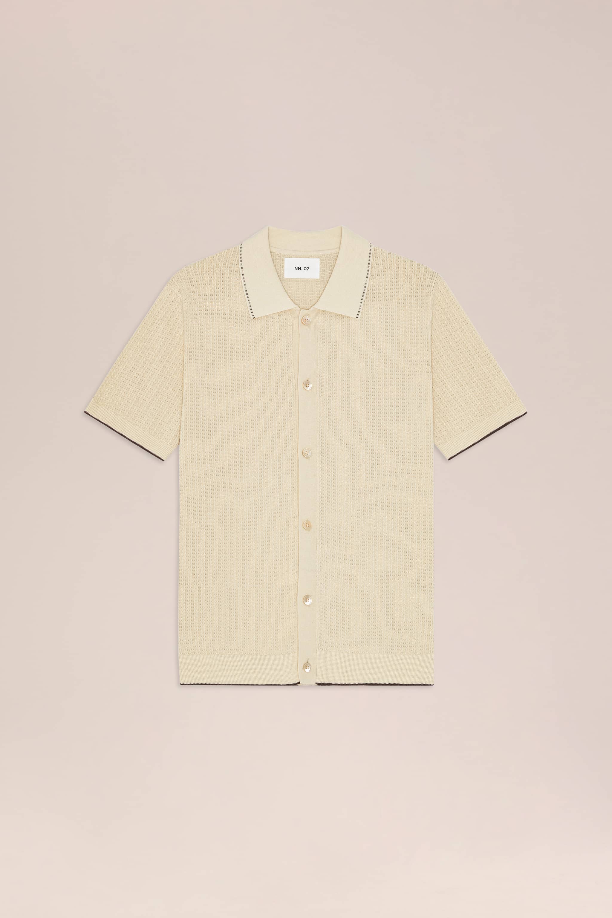 Regular fit bomuldspolo, strikket i en let, sprød og tekstureret struktur med kontrastdetaljer. Afsluttet med en ren stolpe og enkle corozo-knapper, der giver et raffineret, afslappet udtryk.