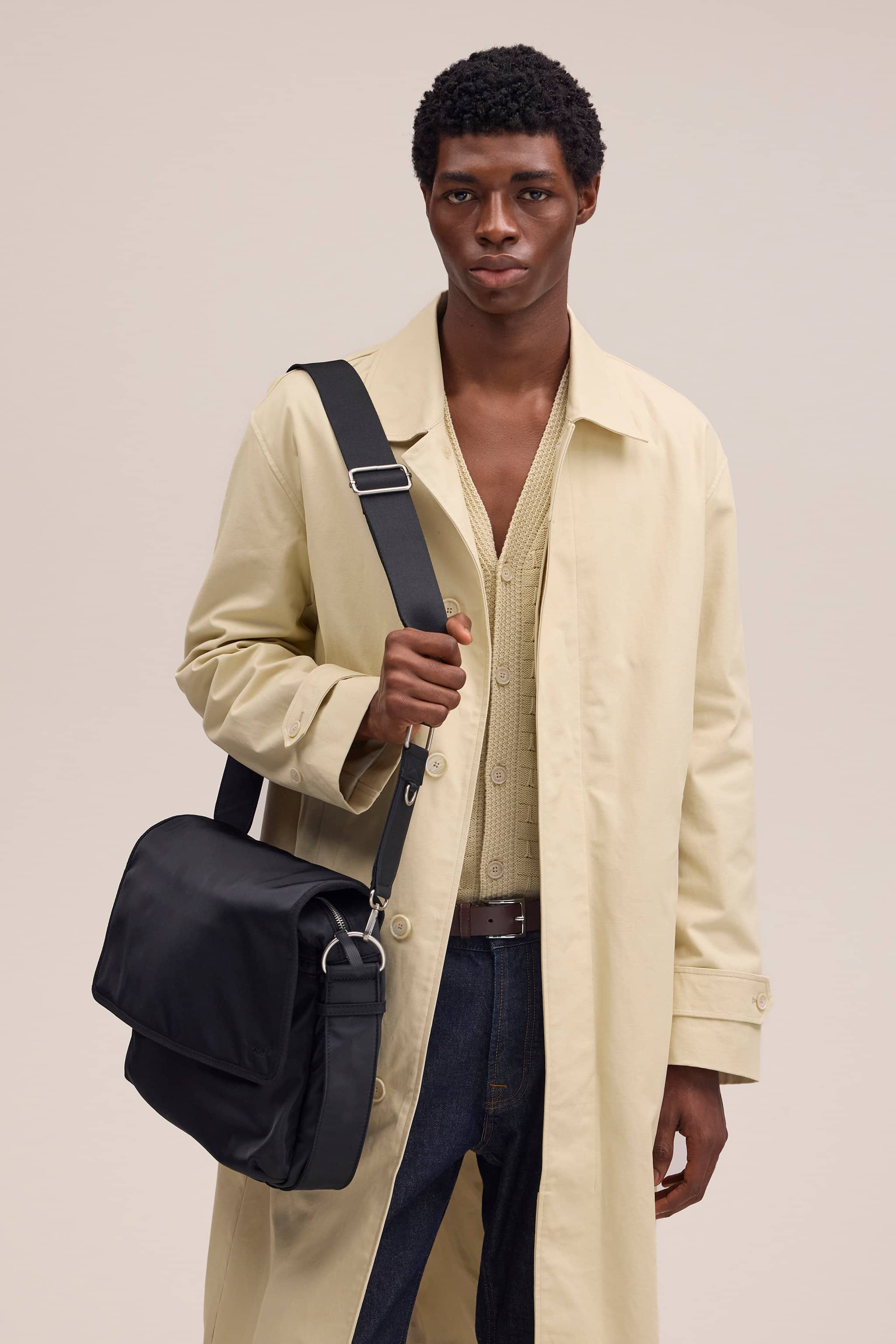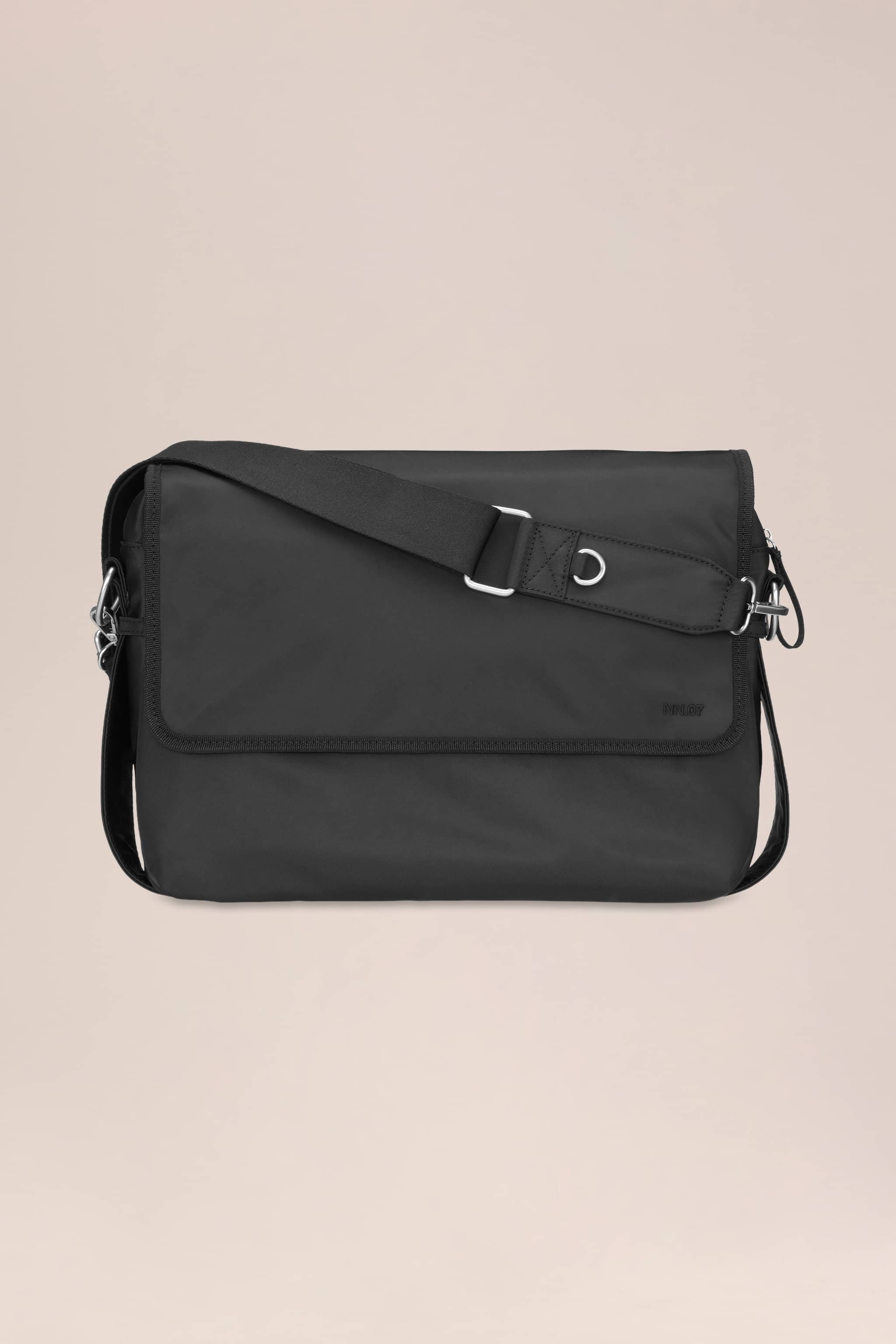 Utility-skuldertaske fremstillet af glat, genanvendt polyester med en sprød håndfornemmelse. Har et rummeligt hovedrum med laptopbeskyttelse og organiseringslommer samt en baglomme med magnetlukning til ekstra opbevaring. Afsluttet med justerbar, aftagelig rem og indvendig nøglering for ekstra funktionalitet.