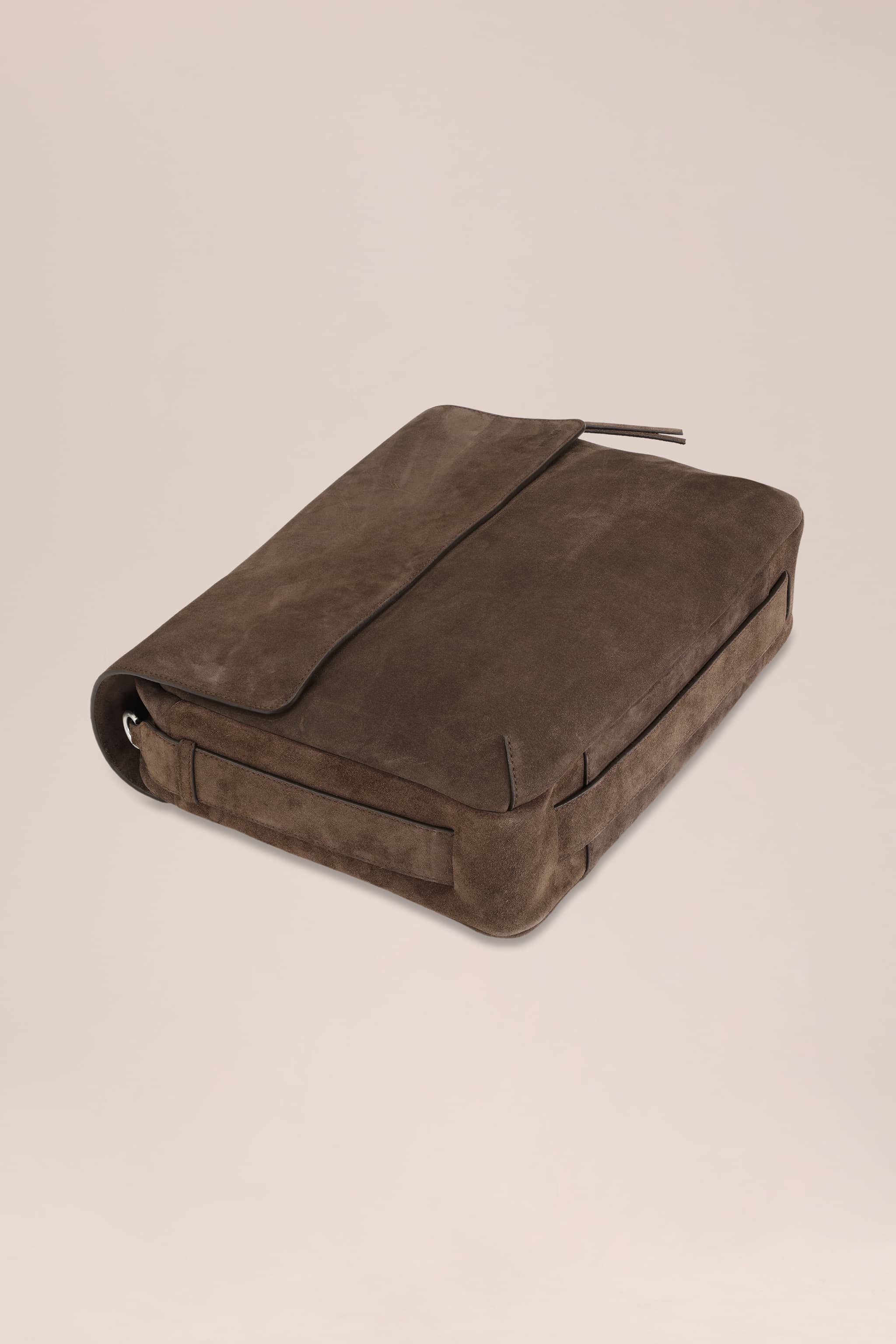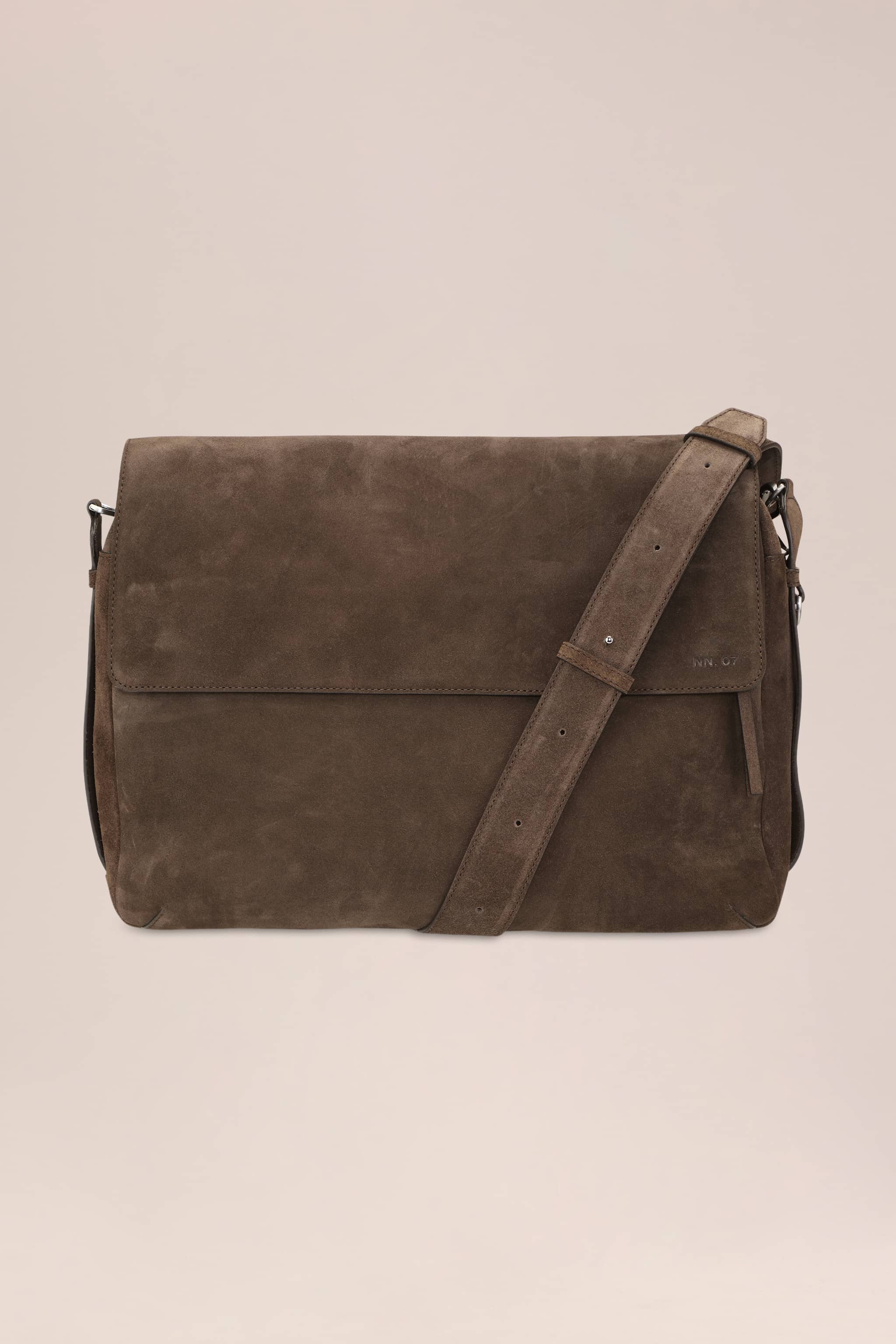Utility-satchel fremstillet af blødt, men slidstærkt ruskind med glat læderrem og bæltedetaljer. Har et rummeligt hovedrum med plads til en laptop, polstret indvendig lomme til sikker opbevaring og en praktisk indvendig metalring til nøgler. Komplet med frontlomme med lynlås og baglomme med lynlås for organiseret adgang.