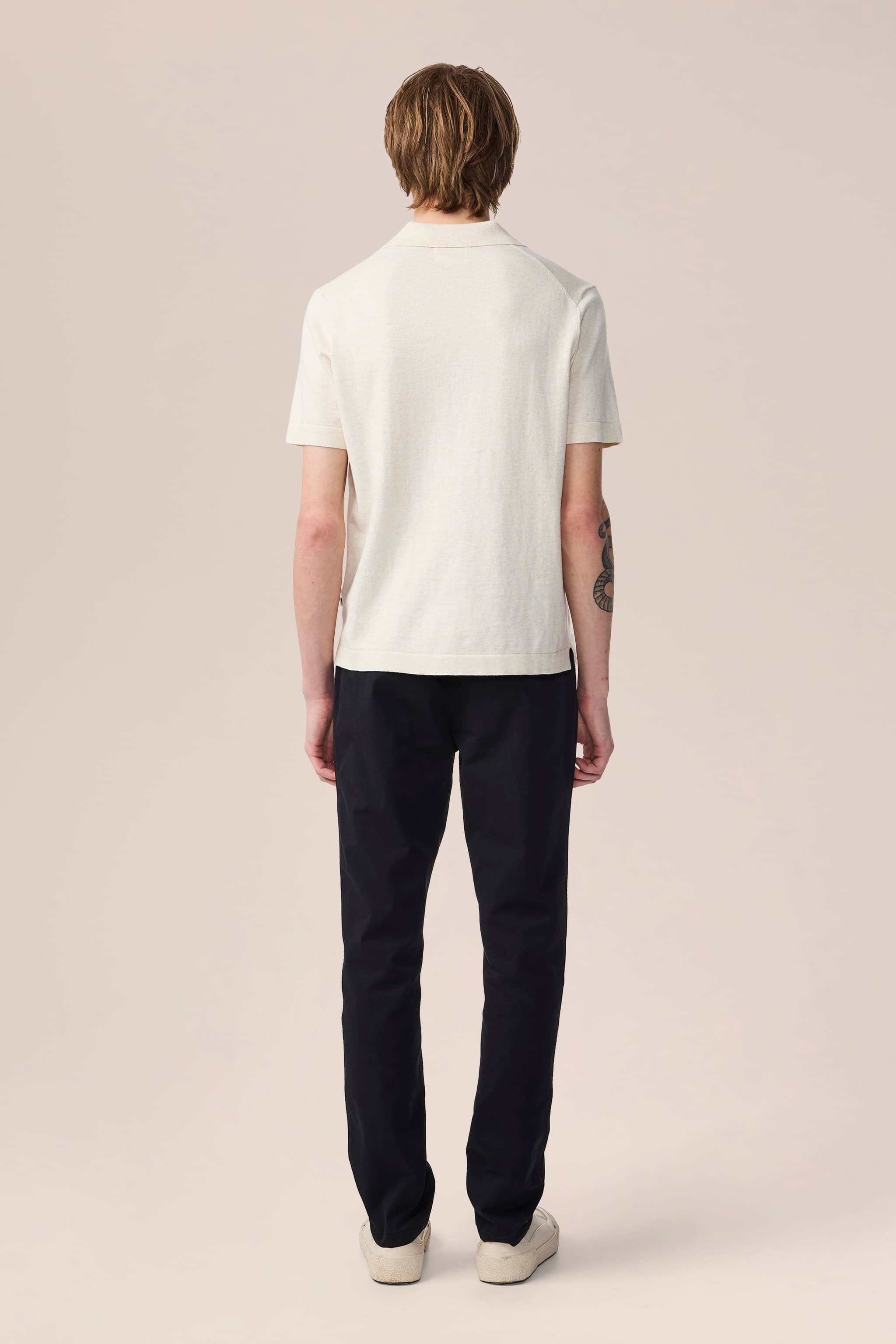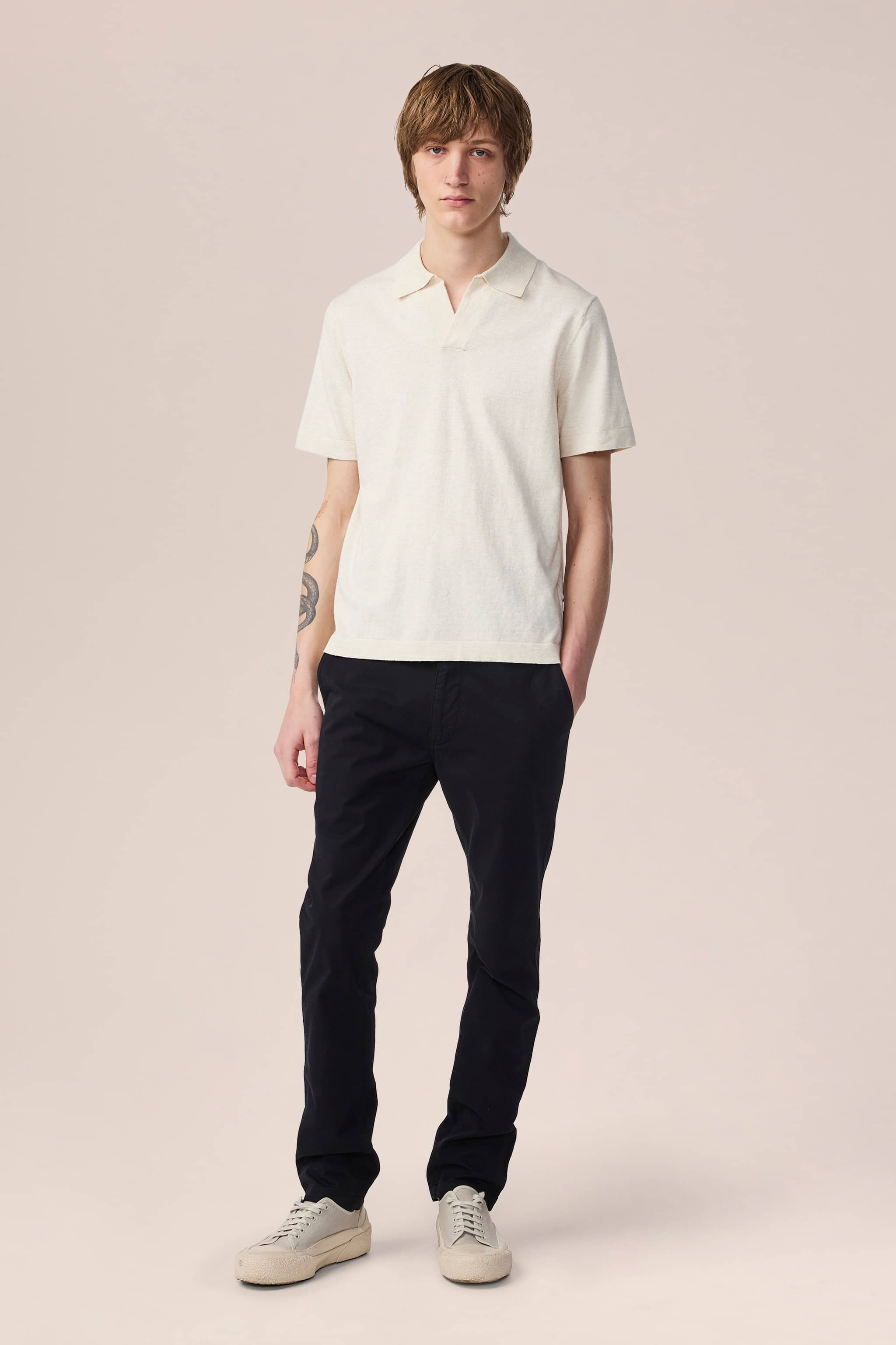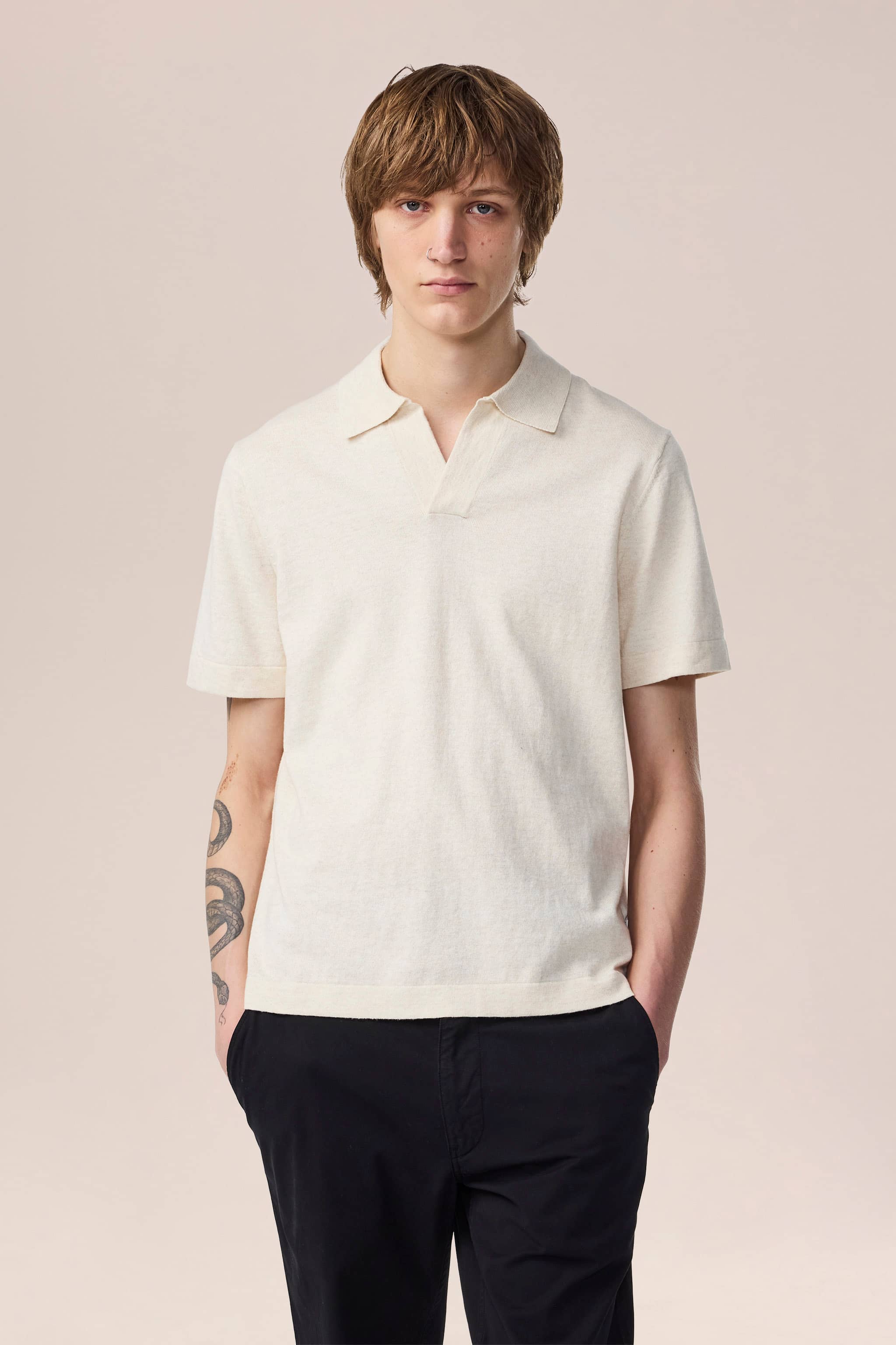 Kortærmet polo med åben hals, fremstillet i et let bomuldsstof. Strikket i en enkel jersey-stikning med et tekstureret garn.