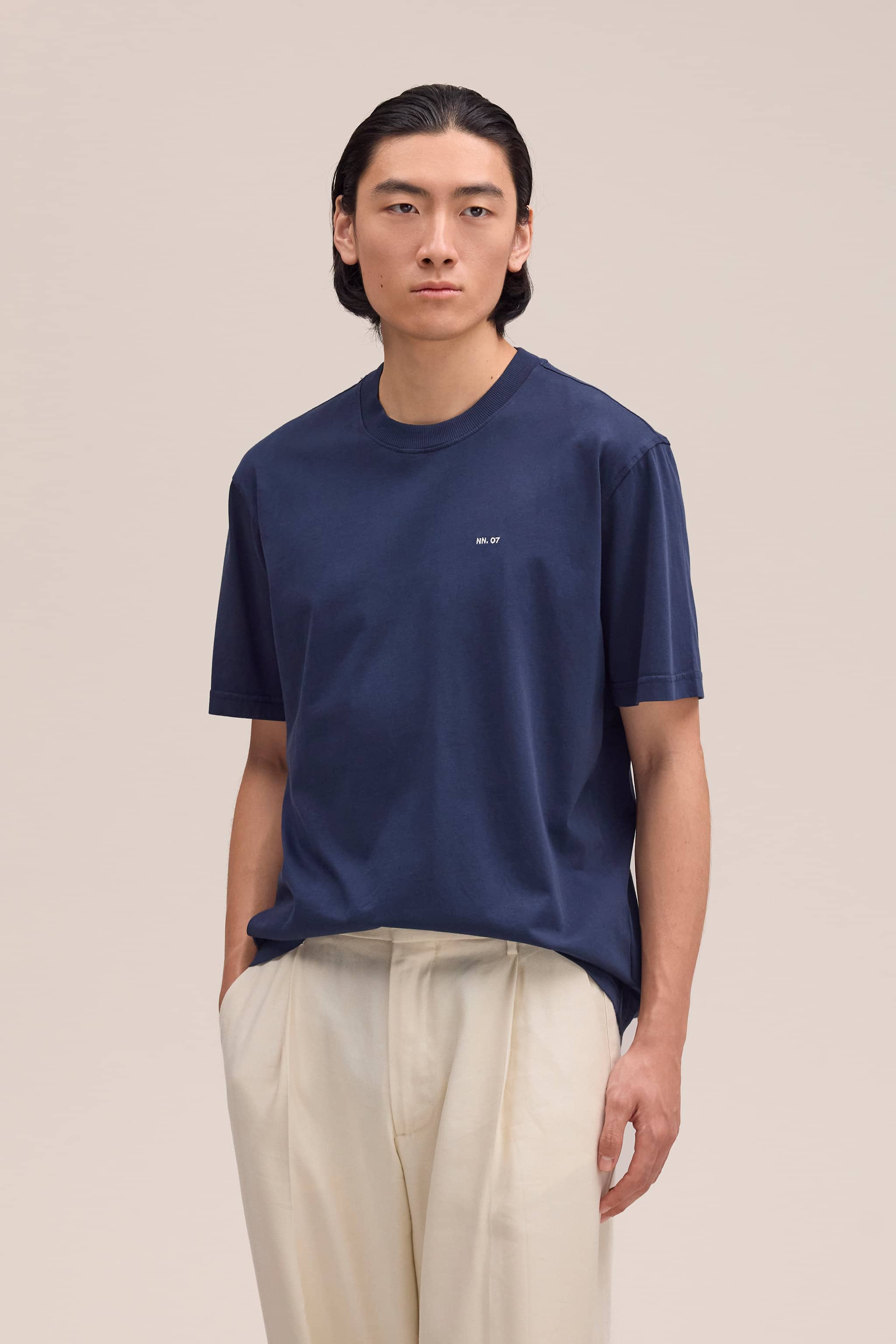 T-Shirt aus zartem Pima-Baumwolljersey mit NN.07-Logo. Abgerundet durch Zwillingsnadel-Steppnähte und gerippte Details am Halsausschnitt.