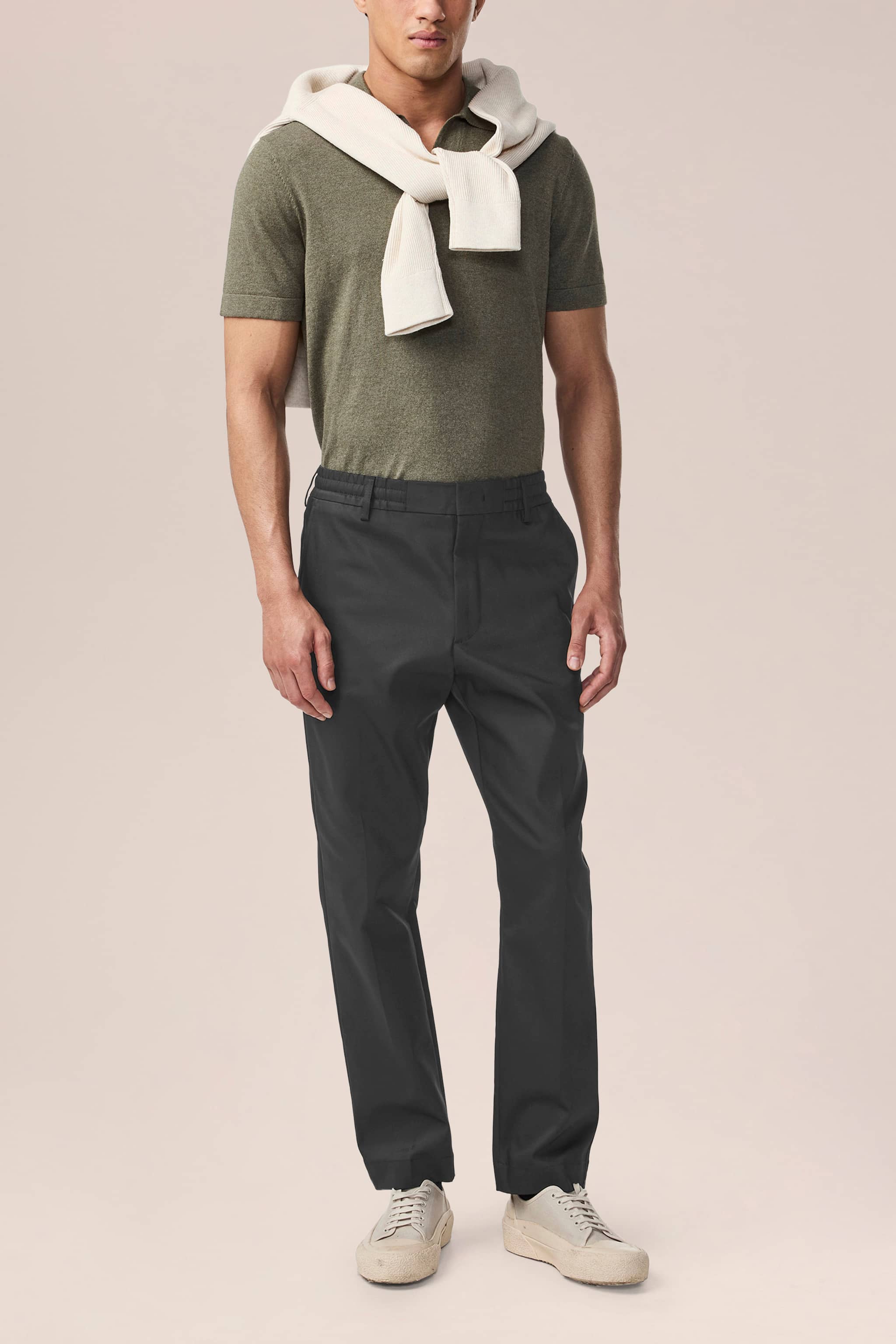 Eine Hose im Regular Fit mit schmal zulaufendem Bein, gefertigt aus einem leichten 230 g/m² Baumwoll-Twill-Mix mit etwas Stretch für zusätzlichen Komfort. Die Hose hat einen Kordelzugverschluss, einen elastischen Bund und ist mit Bügelfalten sowie einem Reißverschluss versehen.