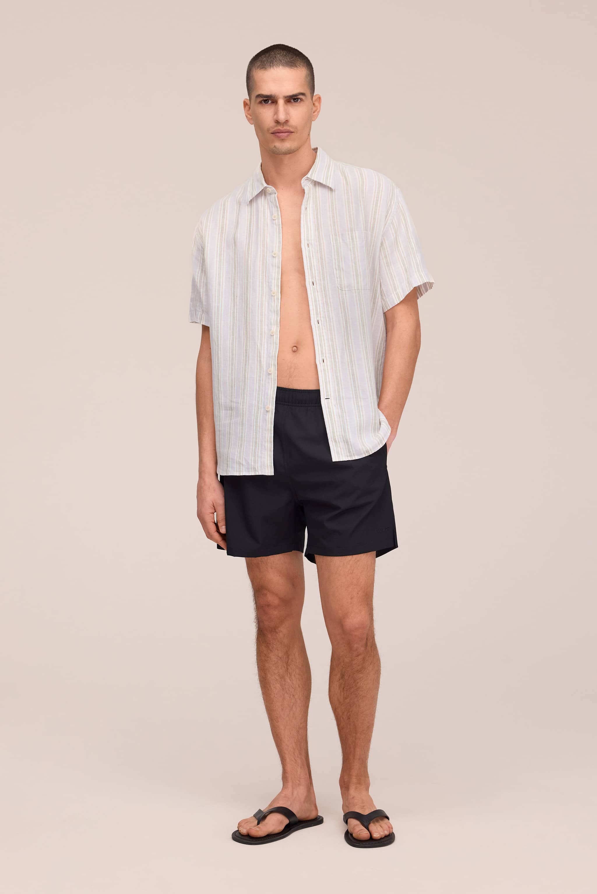 Lässige Chino-Shorts aus strapazierfähigem europäischem Leinen mit griffiger, trockener Haptik.