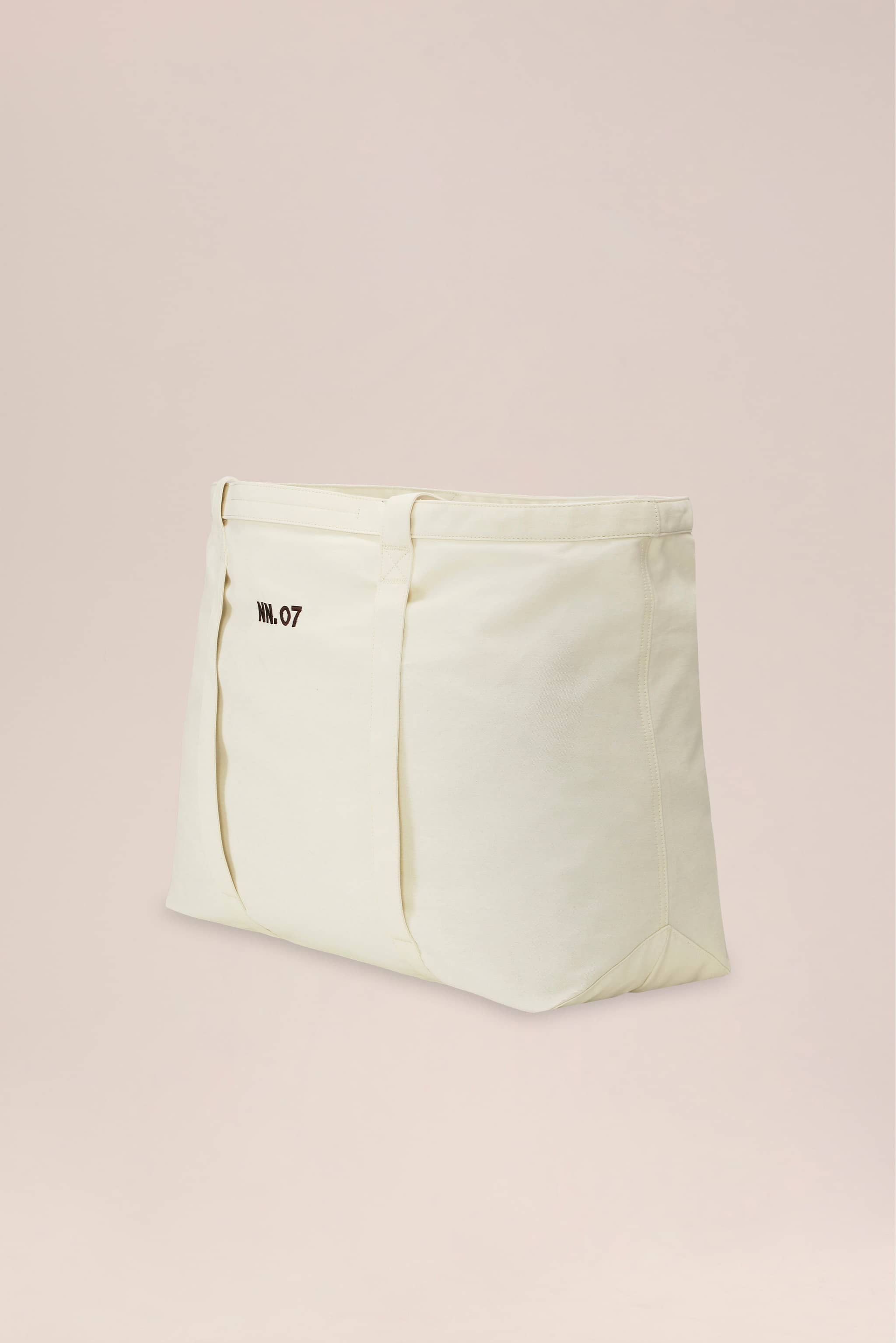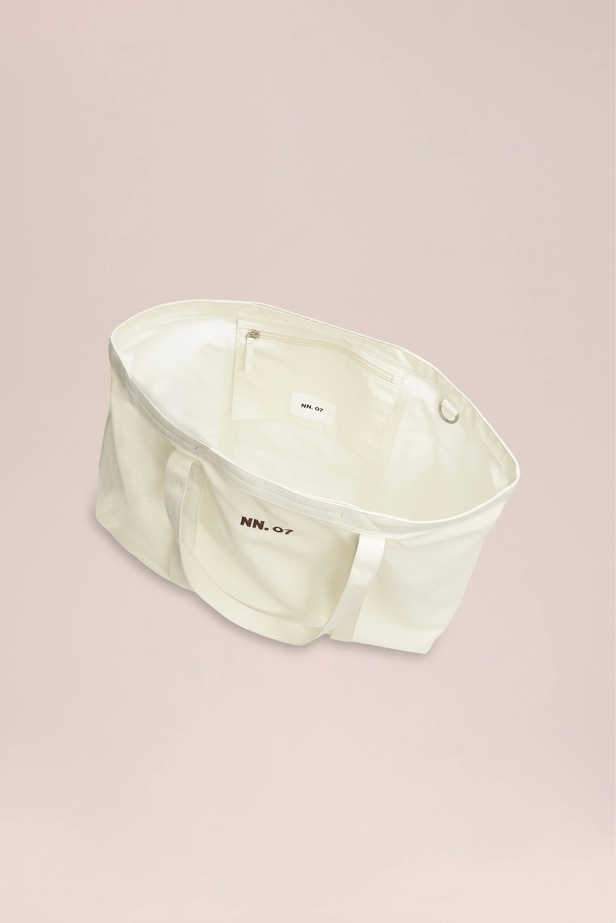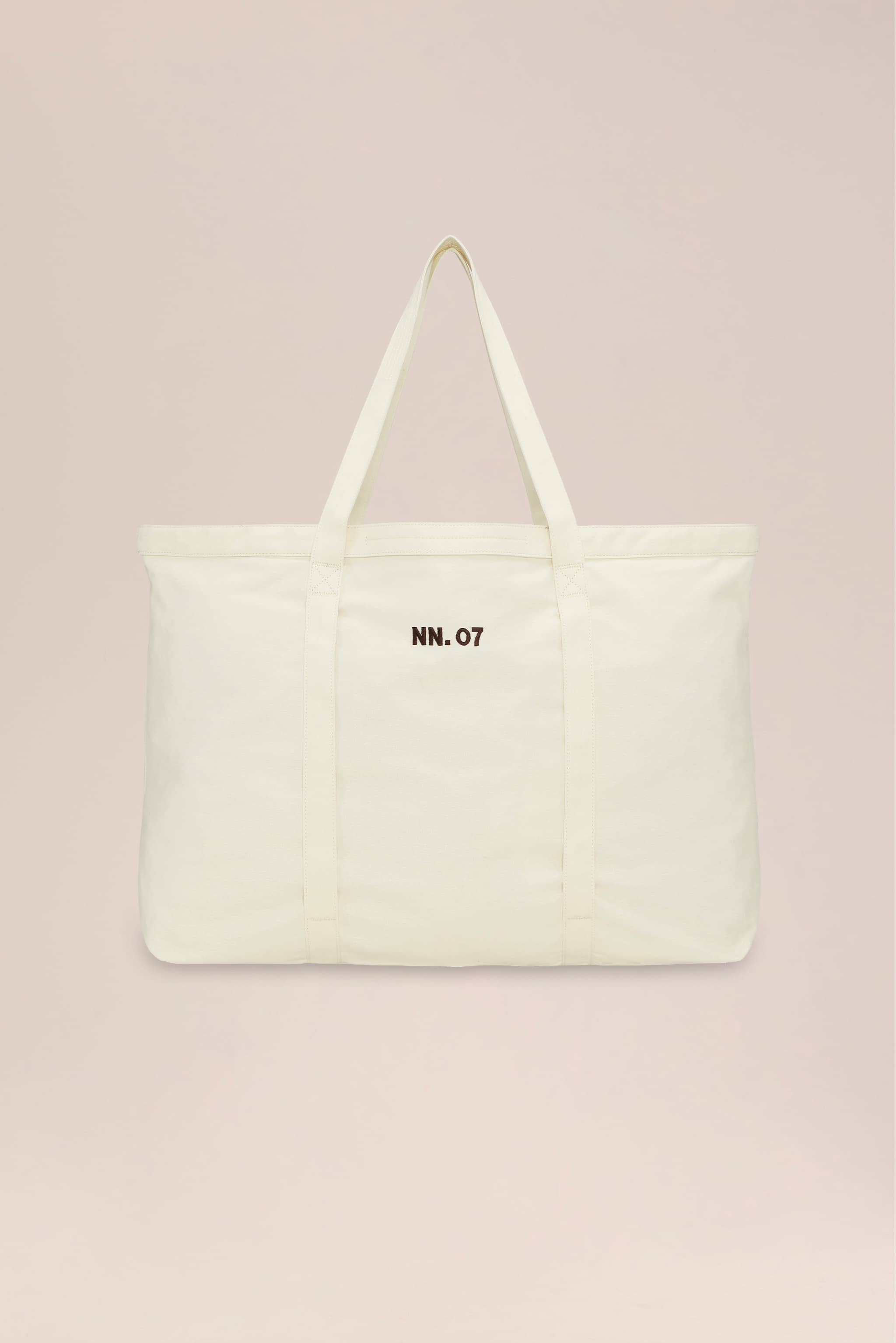 Geräumiger Tote-Bag aus leichter, gebürsteter Baumwolle mit weicher, eingetragen wirkender Haptik. Hauptfach mit innenliegender Reißverschlusstasche, Schlüsselschlaufe, rückseitiger Stecktasche und Frontgurt für Strandtücher. Zwei Trageoptionen mit langen Schulterriemen und kurzem Henkel; vorn mit gesticktem NN.07-Logo.