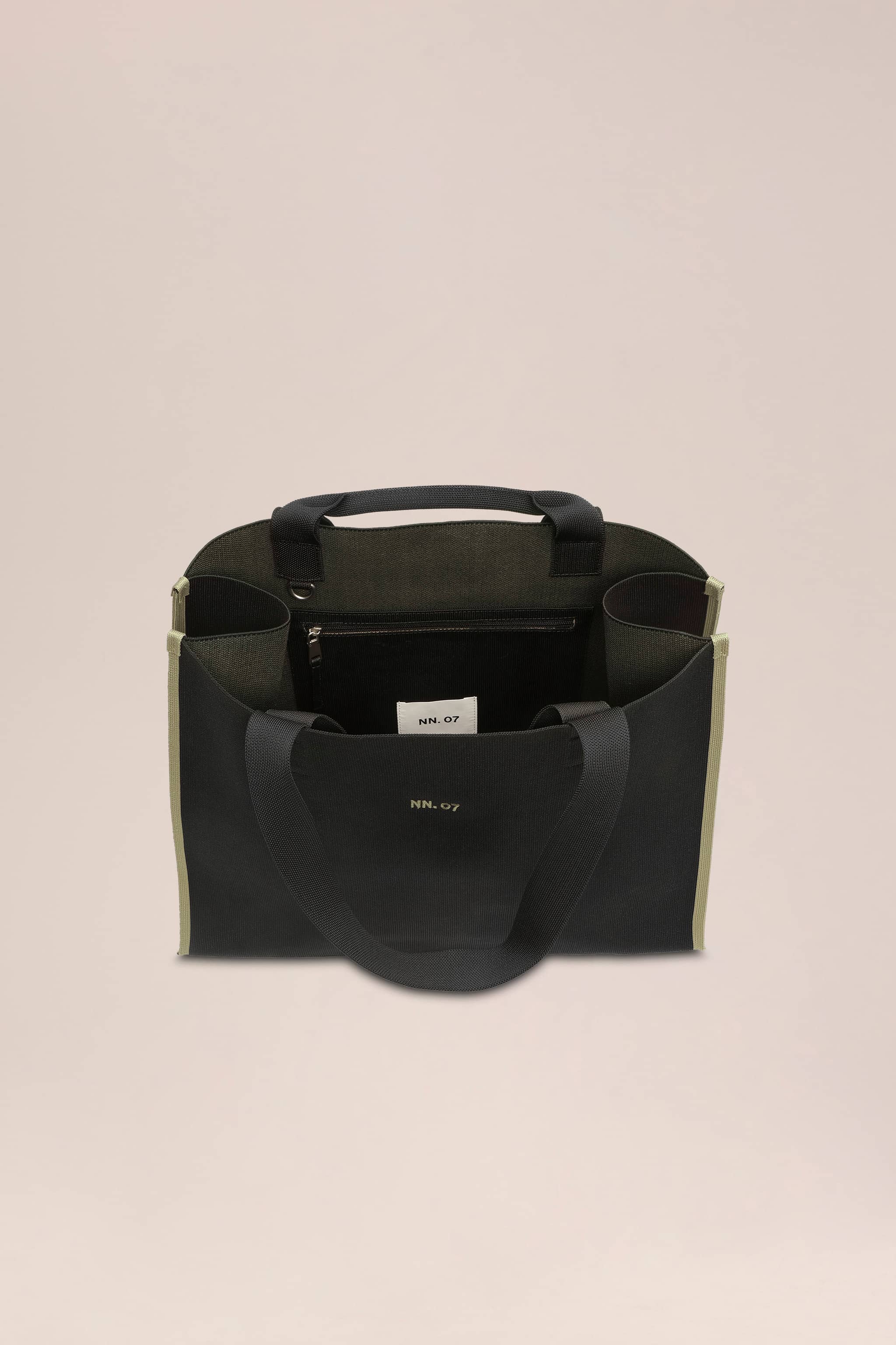 Geräumige, rechteckige Tote-Bag aus recyceltem Polyester in einem Interlock-Gewebe mit weicher, zugleich strukturierter Haptik. Einzelfach-Design mit innenliegender Reißverschlusstasche, D-Ring und Schlüsselschlaufe für funktionalen Alltagseinsatz. Mit Schulterriemen und kurzen Henkeln für vielseitige Tragemöglichkeiten.