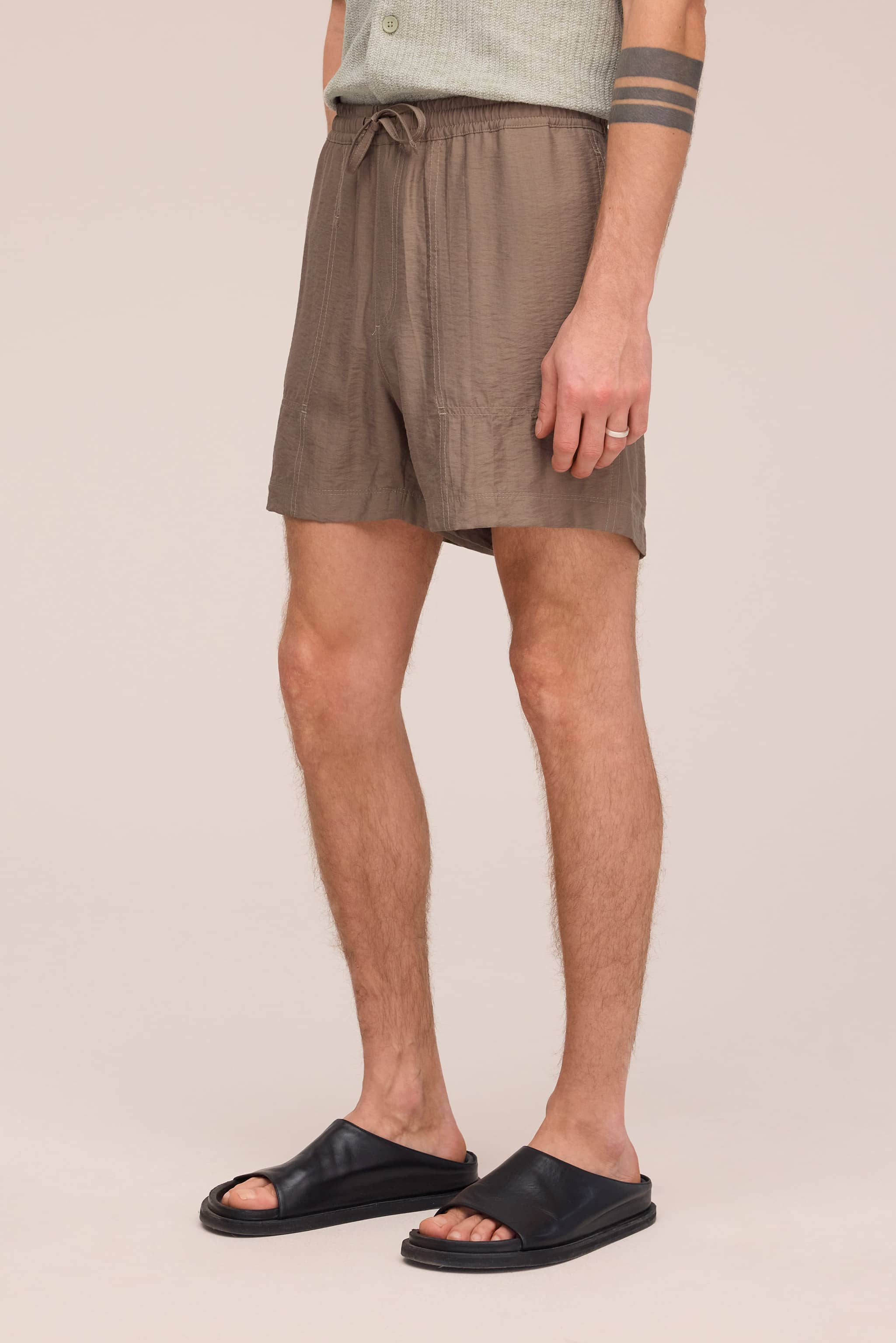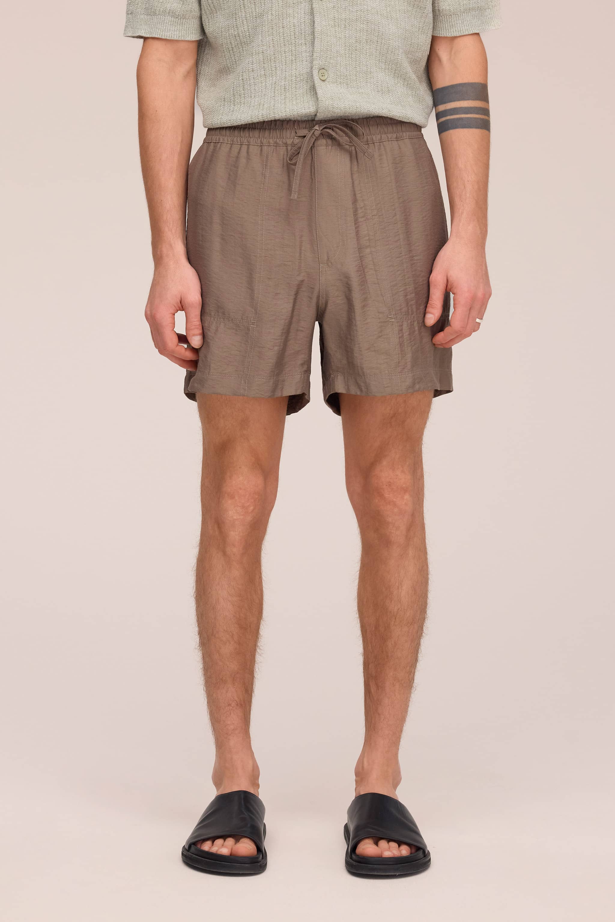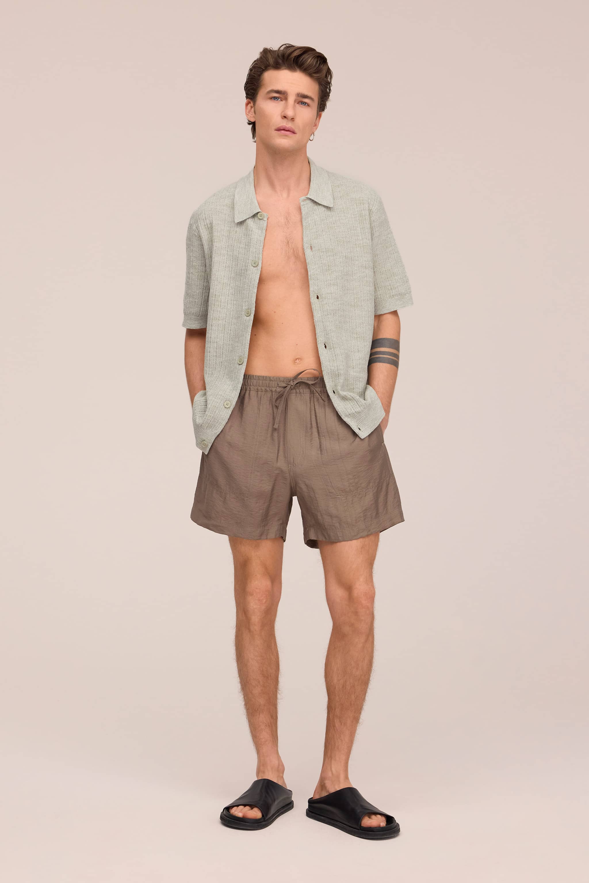 Shorts aus TENCEL™ Modalblend mit Knitter-Finish. Mit einem Stretch-Taillenbund samt Zugband-Verschluss, sowie in den seitlichen Nähten versteckte Taschen.
