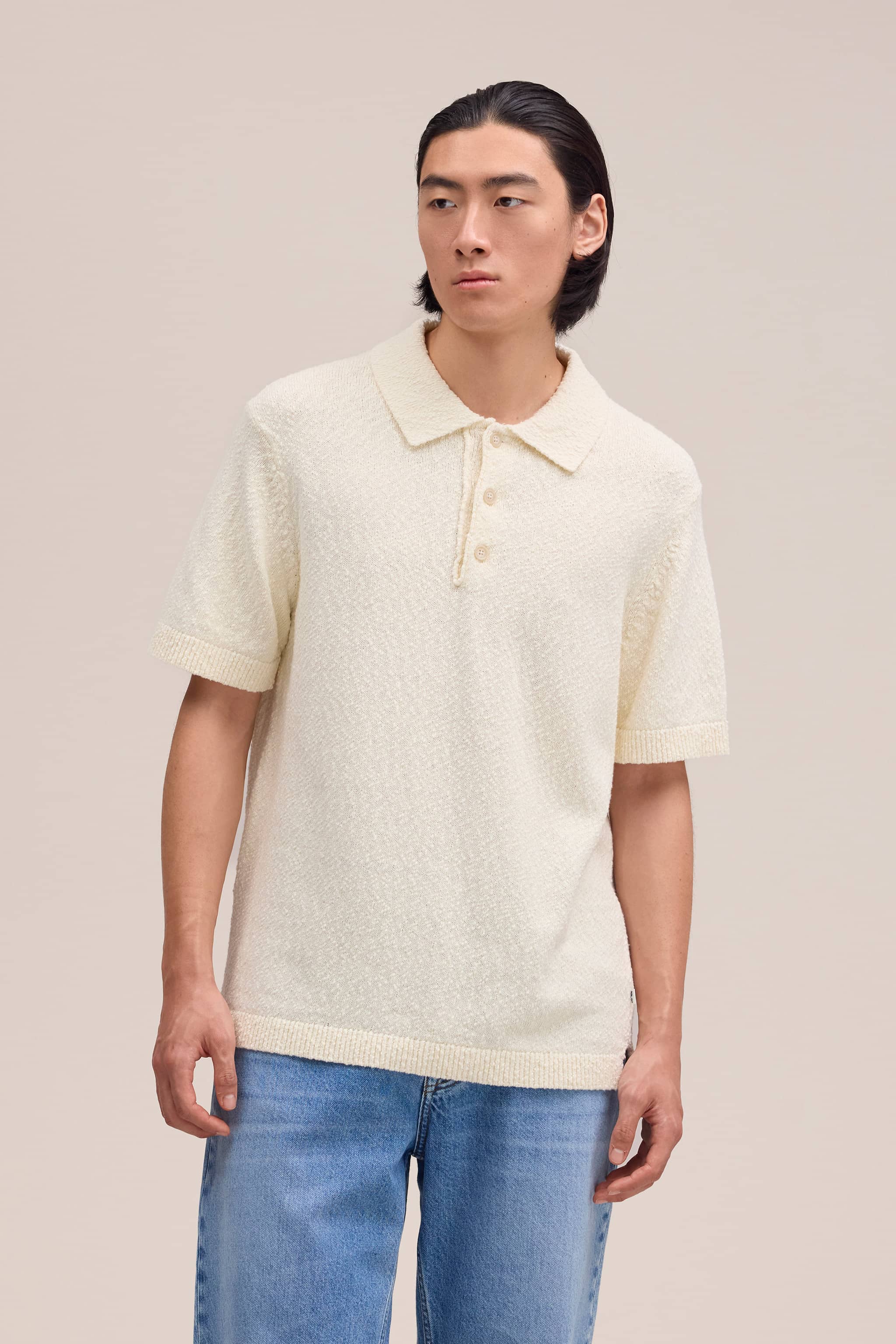 Bouclé-Polohemd aus weicher Baumwolle, veredelt mit Perlmuttknöpfen und feinen Rippstrick-Details an Bündchen und Saum.