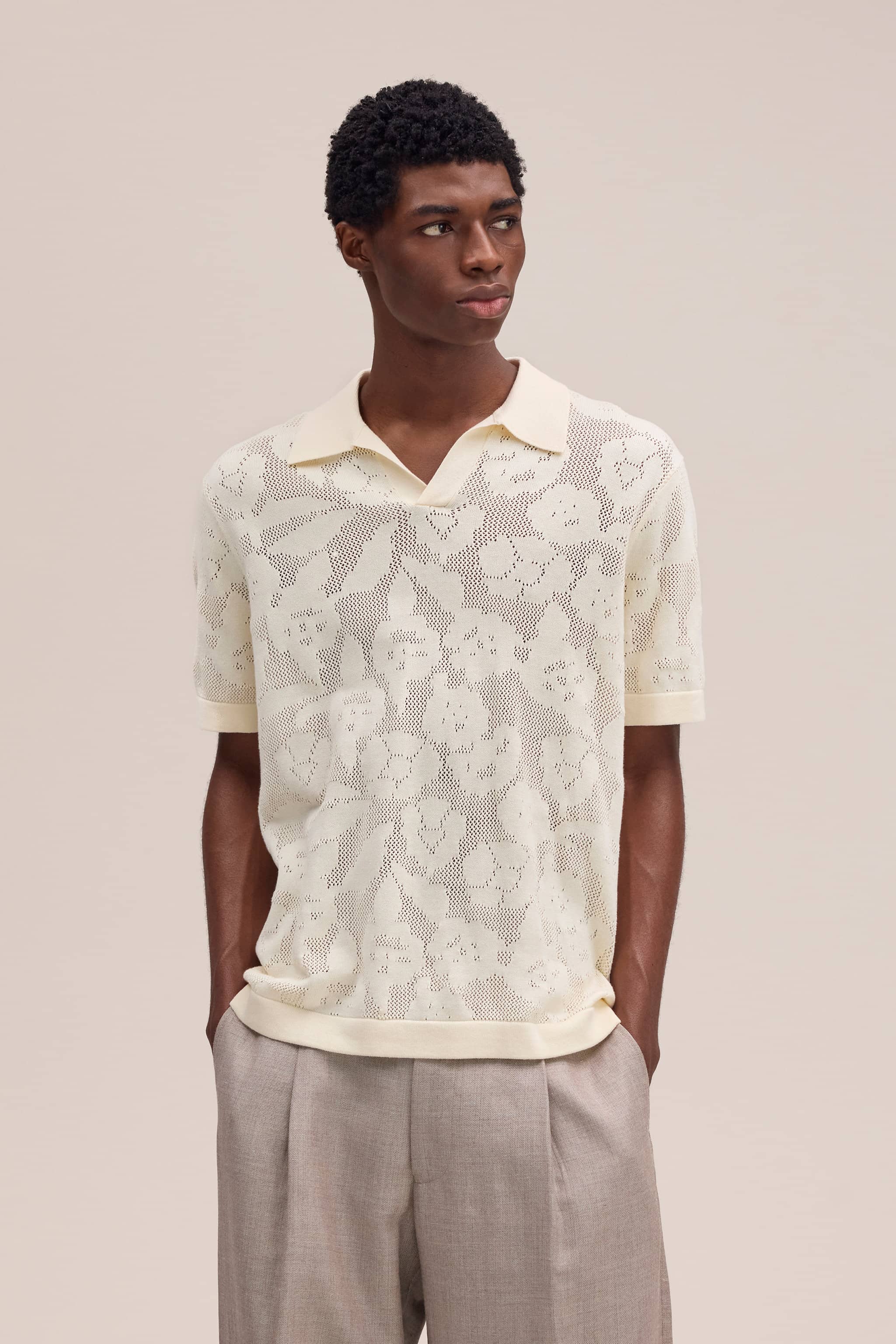 Leichtes Poloshirt mit V-Ausschnitt aus strukturiertem Ajourstrick, gefertigt in Italien.