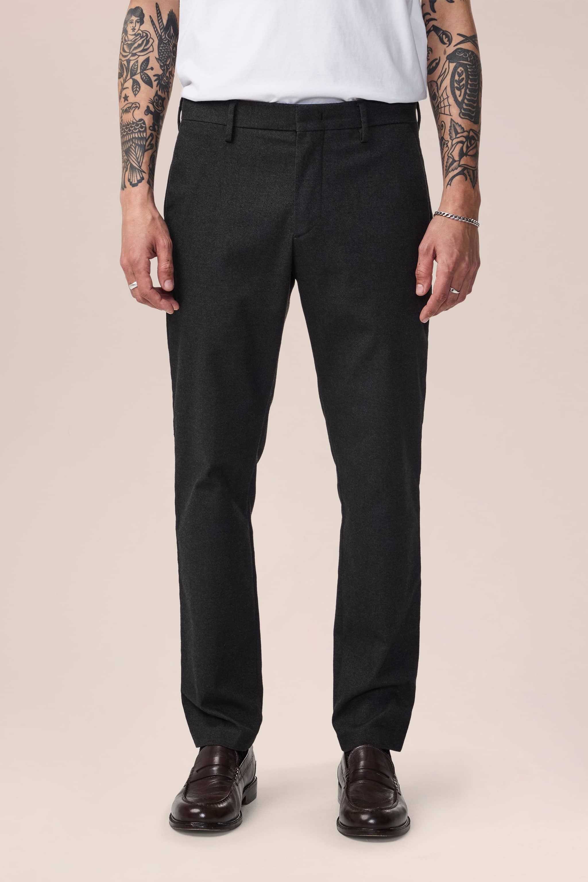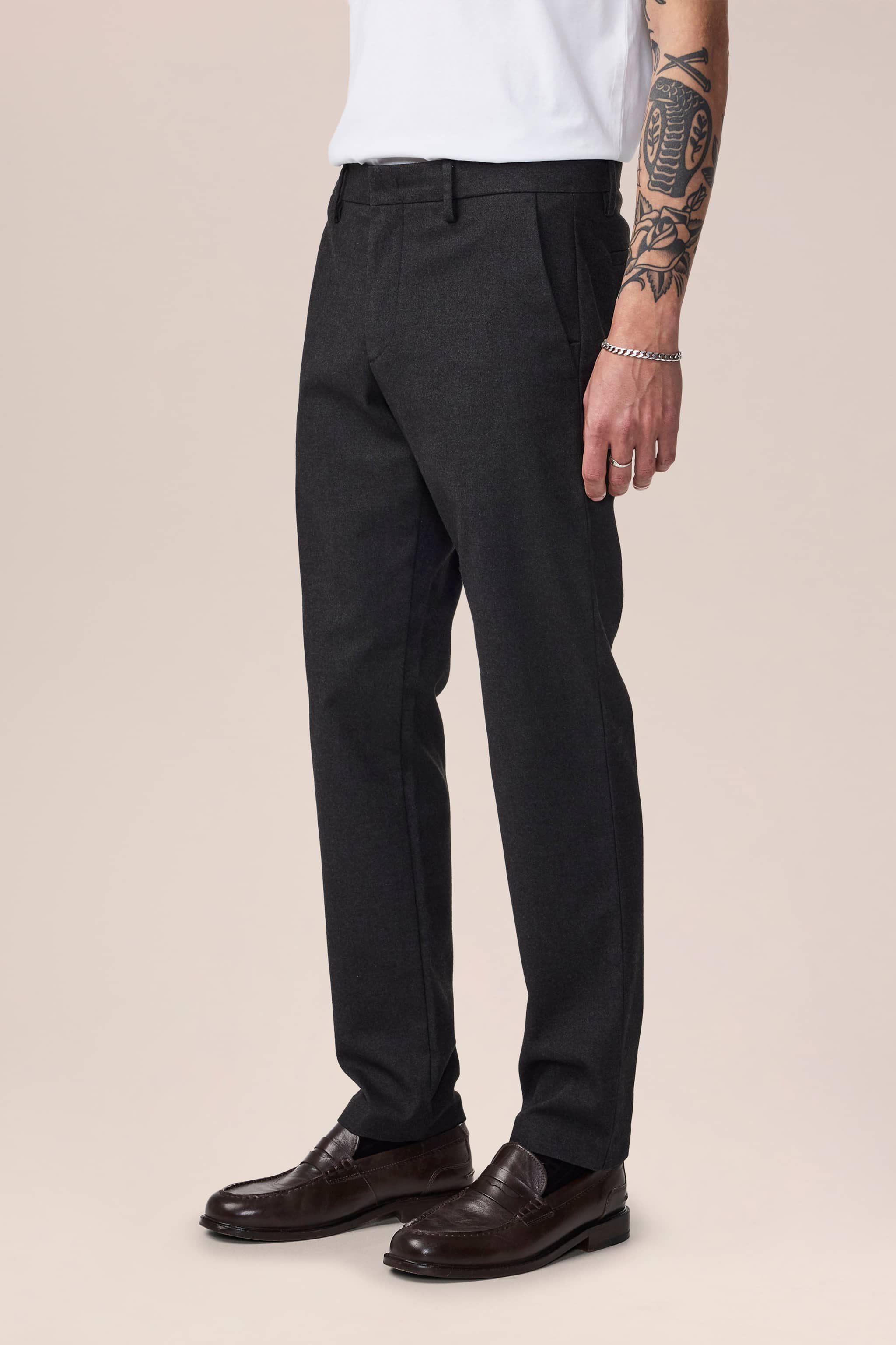 Slim Fit tailored Chinohose mit konisch zulaufendem Bein, gefertigt aus einem 279 g/m2 gebürsteten Baumwolltwill-Melange-Mix mit einer Bügelfalte und einem Blindsaum. Zu den eleganten Details gehören der Cobrax-Haken- und Ösenverschluss und die Pattentaschen.