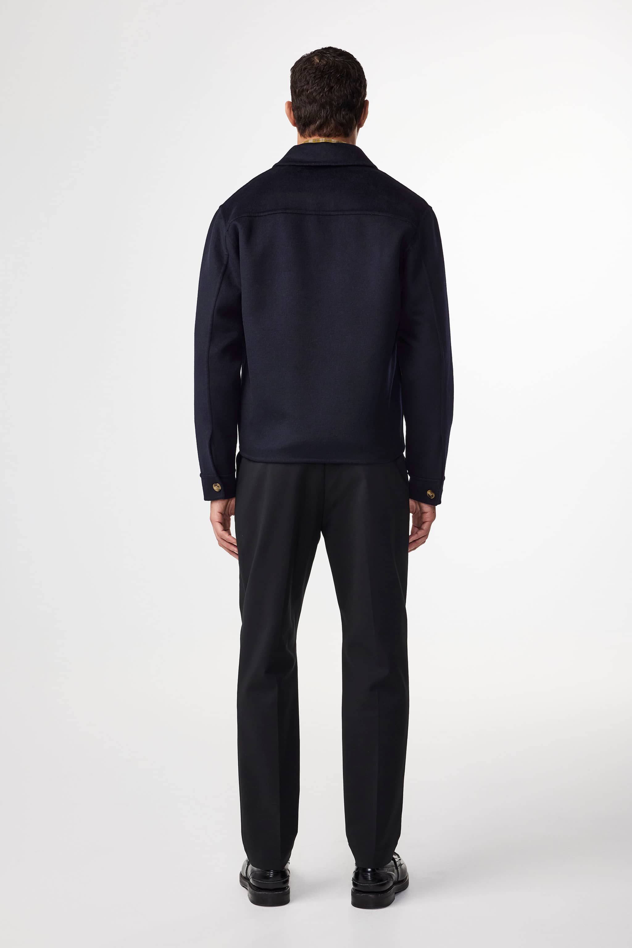 Brushed hip-length jacket crafted from a double faced wool-blend in a plain weave. Features two slanted chest pockets, faux horn buttons and a logo zipper.