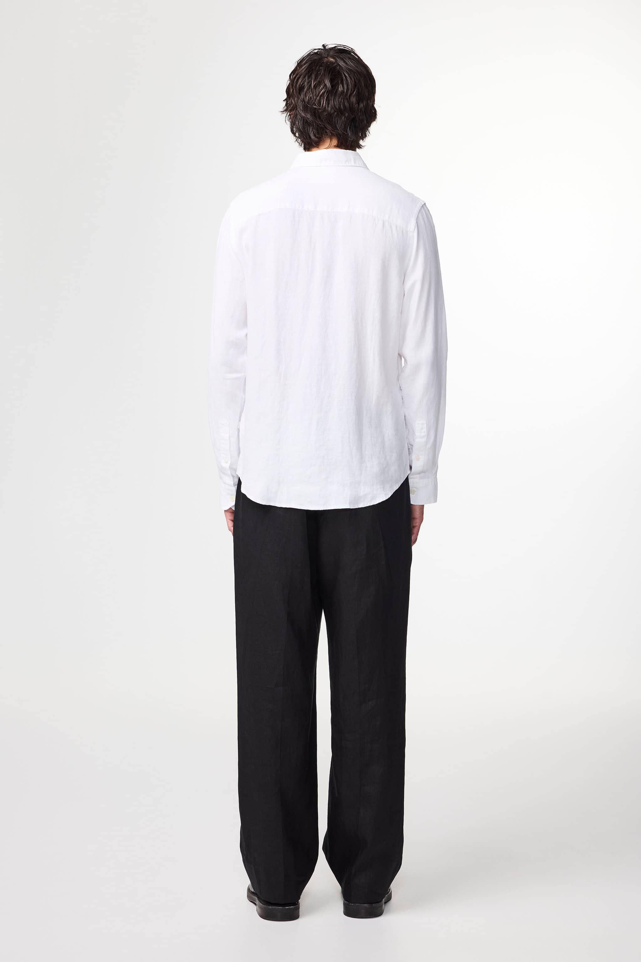 Shirt made from a crisp premium linen fabric designed with minimal details and a cut-away collar. Complete with dye-to-match buttons.