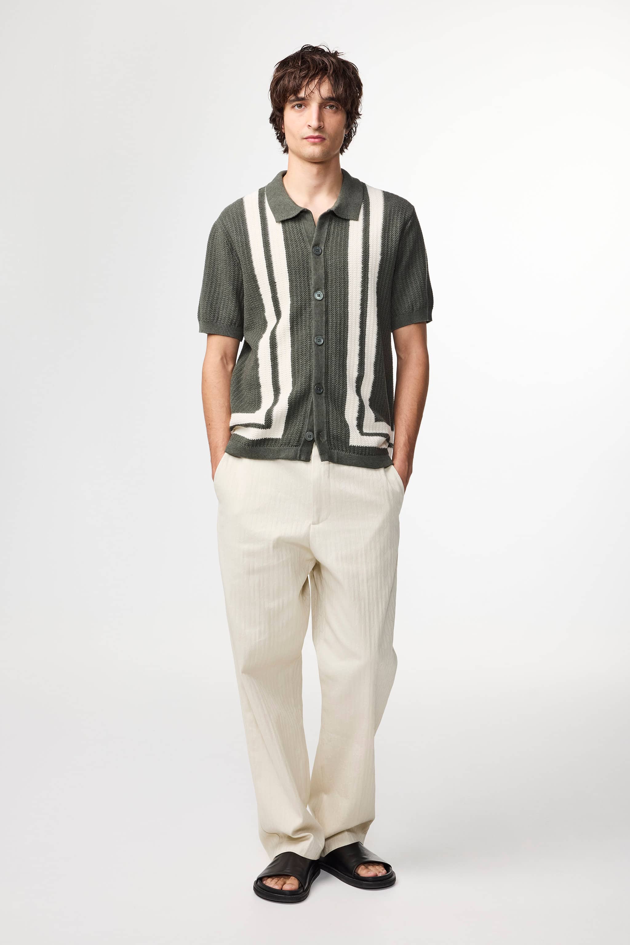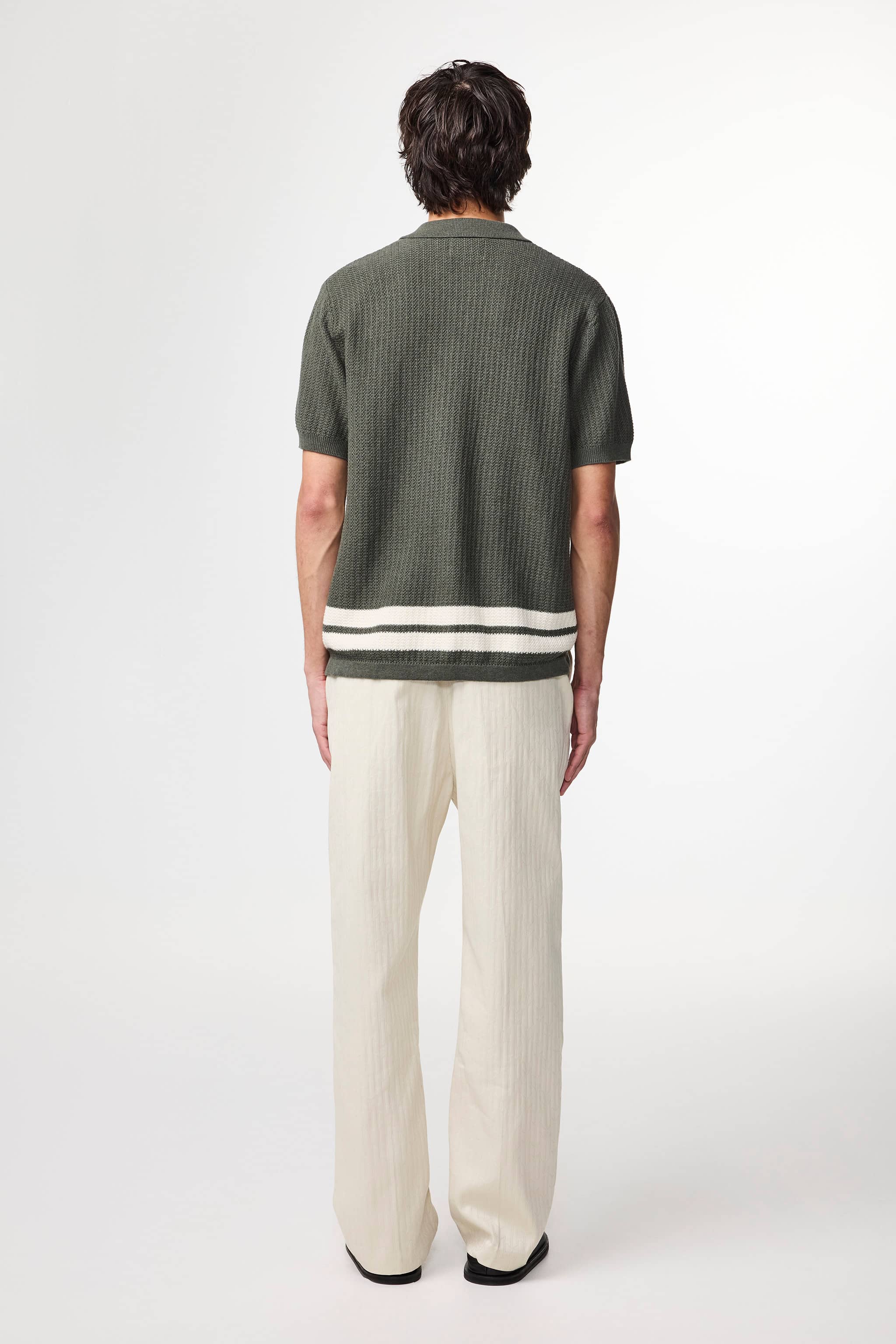 Shirt crafted from very soft organic cotton, knit in textured stitch with stripe details and finished with dye to match Mother-of-Pearl buttons.