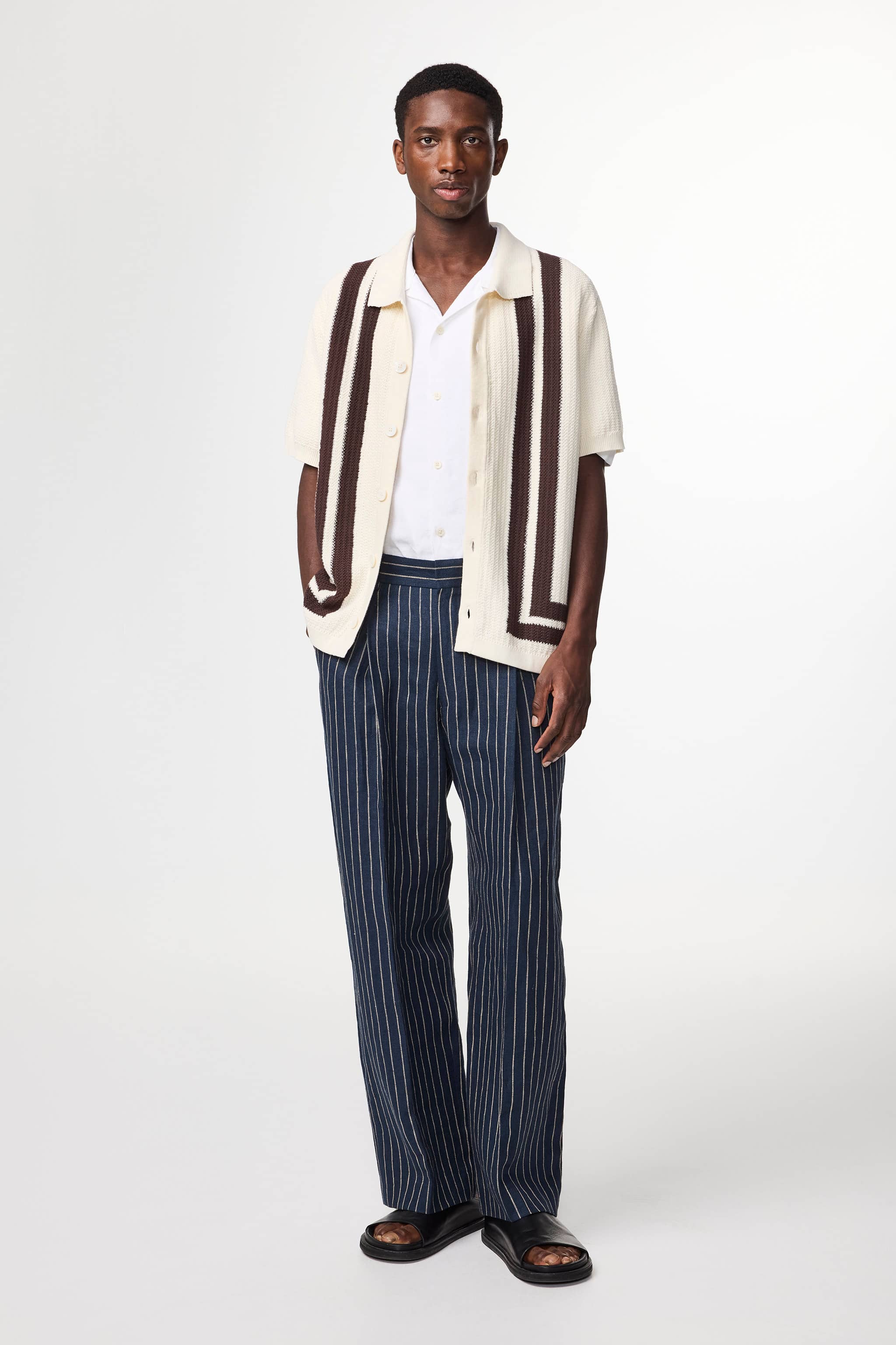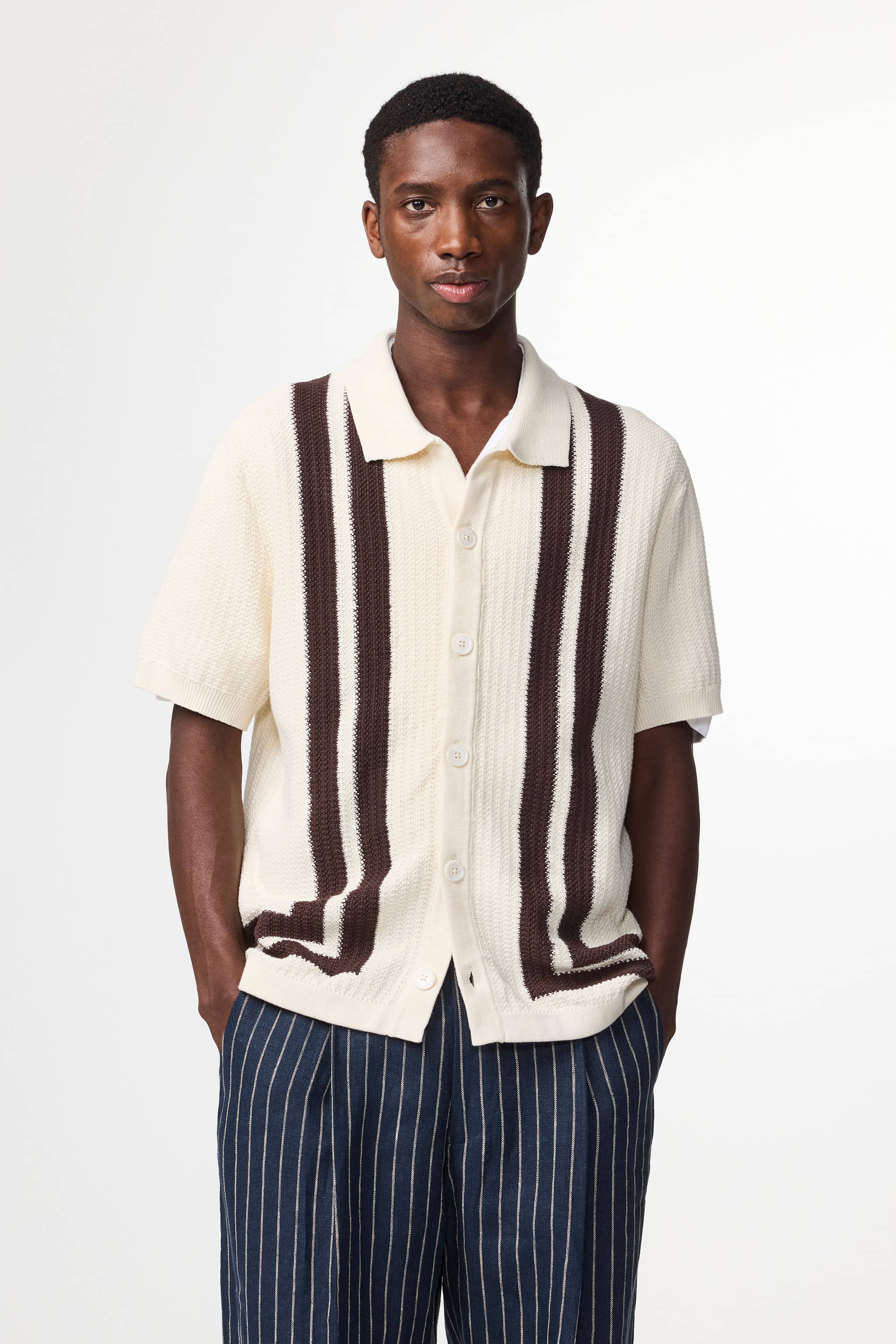 Shirt crafted from very soft organic cotton, knit in textured stitch with stripe details and finished with dye to match Mother-of-Pearl buttons.