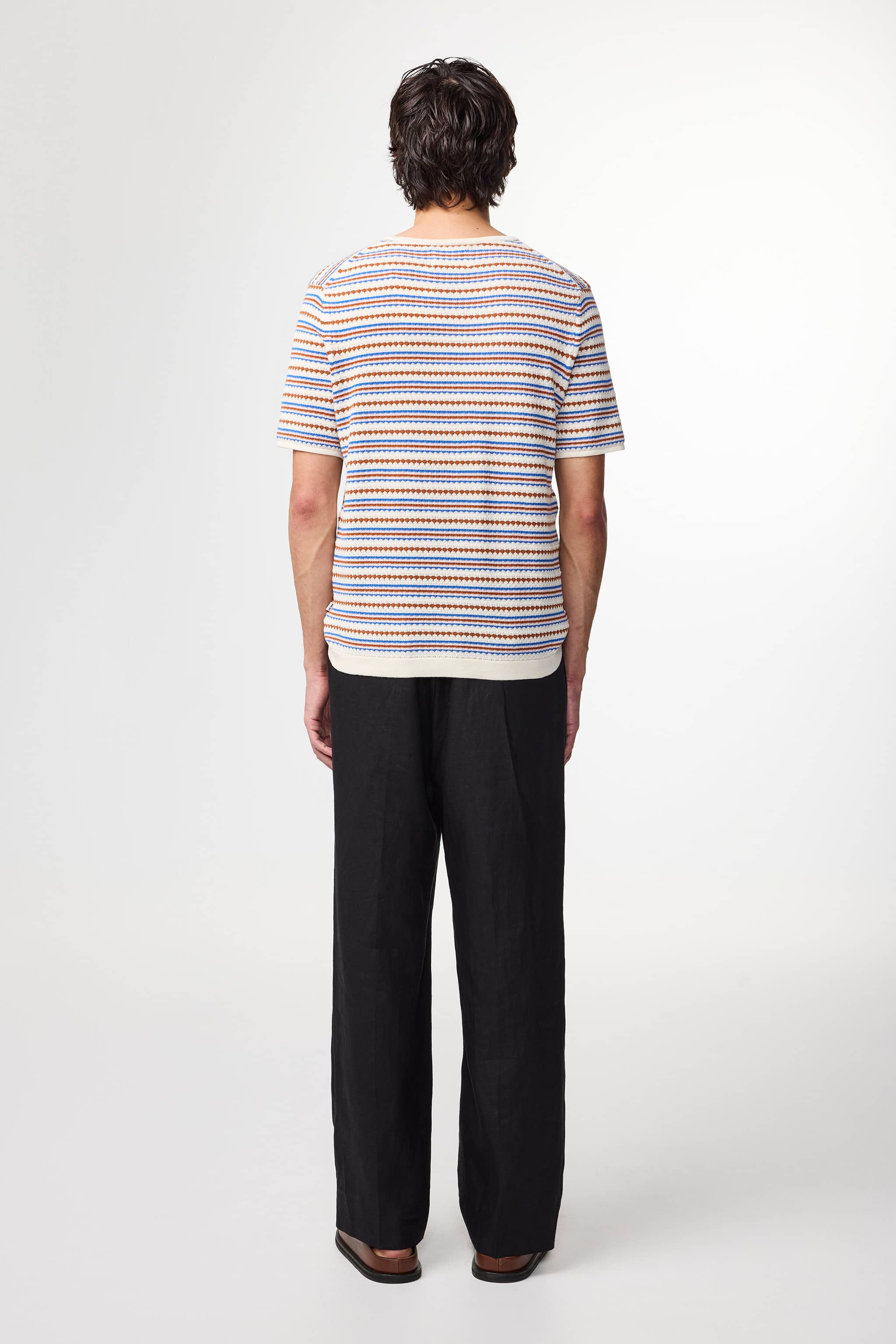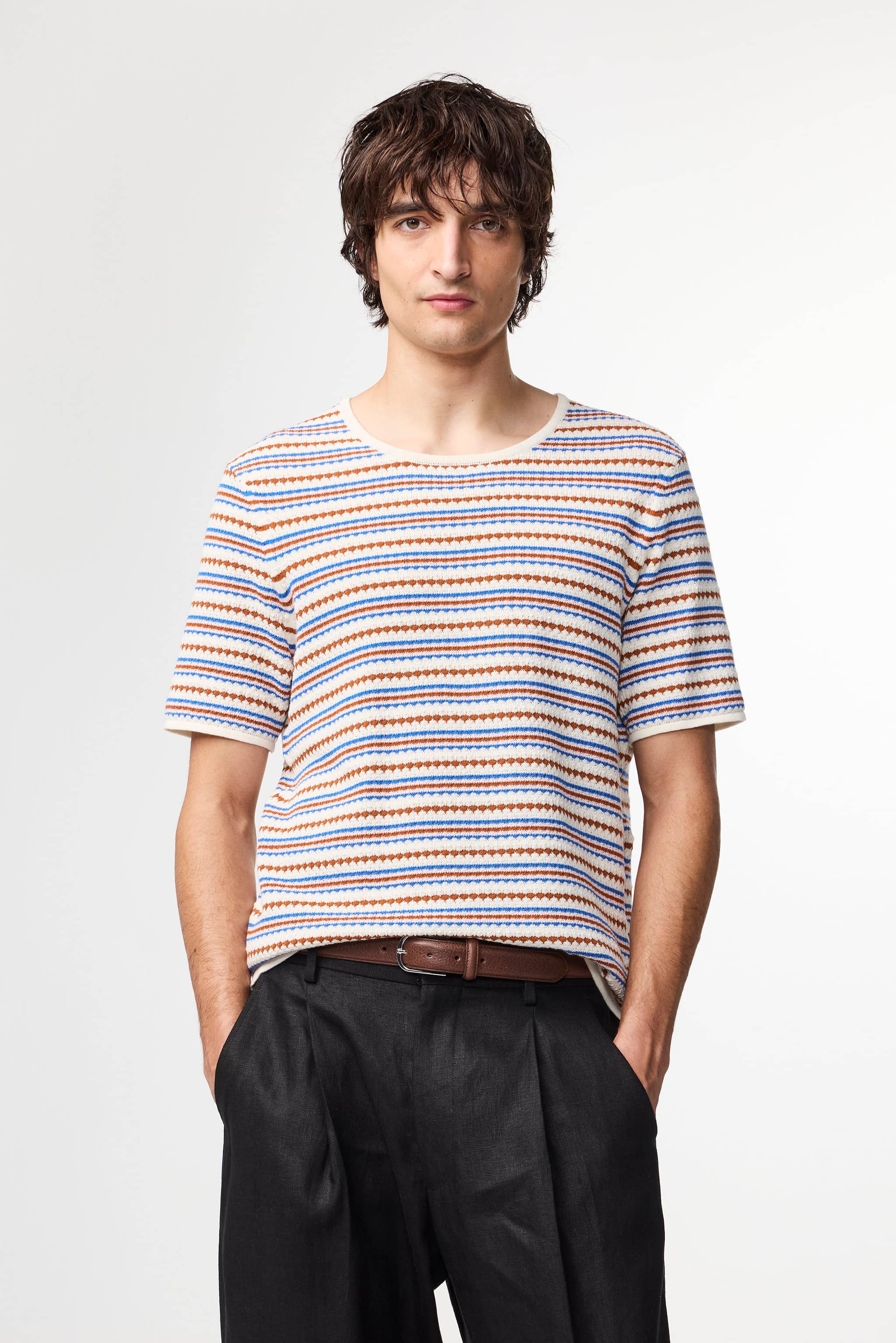 Relaxed-fit knitted tee crafted from soft organic cotton with textured stitch detailing. Features a comfortable, casual silhouette with a soft handfeel.