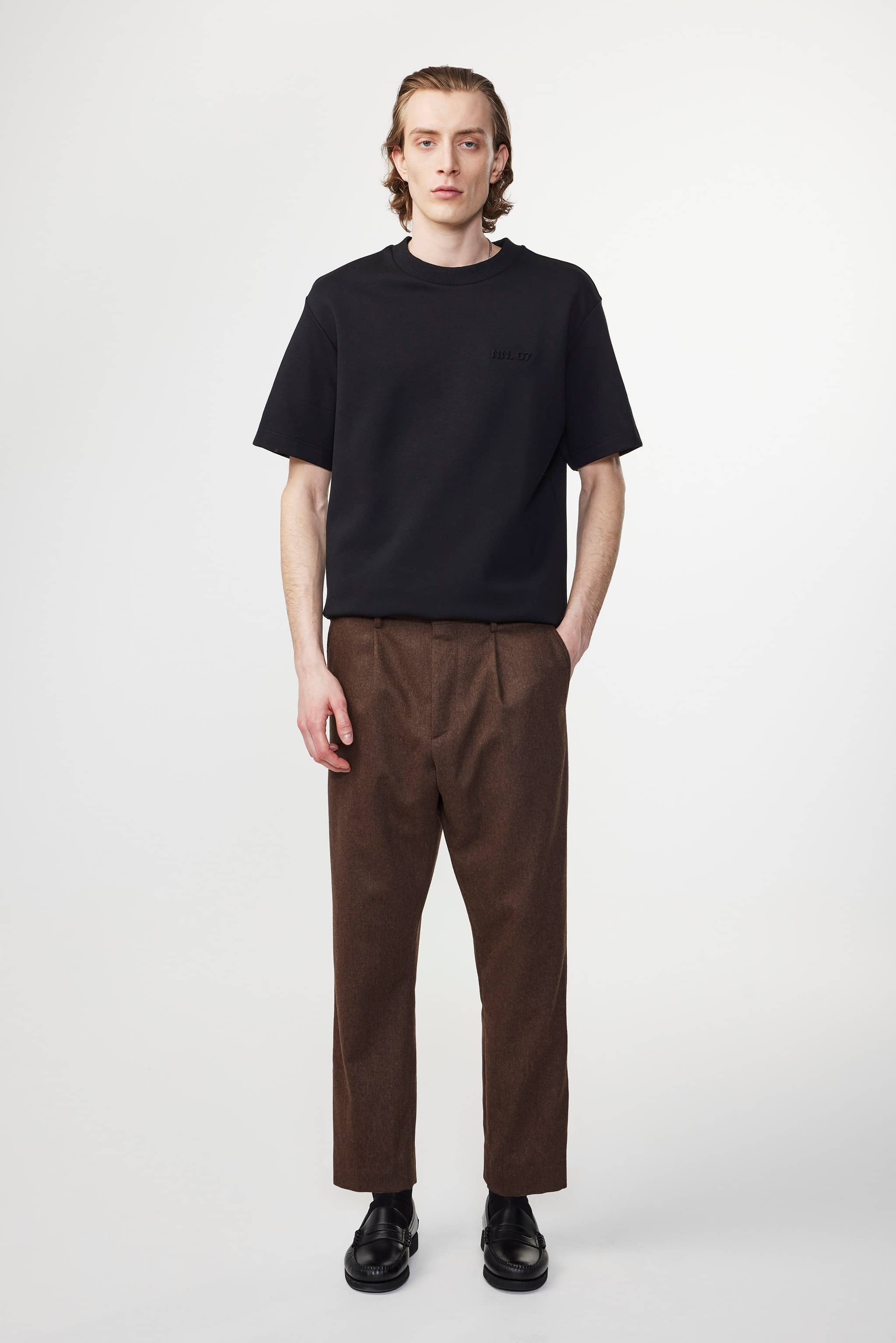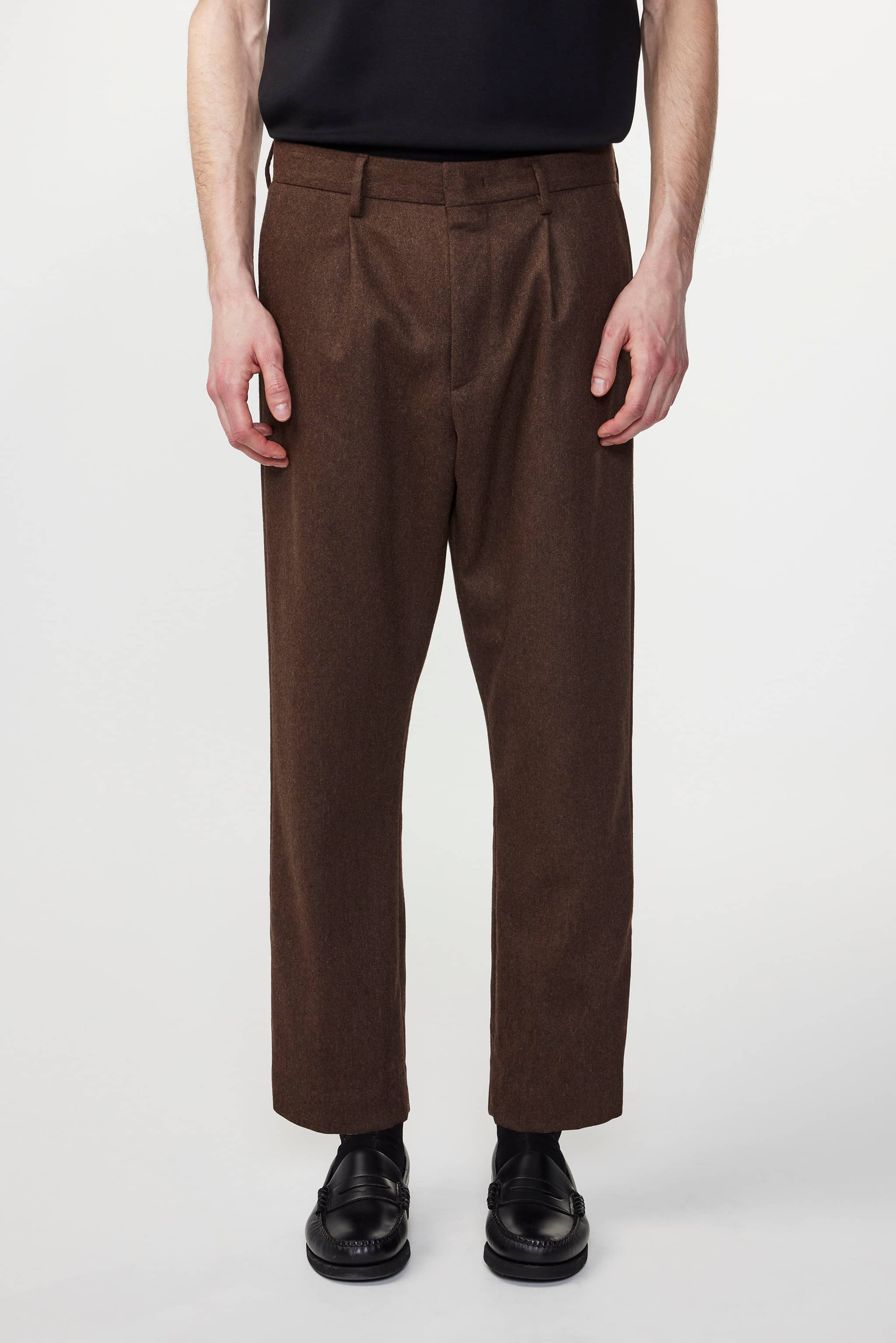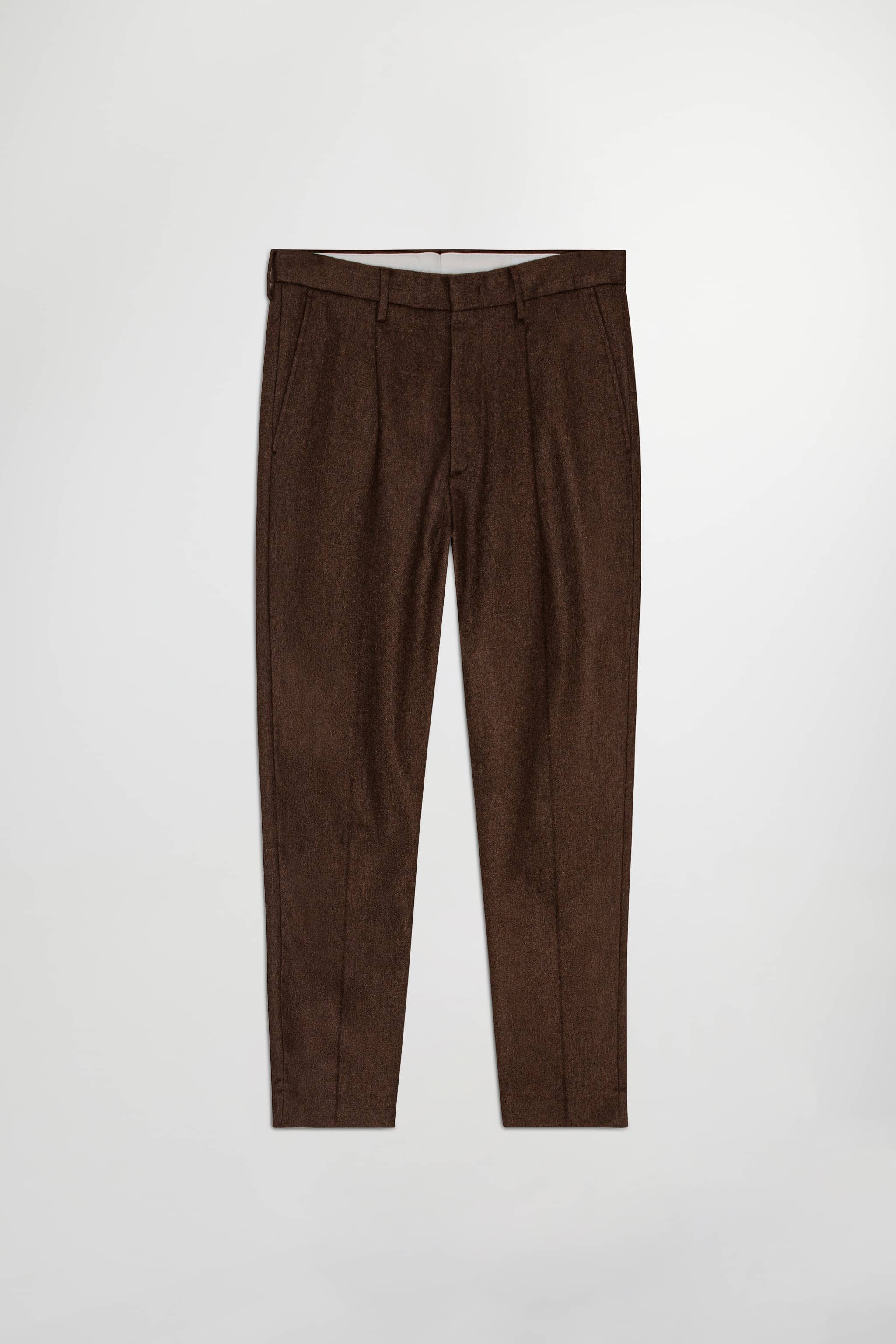 Dress trousers in a regular fit with tapered legs, crafted in a 380 g/m2 recycled wool blend melange twill. Features a minimalist design with press folds, blind hem, and hidden closure.