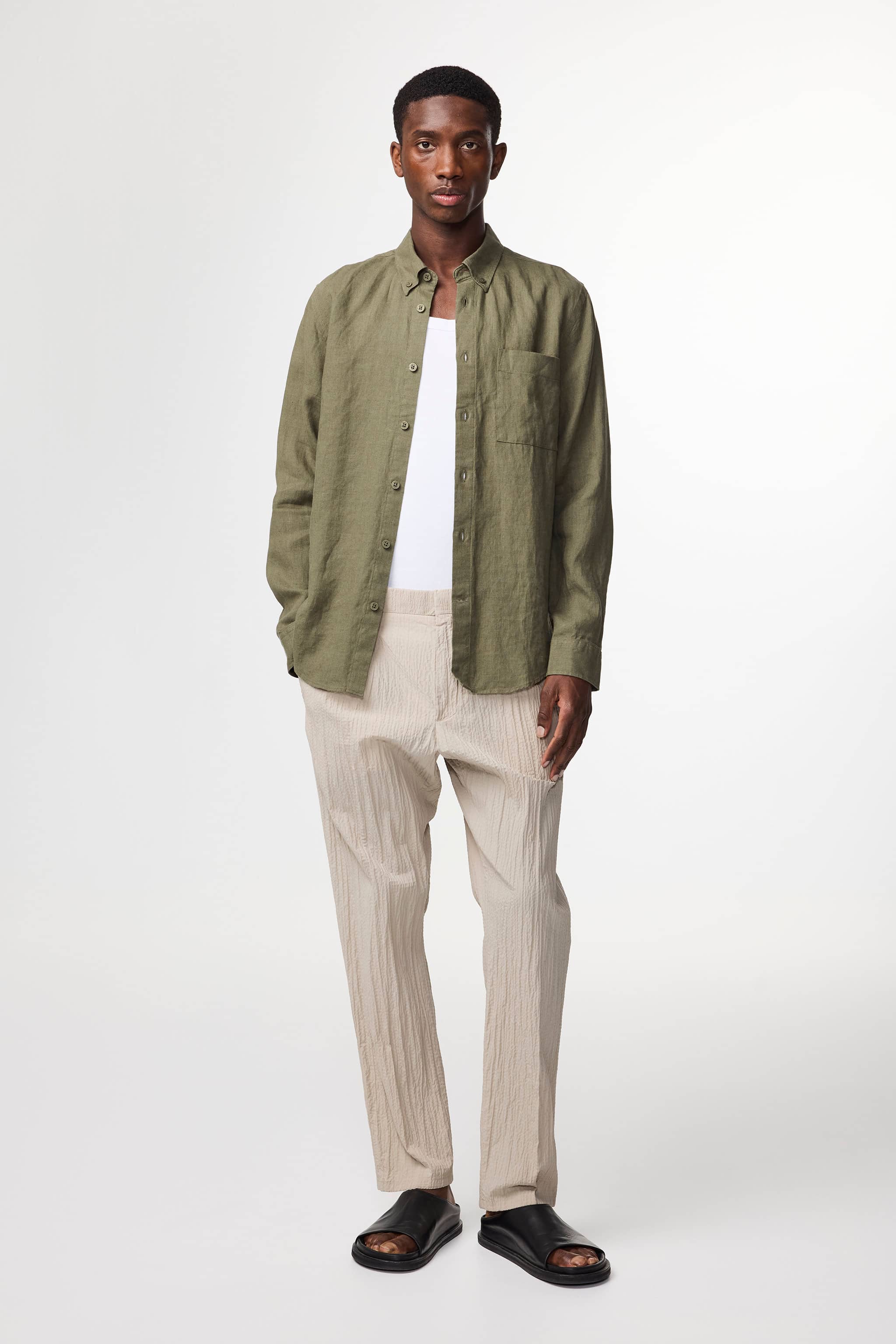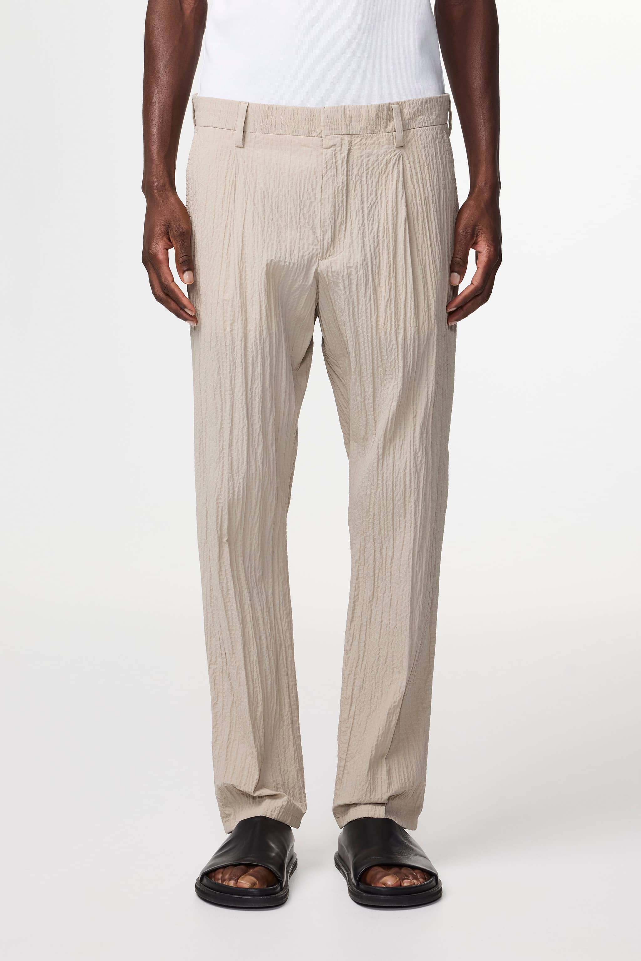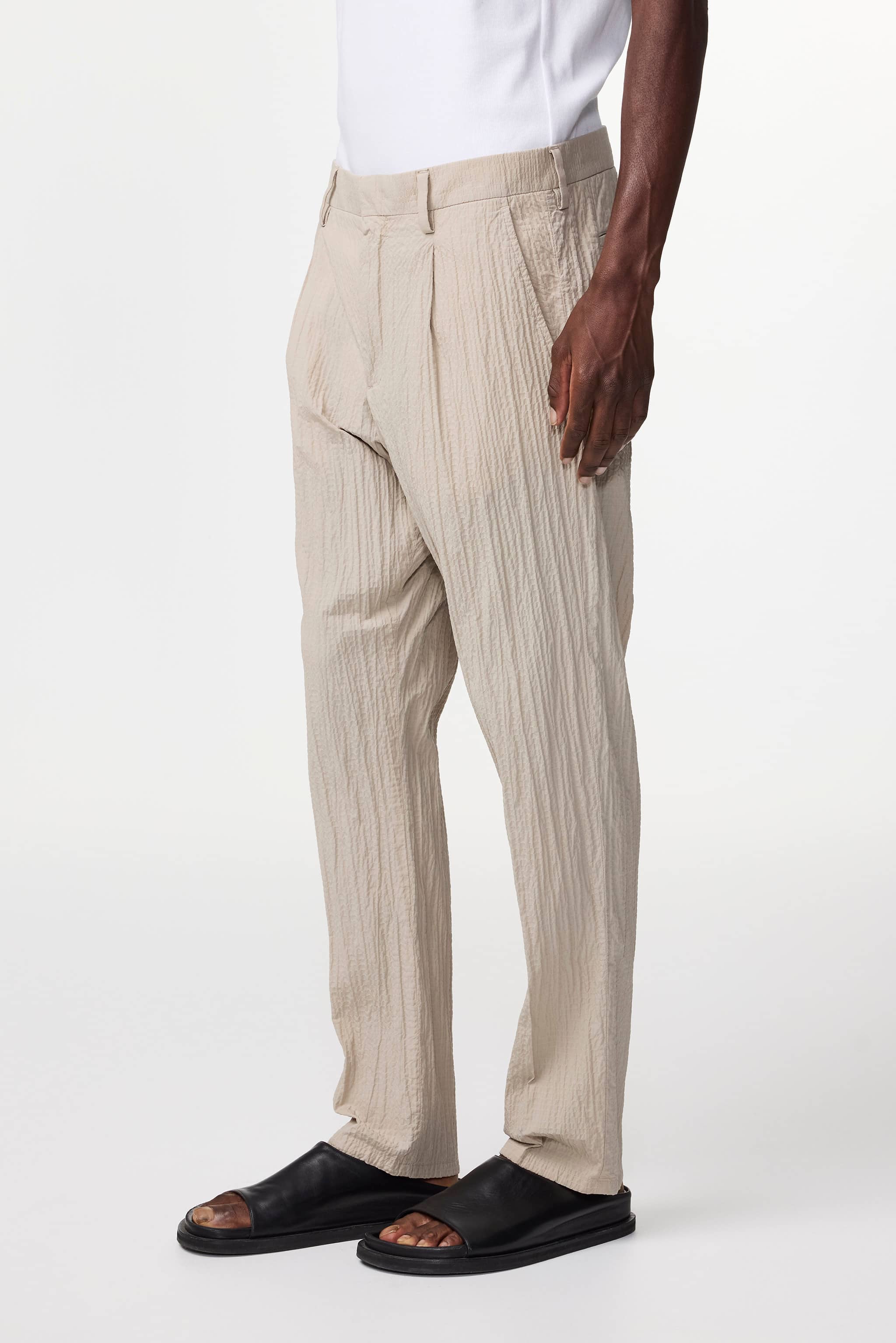 A pair of low-rise tapered trousers in a regular fit. Crafted in a lightweight 107 g/m2 seersucker organic cotton blend with a touch of stretch. Designed with a hidden button closure, and a crisp crease along the leg. Perfect summer fabric with a light and breezy feel.