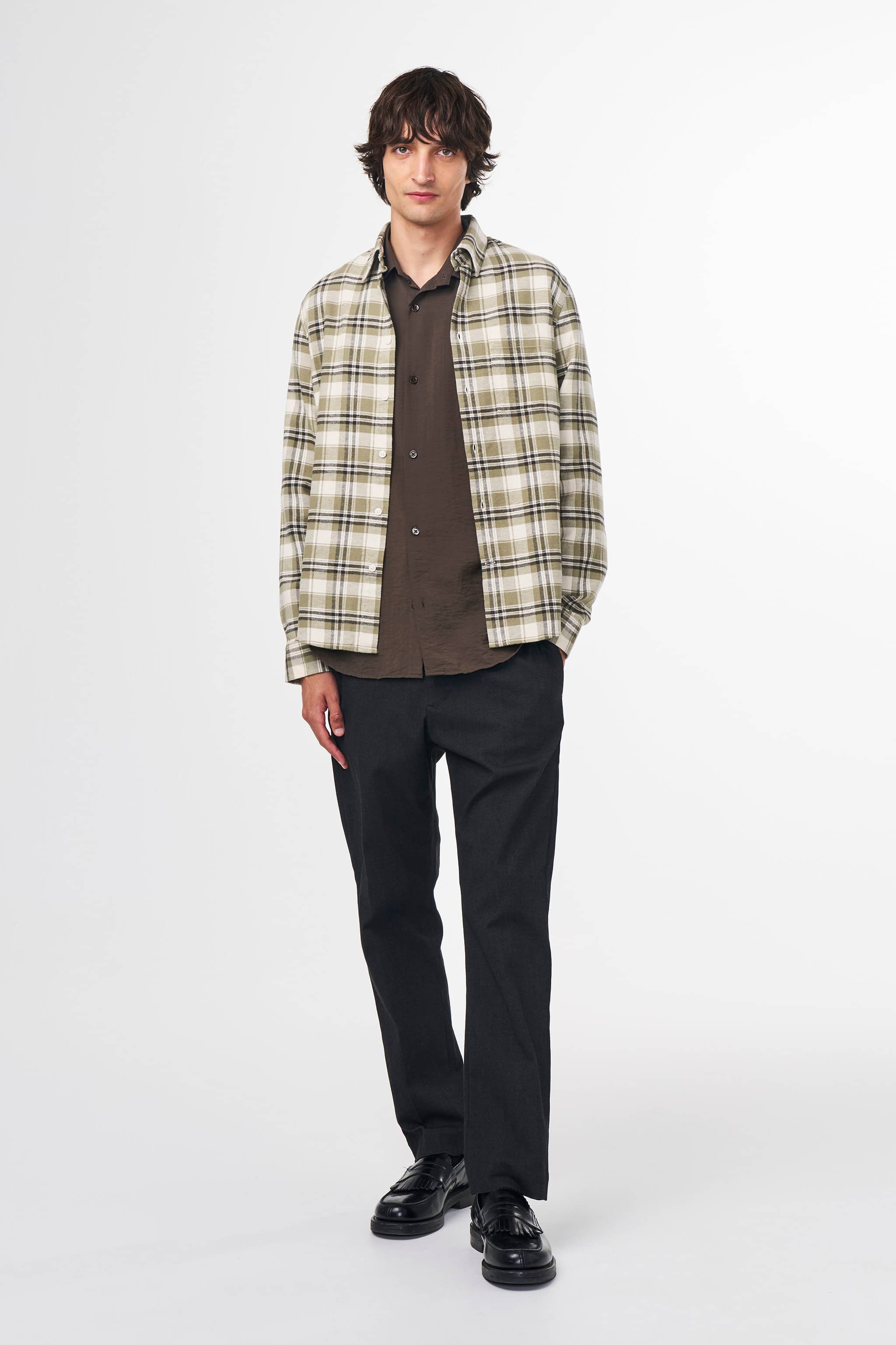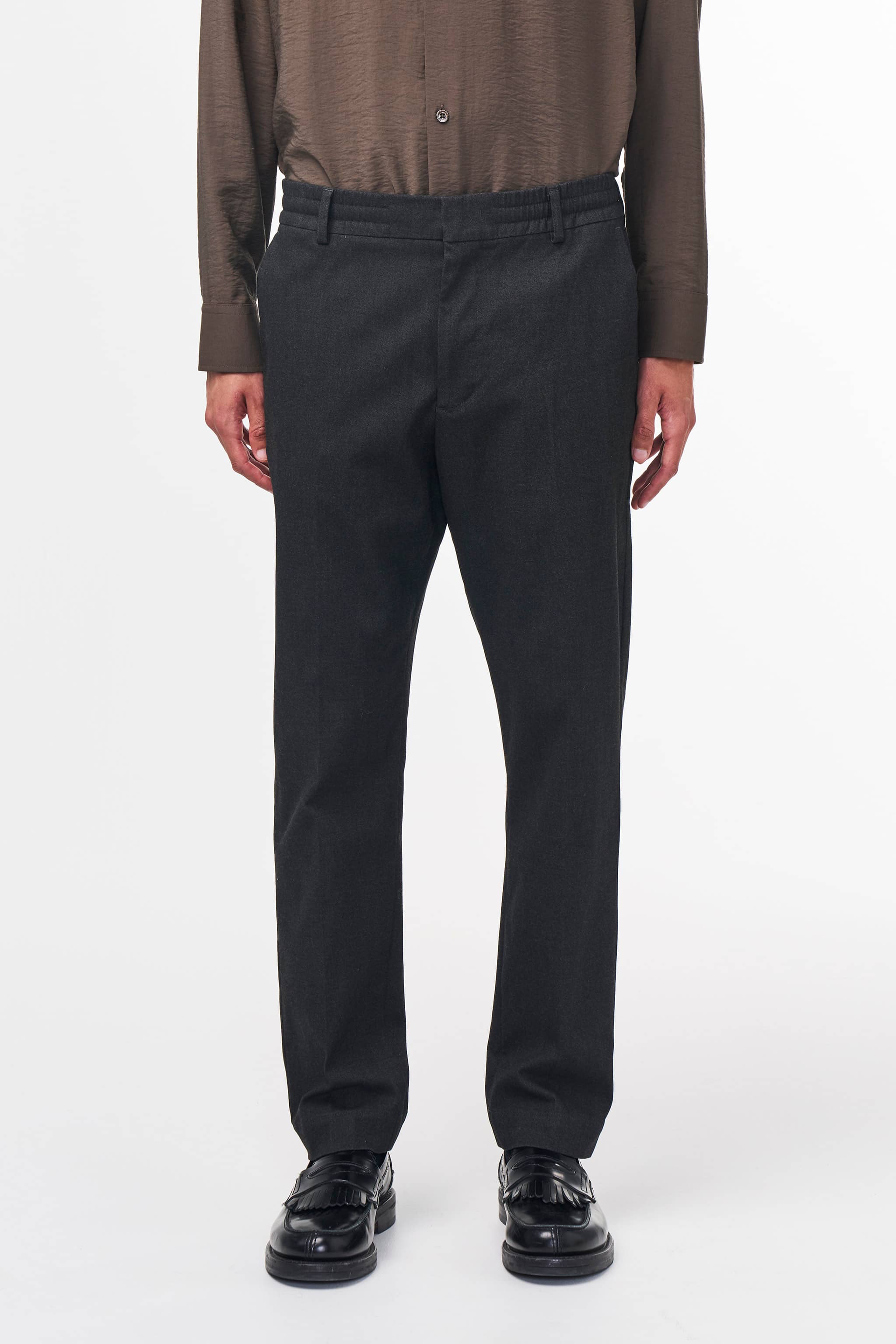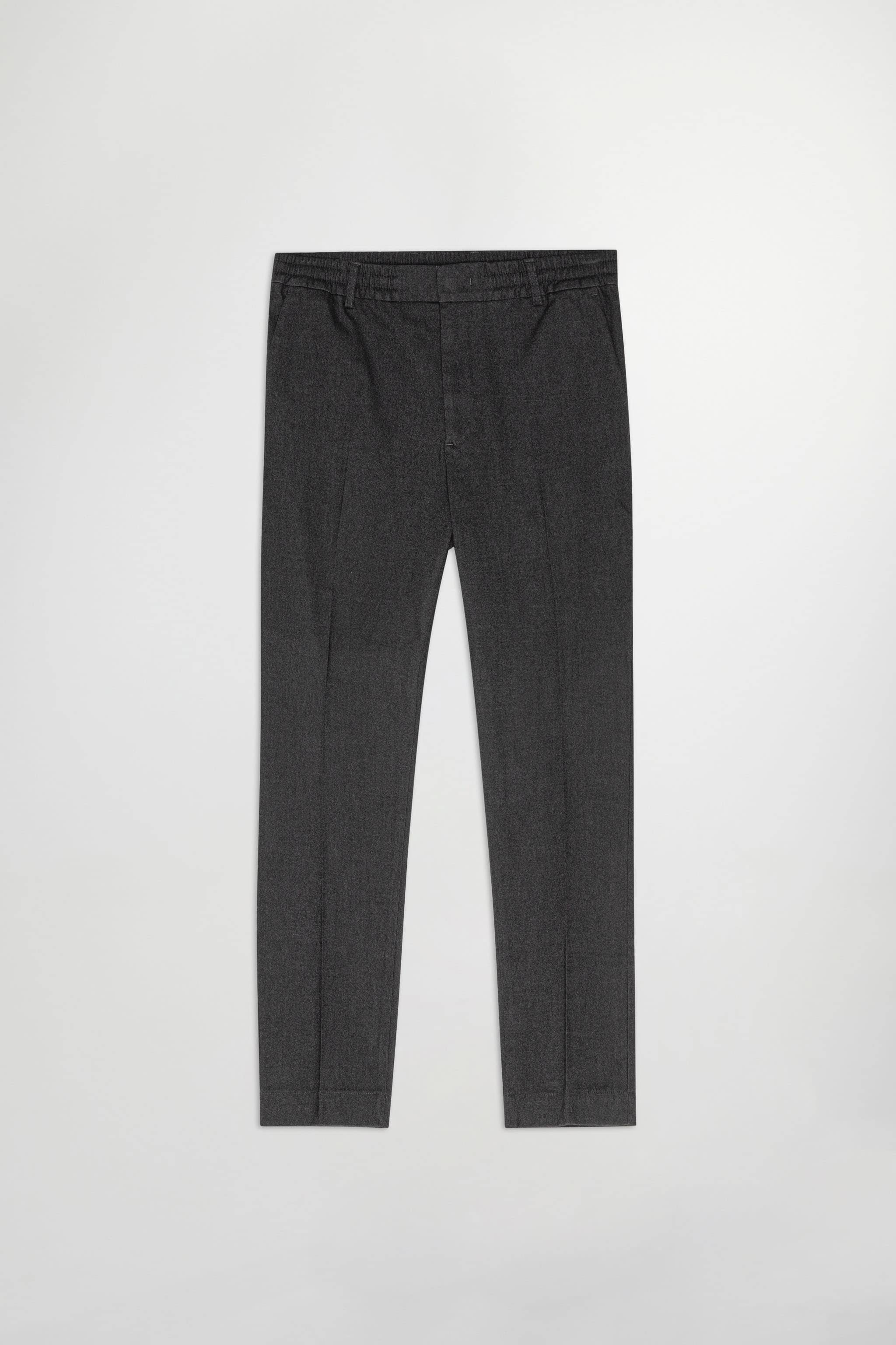 A pair of regular fit dress trousers with a tapered leg, crafted from a melange lightweight, 279 g/m2 cotton twill blend with a touch of stretch for added comfort. The trousers have a drawstring closure, an elasticated waistband, and are finished with a press fold and zip fly.