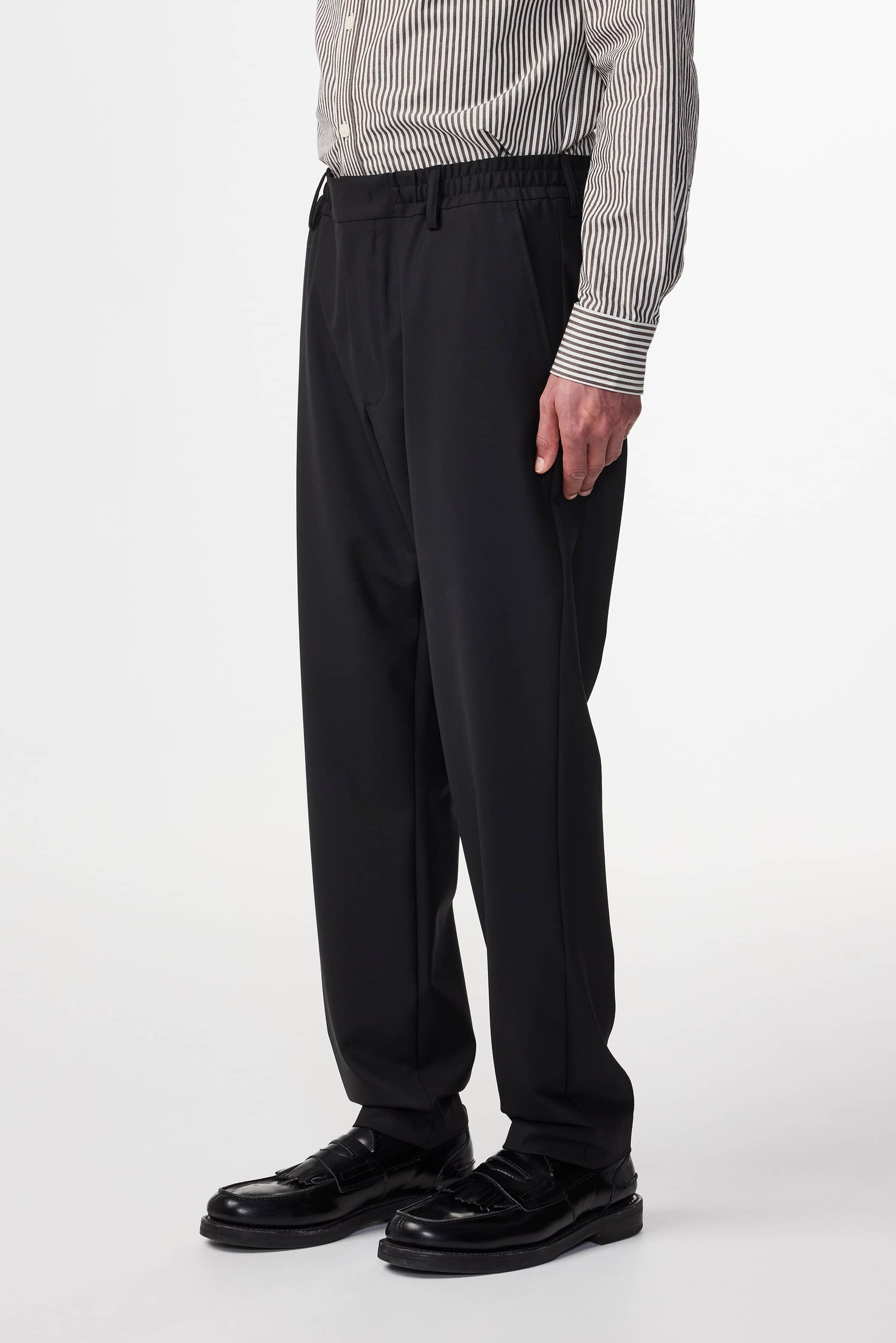 Casual dress trousers in a regular fit with tapered leg, made in 213 g/m2 drapey recycled polyester and certified wool blend fabric with a touch of stretch for comfort. Finished with an elasticised waistband with a hidden drawstring closure, and a neat press fold.