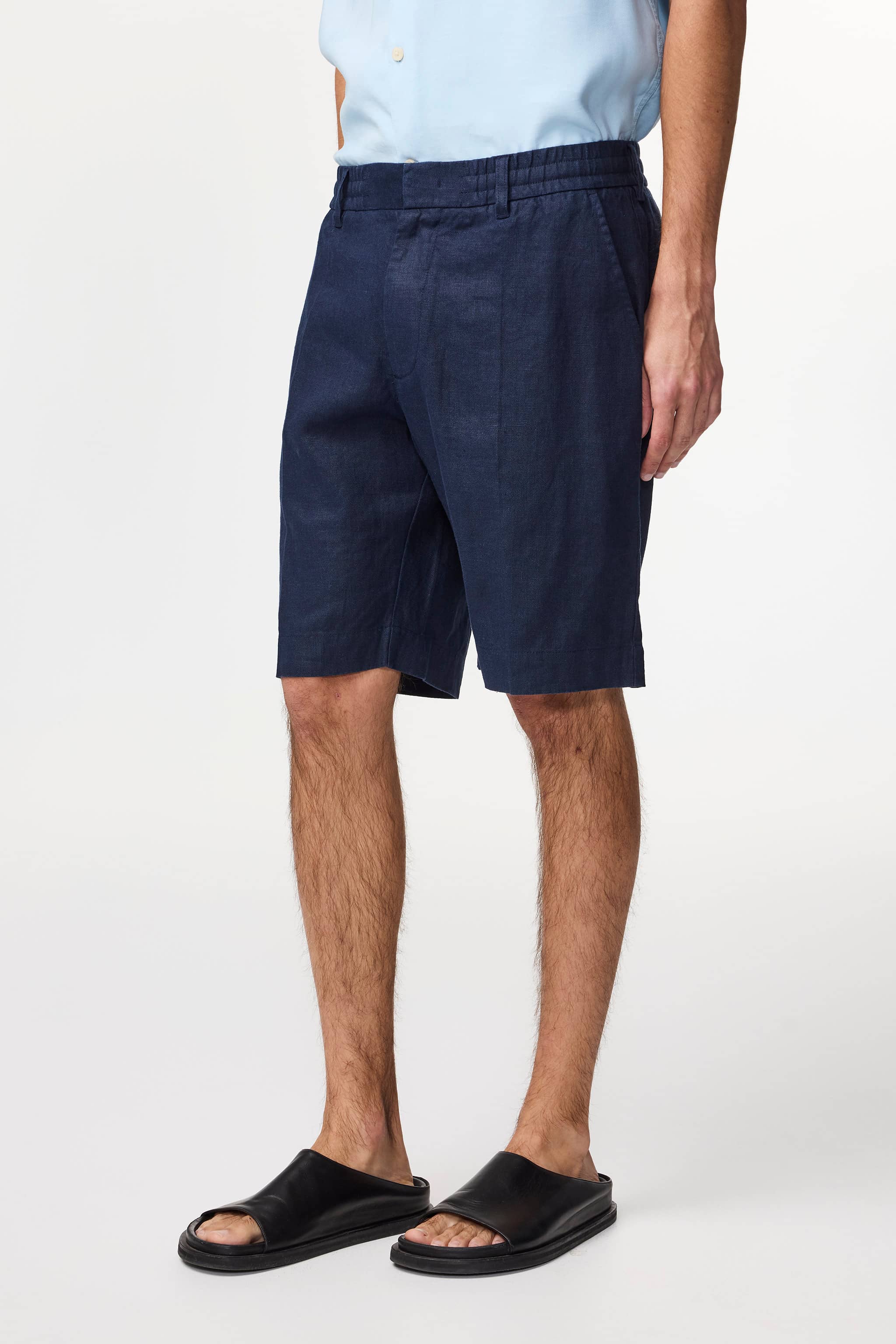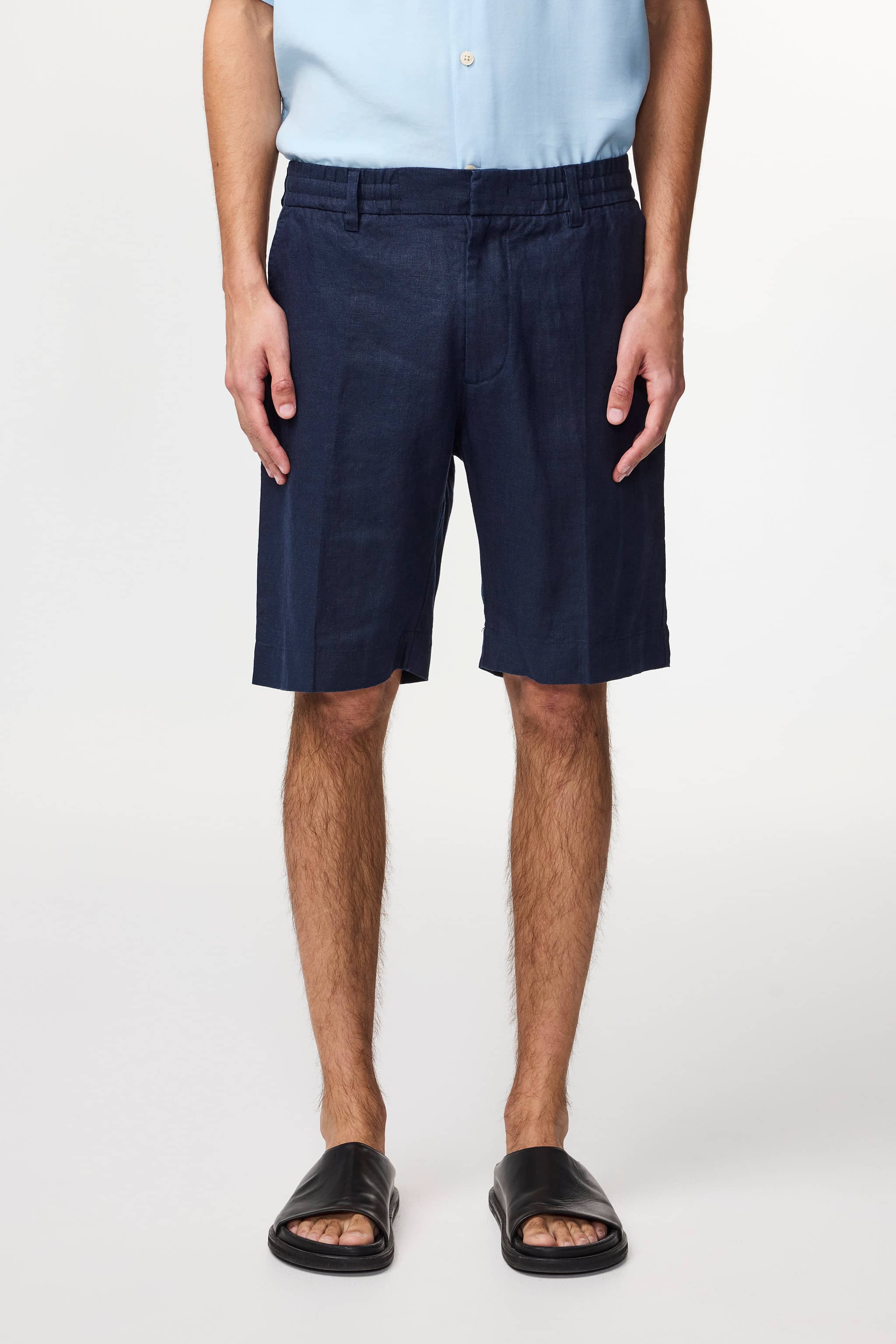 Dress shorts crafted from premium European linen with a drapey handfeel and crisp finish. Features an elasticated waistband with hook and bar closure plus an inside drawstring for adjustable comfort.