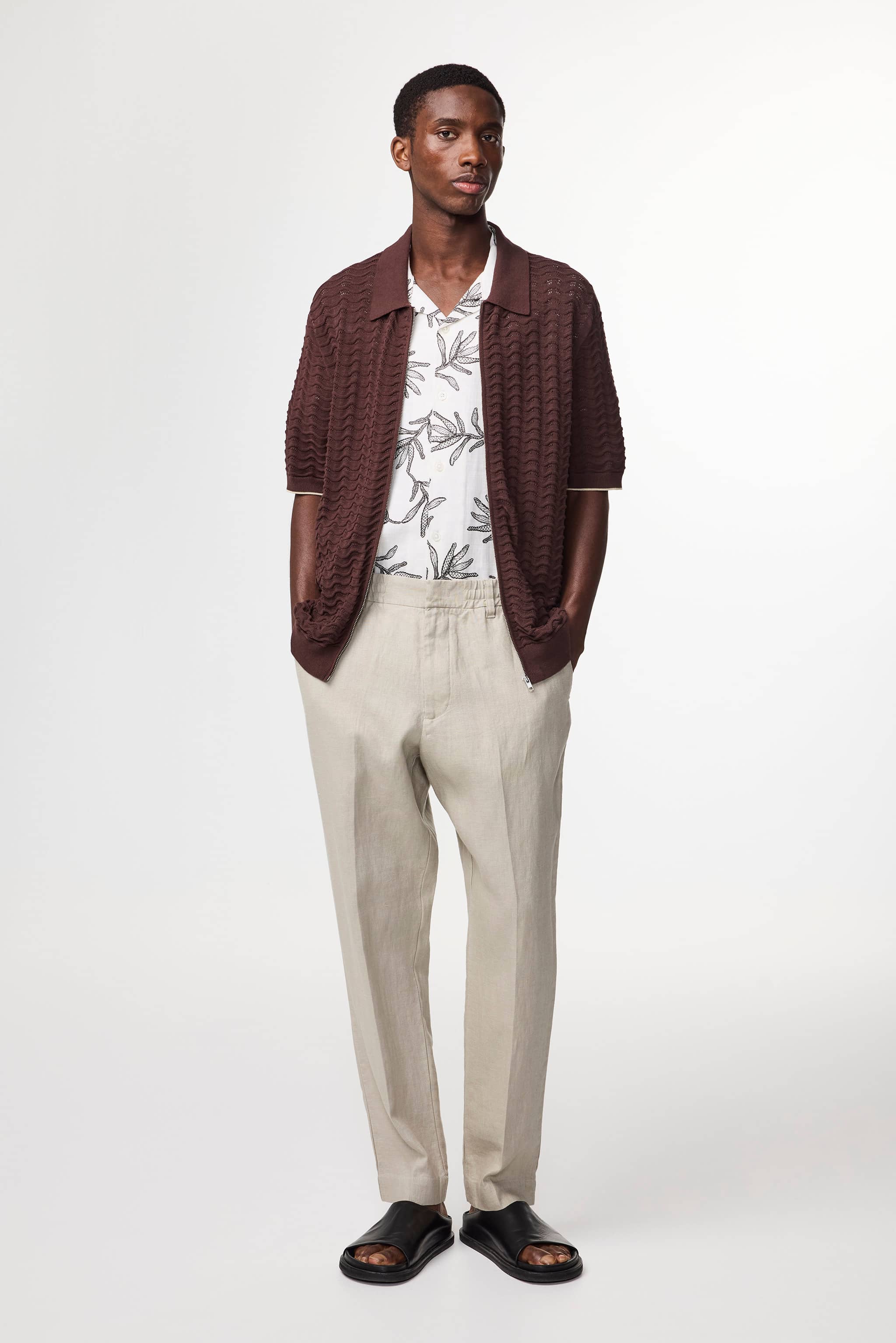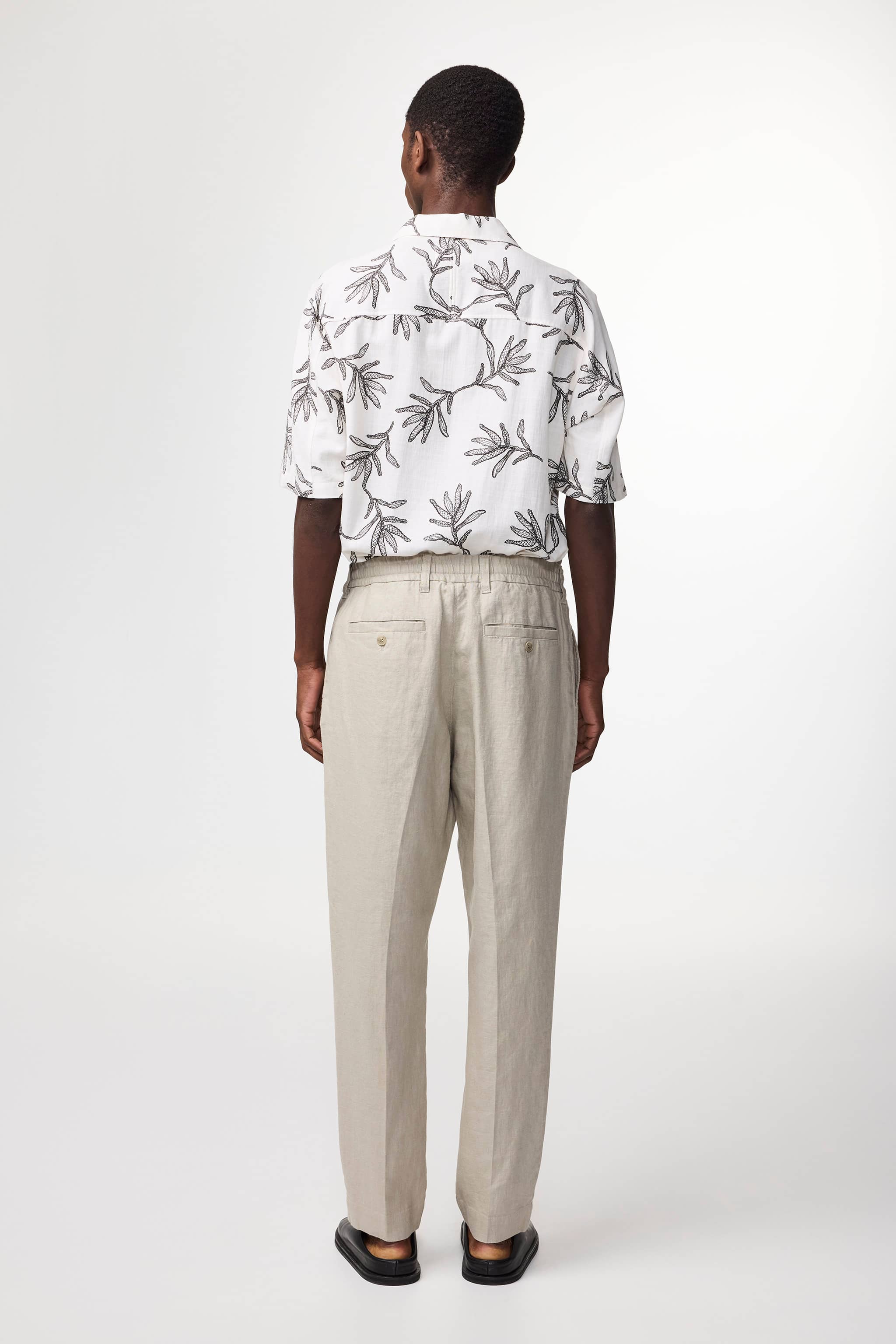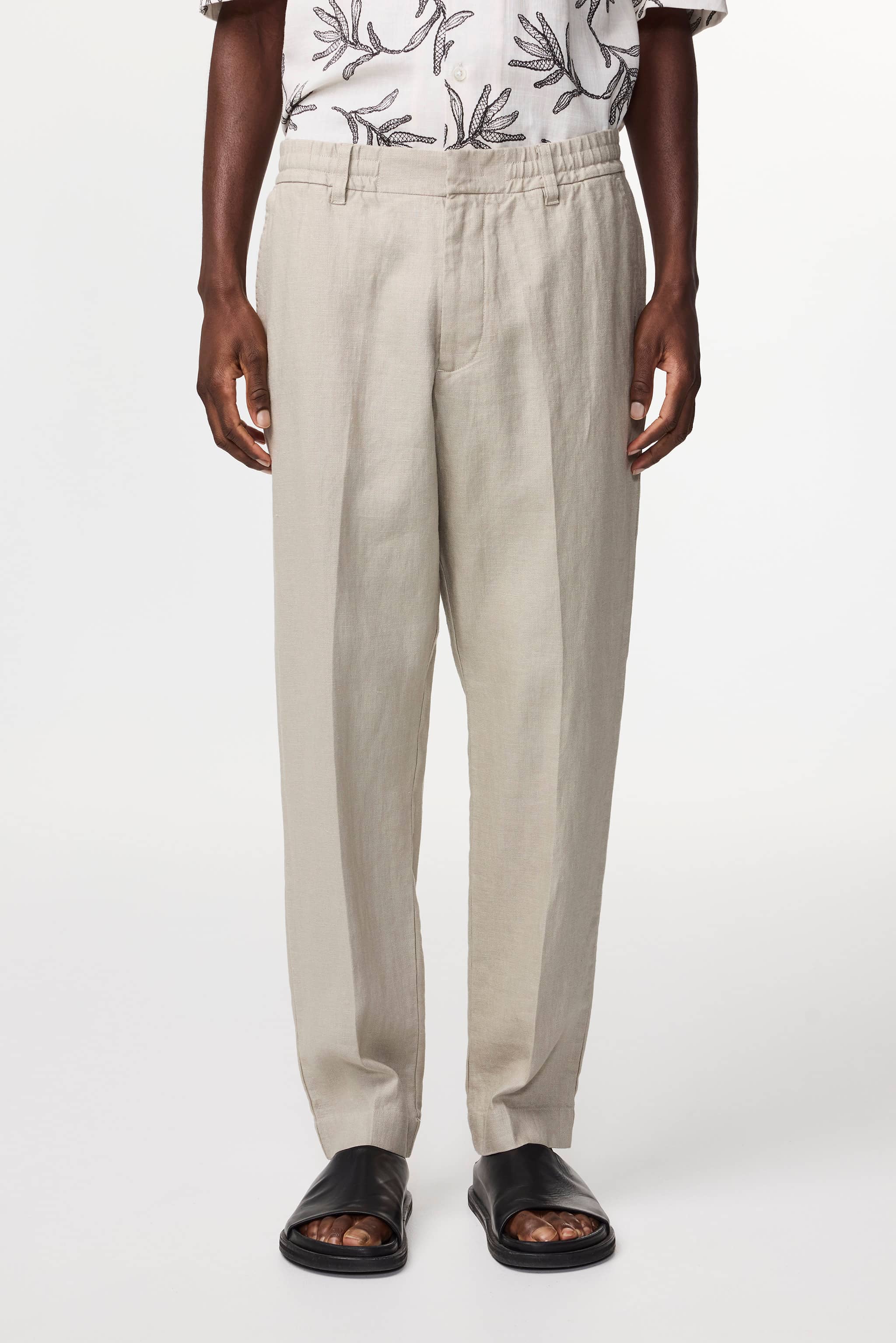 Casual dress pants crafted from European linen with a tapered leg. The soft and breathable fabric offers a relaxed drape, while the elasticated waistband with hook and bar closure and inside drawstring ensures comfortable everyday wear.