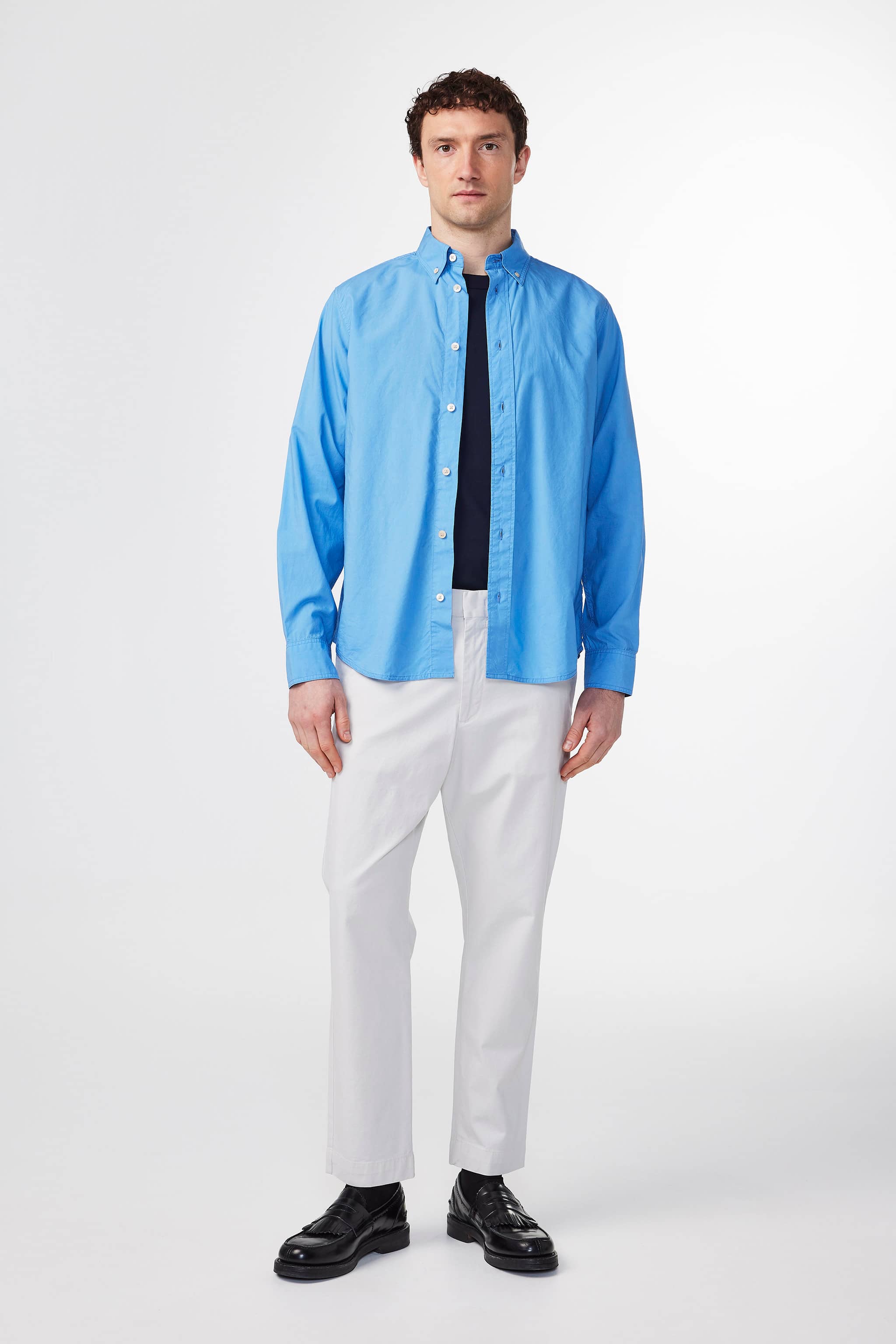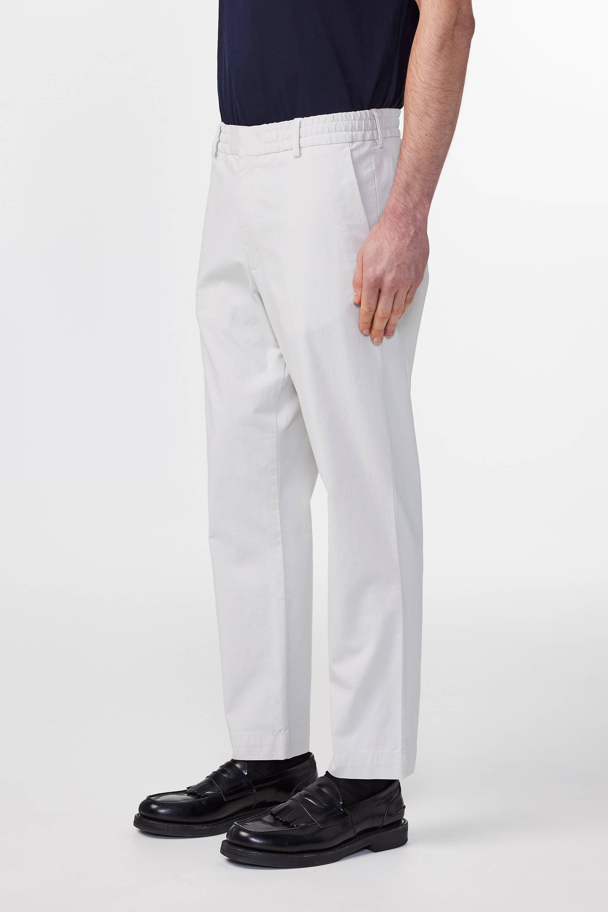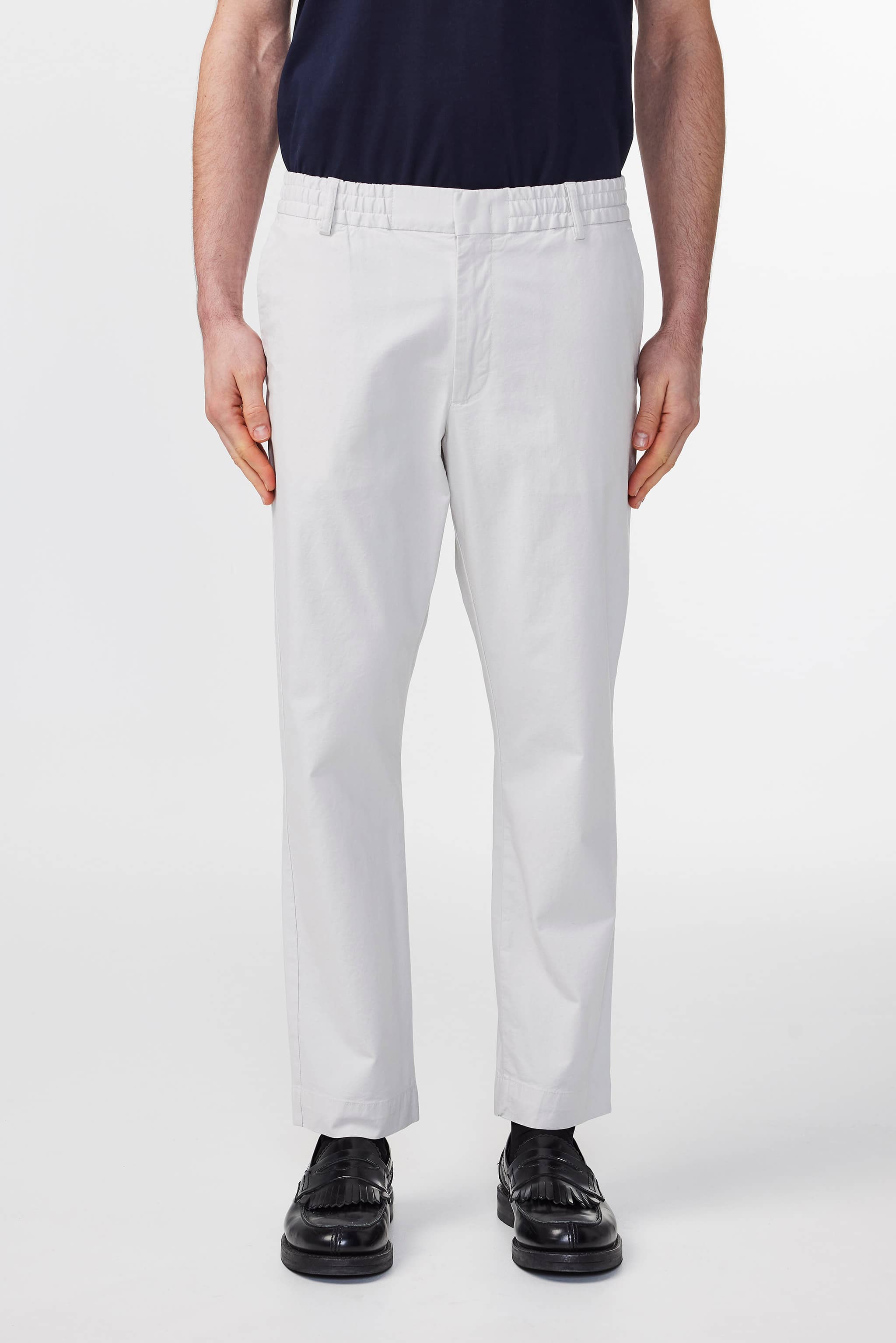 Midweight trousers in a regular fit trousers with tapered leg, crafted in a 230 g/m2 organic cotton and TENCEL™ modal blend with a touch of stretch. Designed with an elasticised waistband with drawstring closure. Features a minimalist design with press folds, blind hem, and hidden closure.