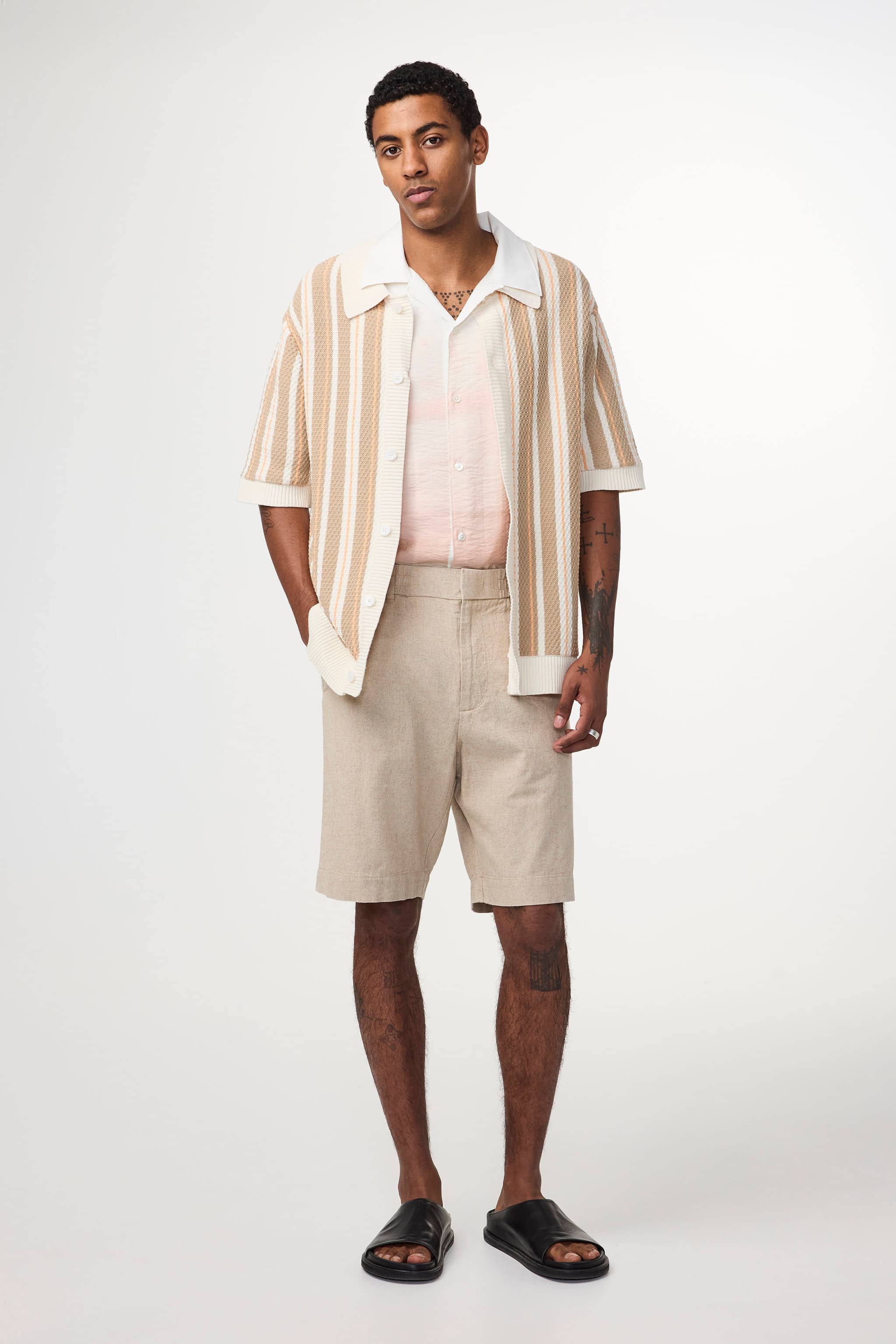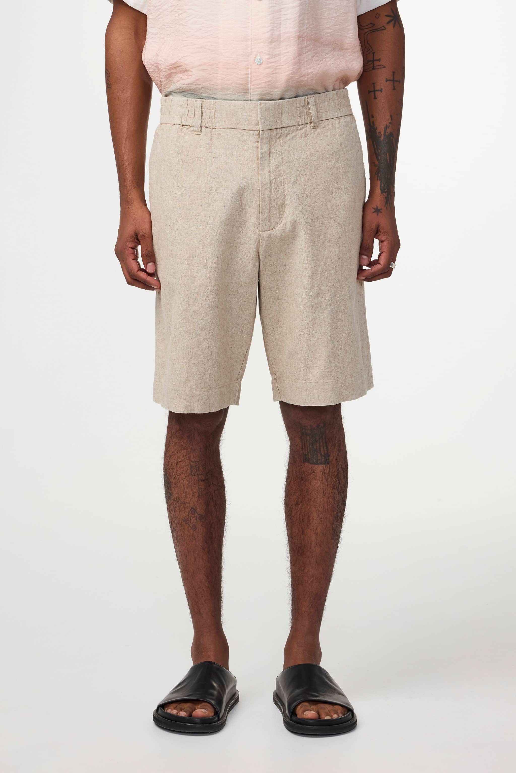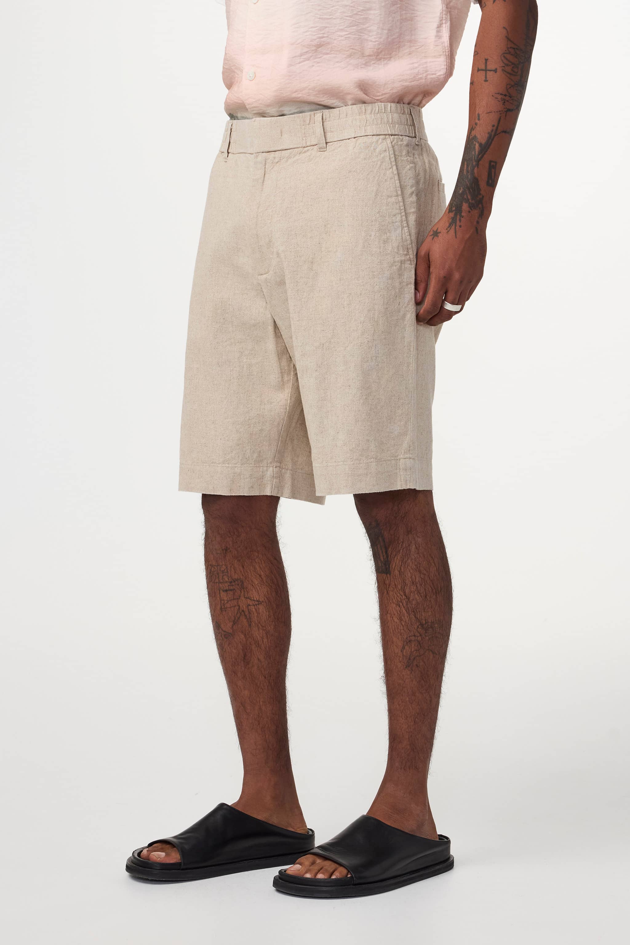 Shorts crafted in an organic cotton and linen fabric. Complete with an elastic waist, press fold, and two slanted side pockets.