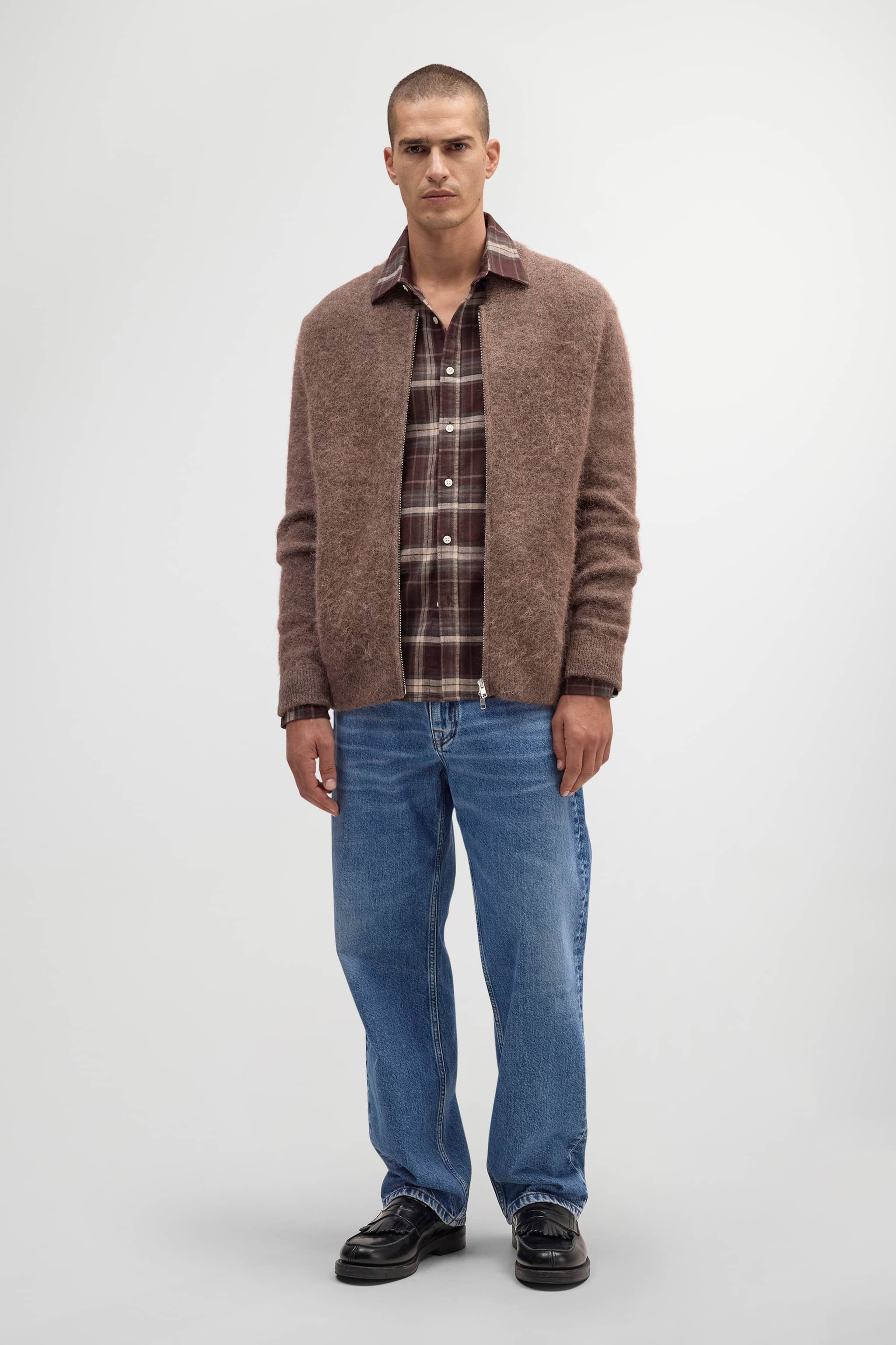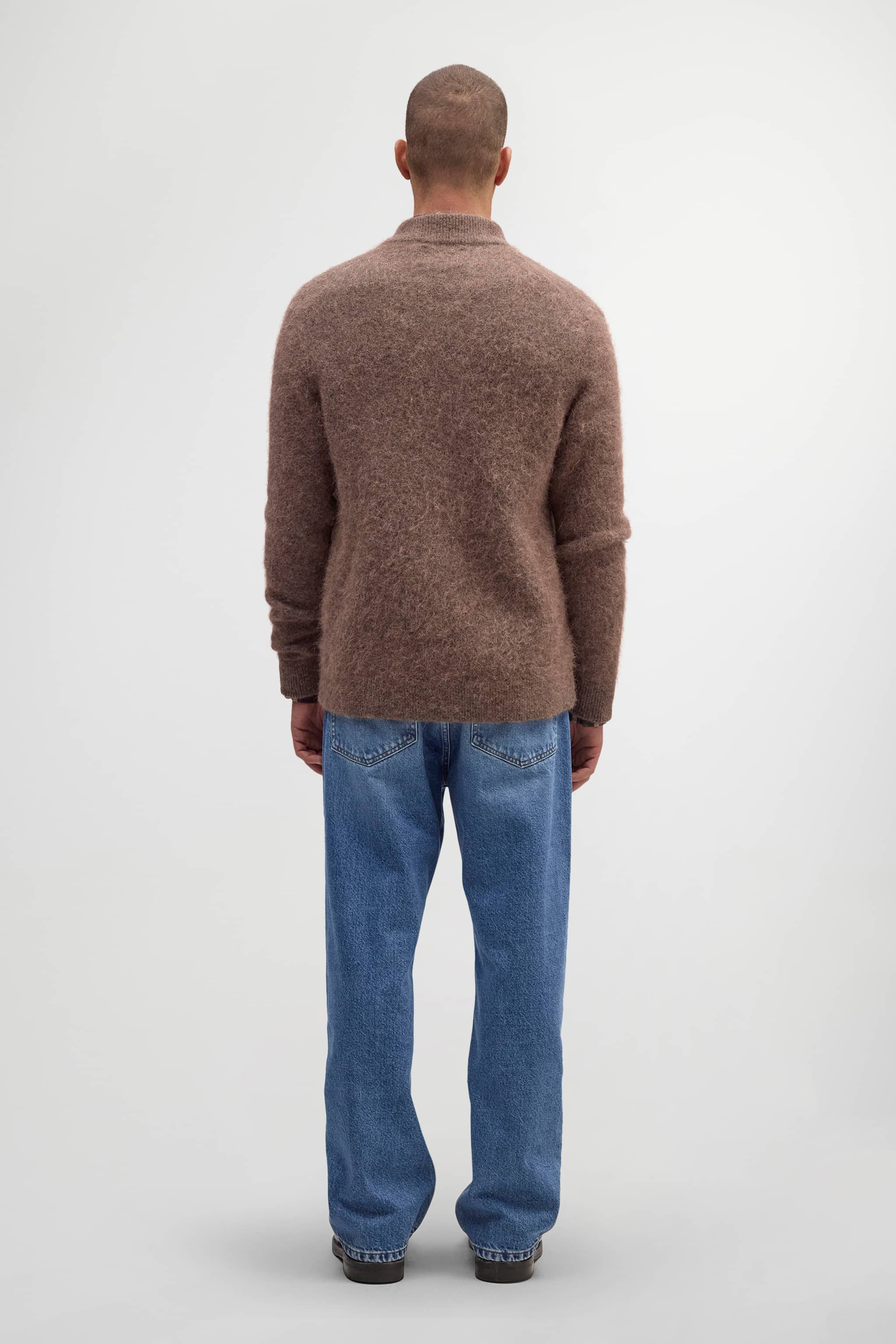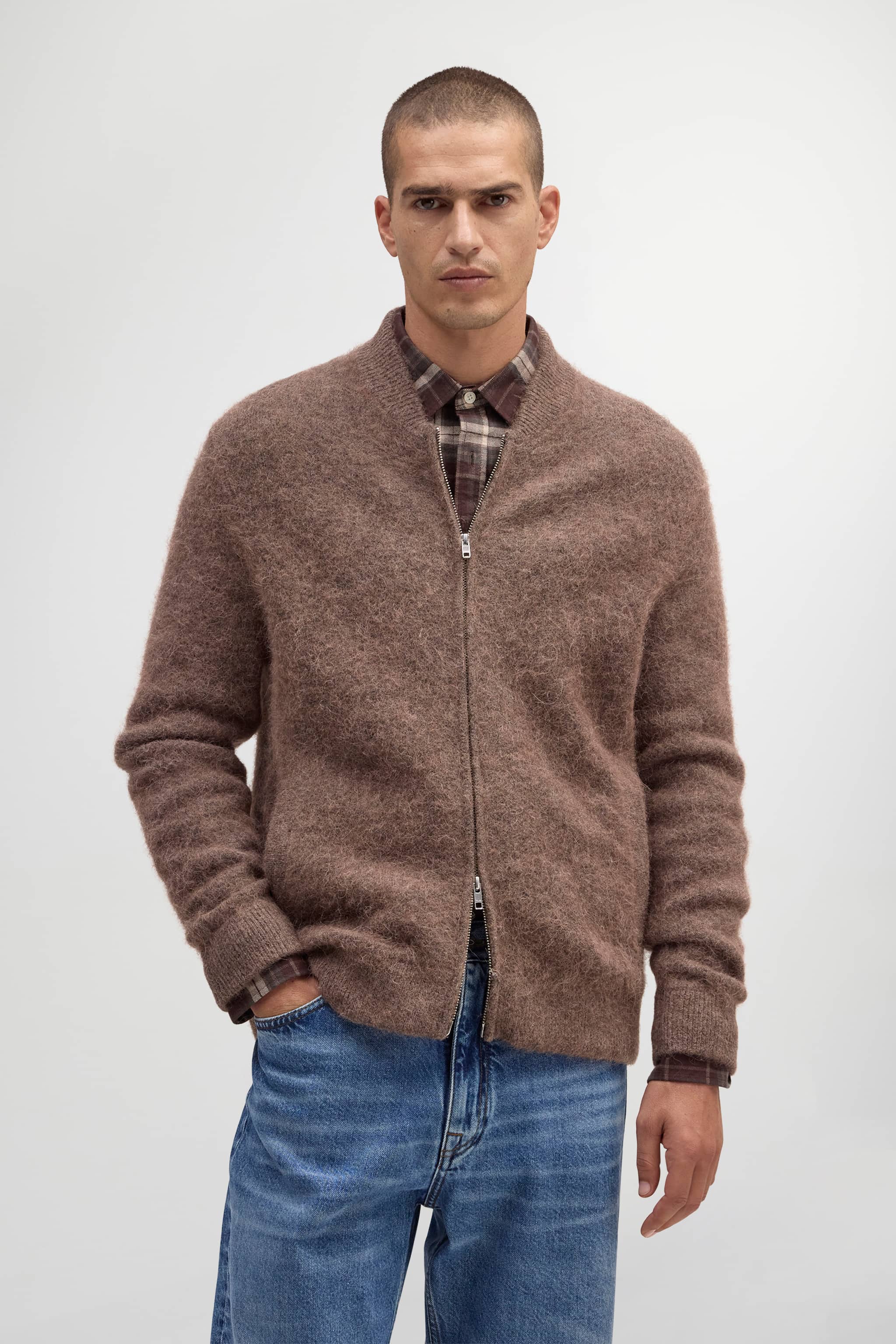 Exclusively available online through Mr. Porter and NN.07. Knitted bomber jacket crafted from a soft alpaca blend with a fuzzy texture for an ultra-soft feel. Designed with a bomber collar, hidden front zip closure, and two side pockets.