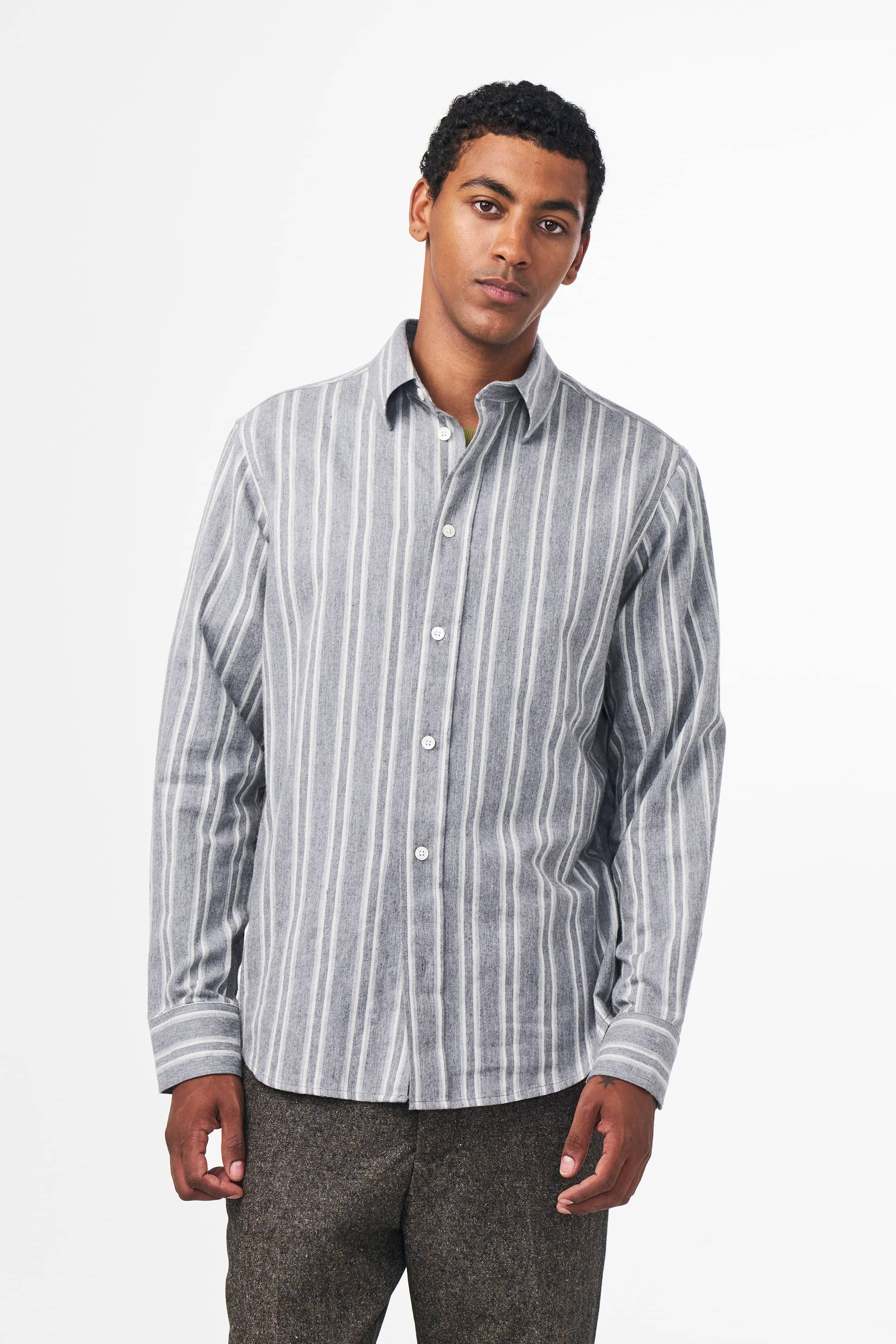Striped casual shirt crafted from yarn dyed brushed organic cotton twill, featuring Mother-of-Pearl buttons, a wide placket, and a large collar.