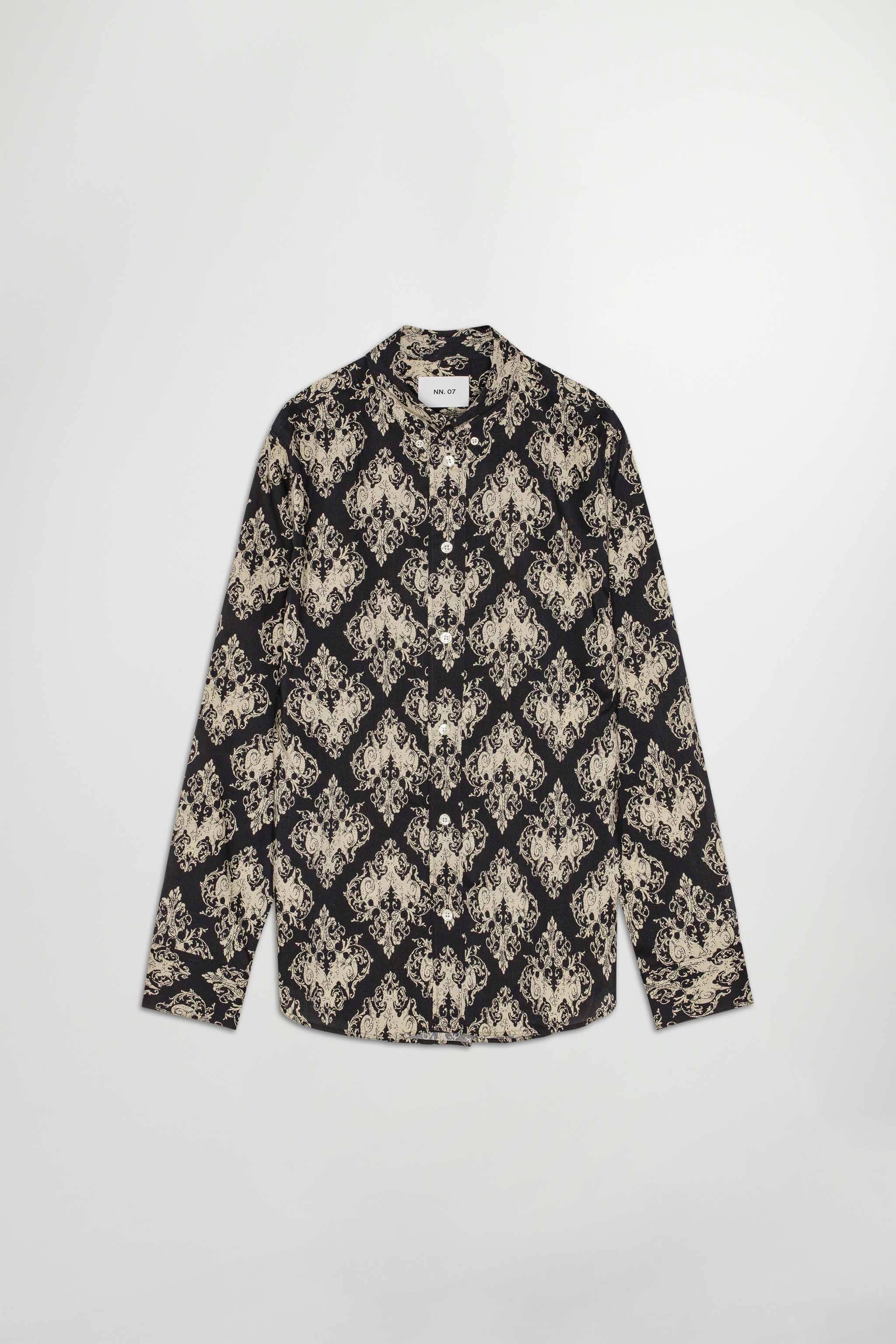 Button-down shirt crafted in a drapey TENCEL™ lyocell blend. Designed with an all-over print, a wide placket, and a large collar. Complete with Mother-of-Pearl buttons with NN.07 logo.