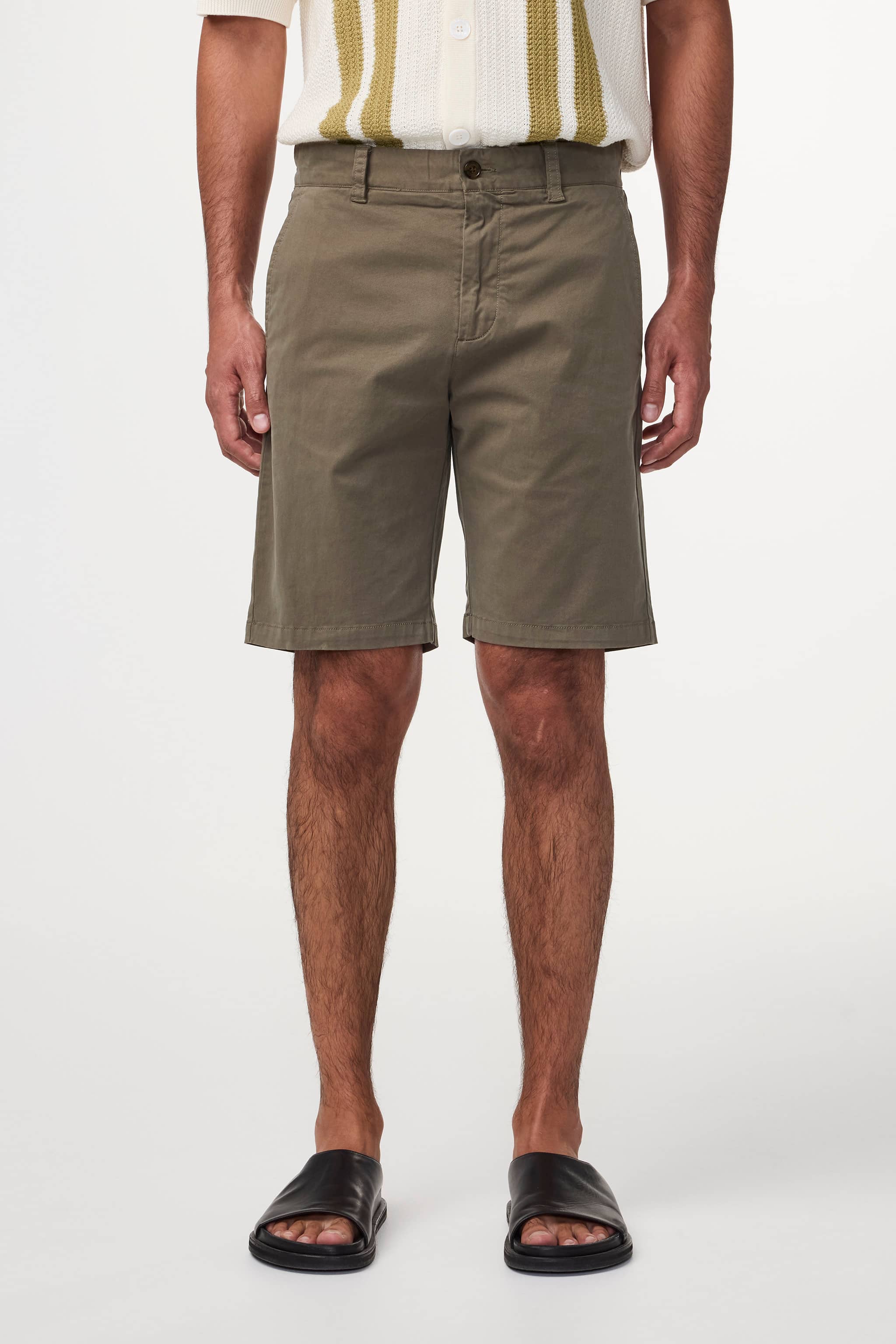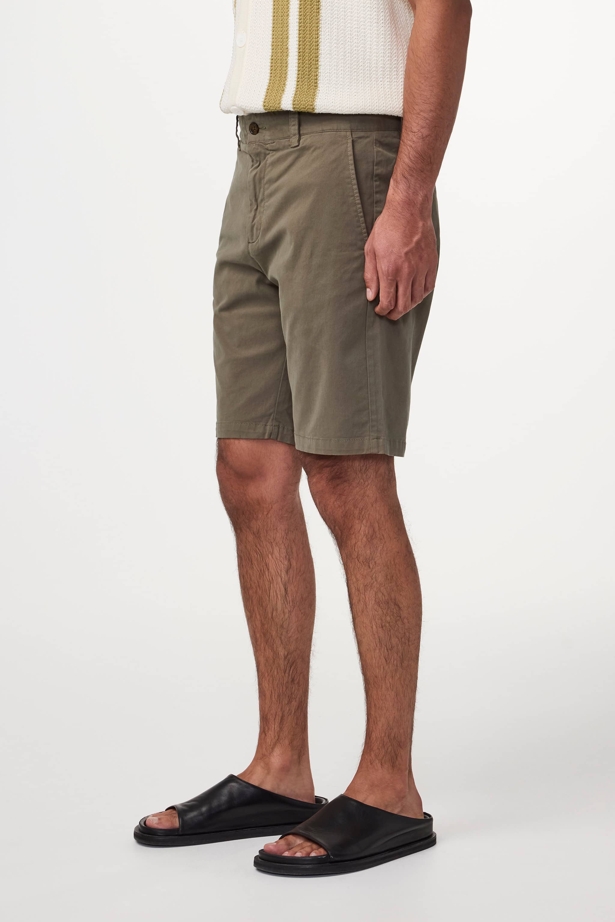 Shorts made in an organic cotton-stretch twill, with two slanted side pockets and back welt pockets. This piece has been garment dyed for a subtle patina, well-laundered look.