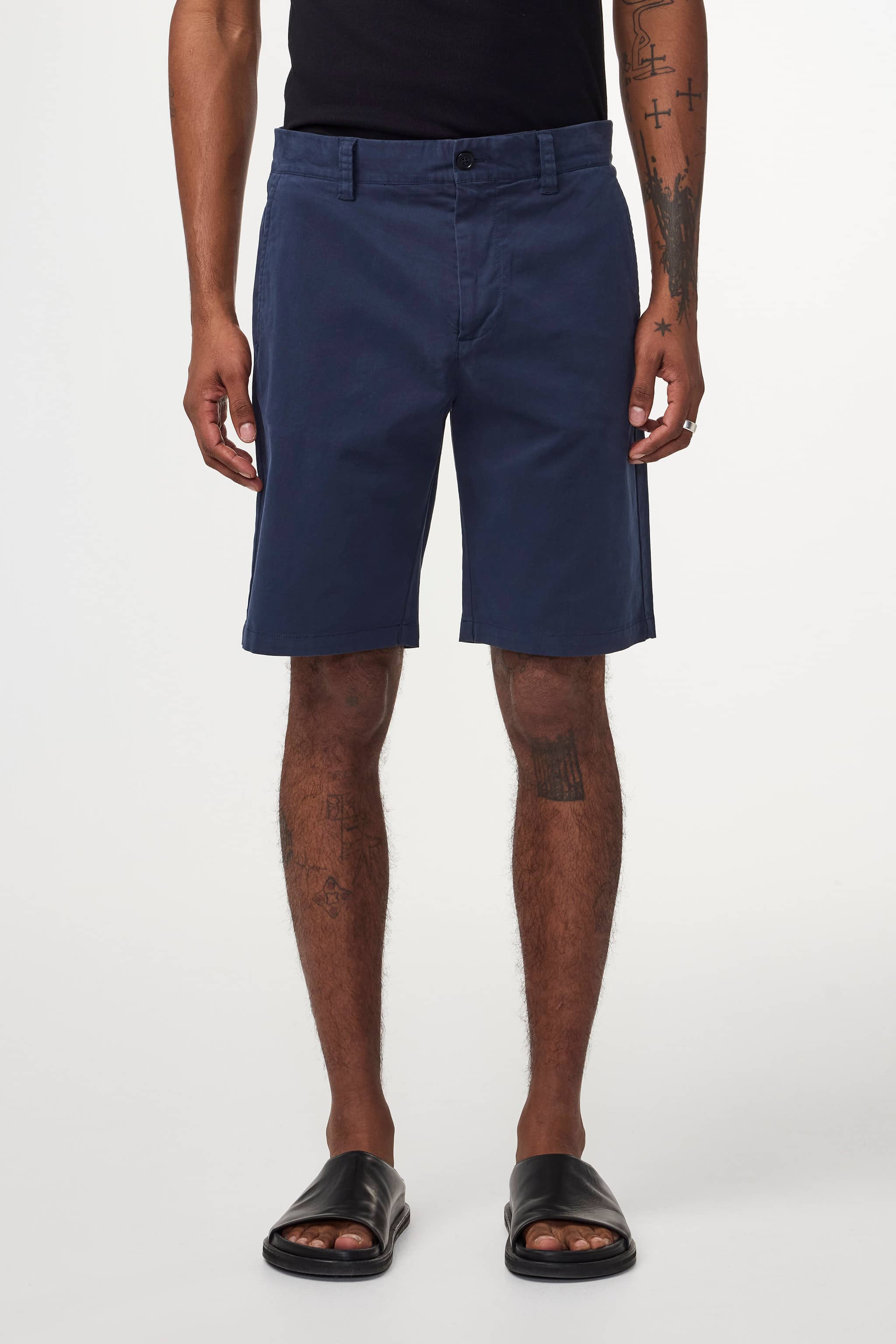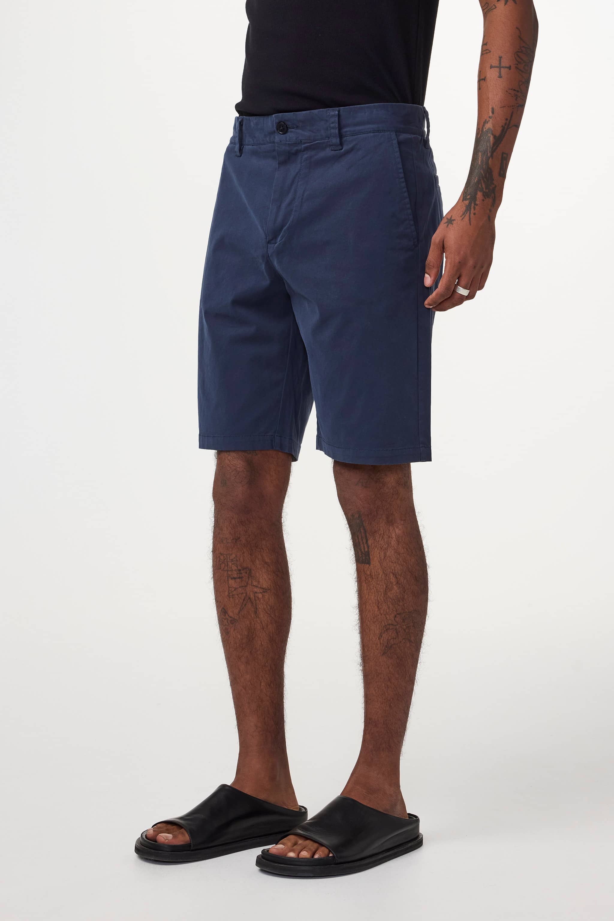 Shorts made in an organic cotton-stretch twill, with two slanted side pockets and back welt pockets. This piece has been garment dyed for a subtle patina, well-laundered look.