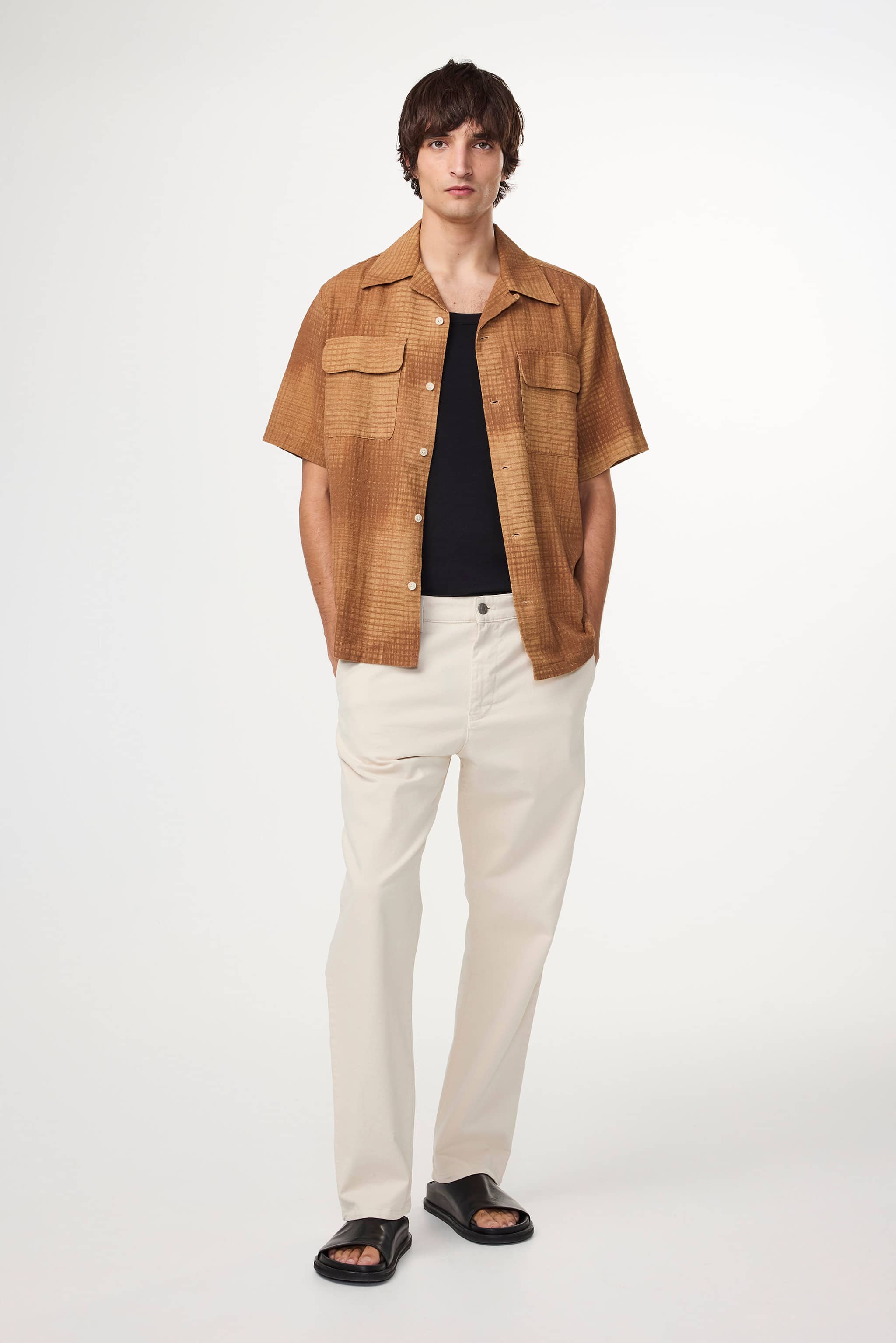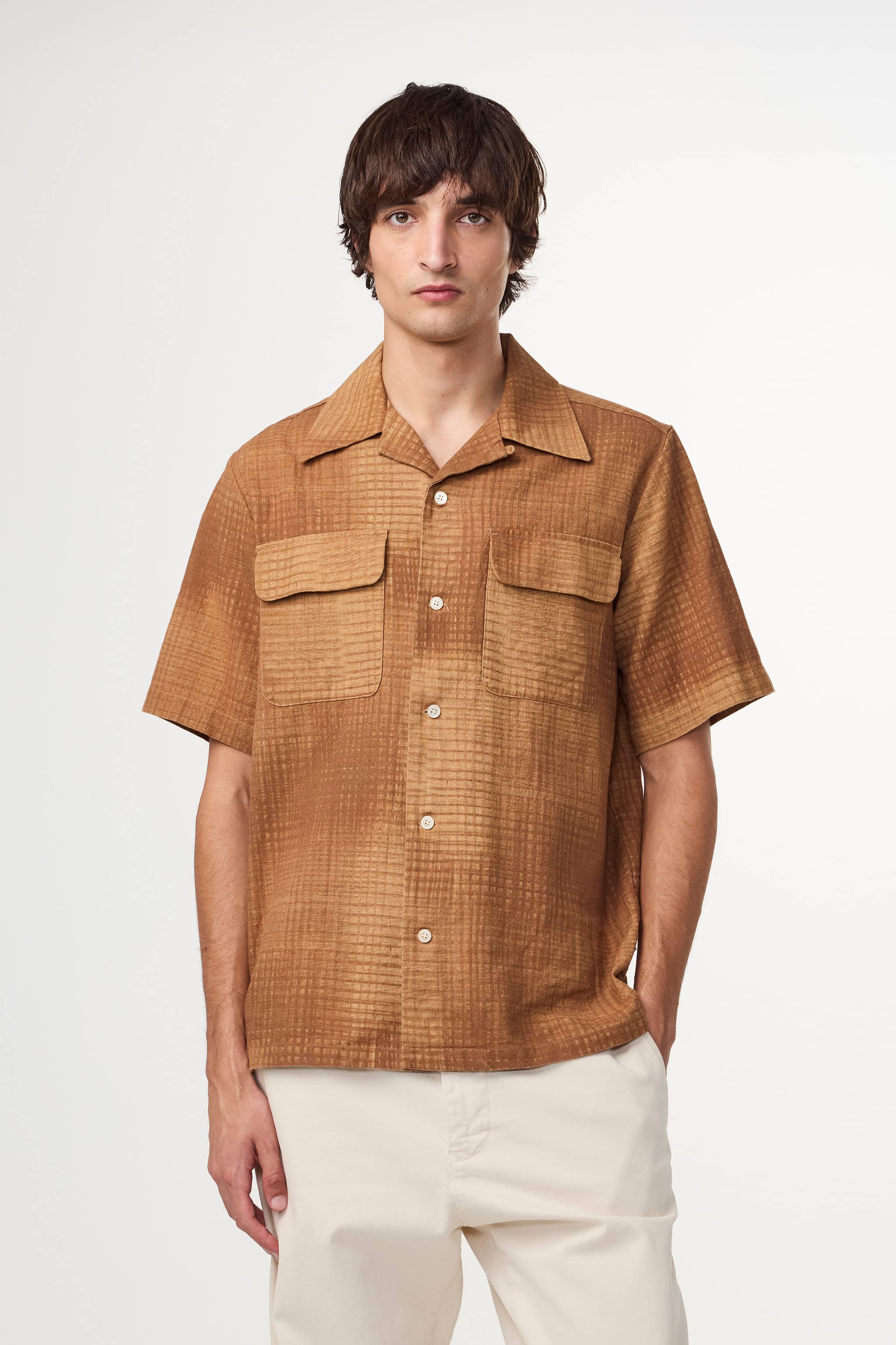 Shirt made from a linen and organic cotton blend with an all-over print, complete with rounded patch pockets and Mother-of-Pearl buttons.