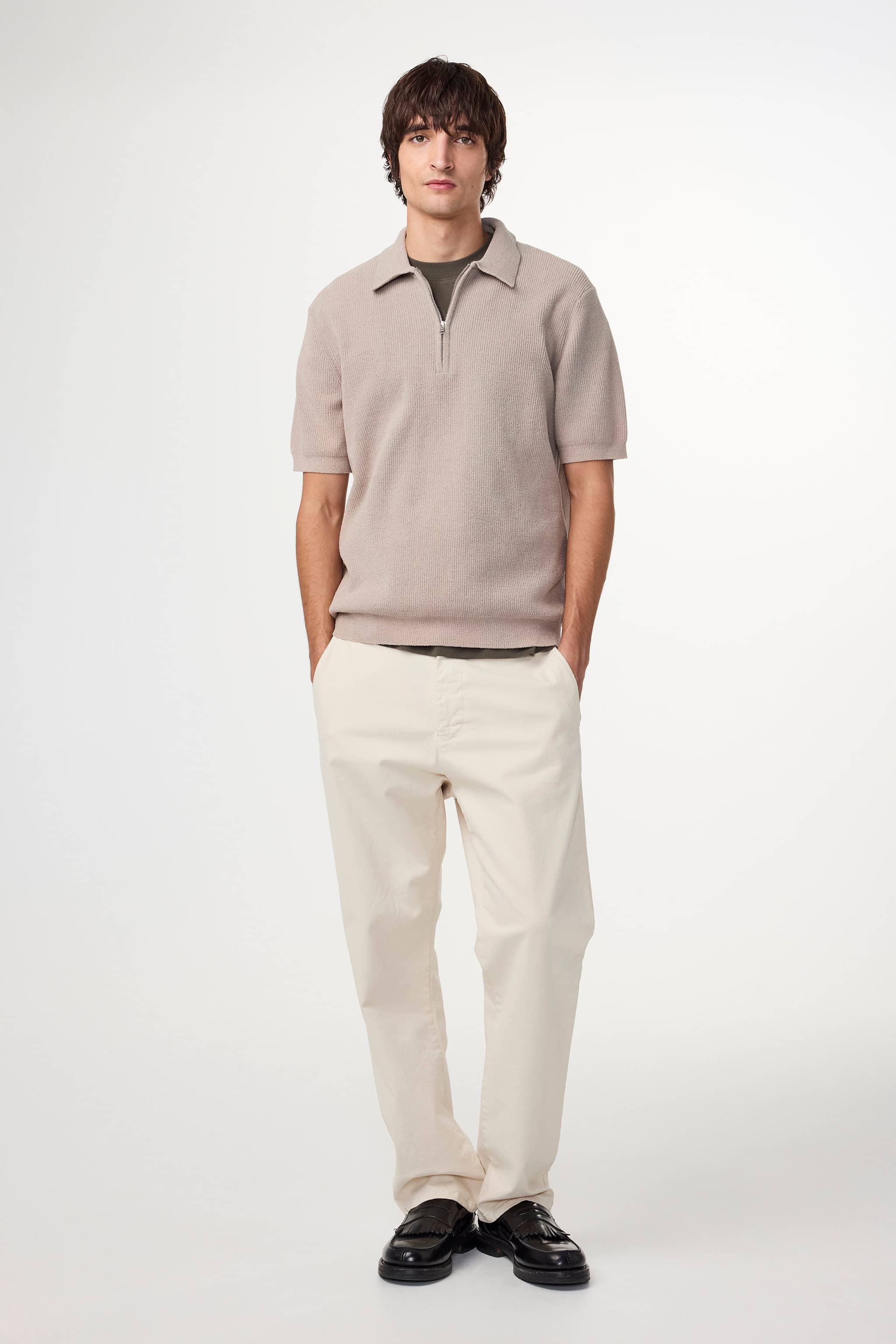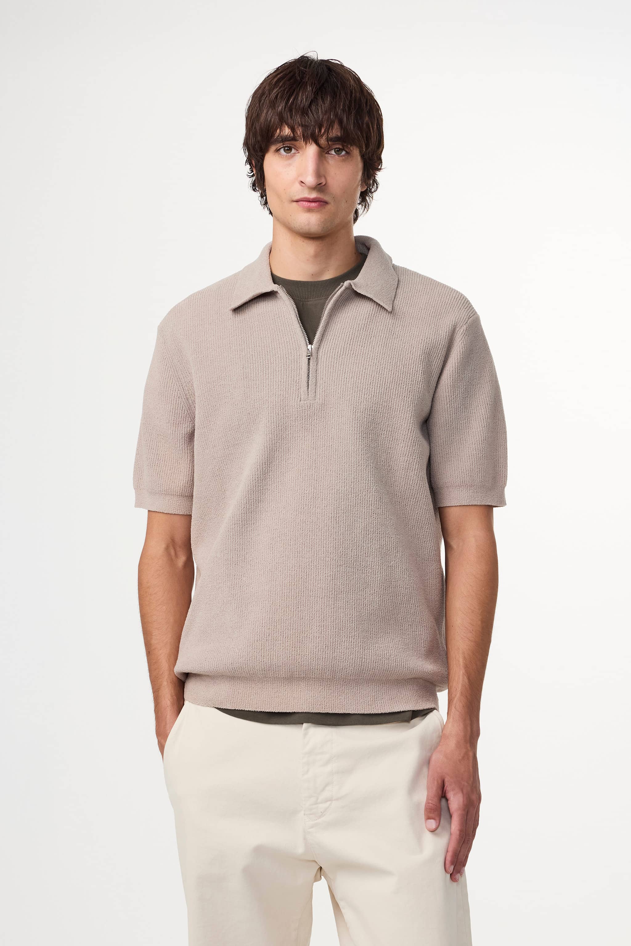 Classic ultra-soft zip polo knit made from a polyester in a rib stitch.