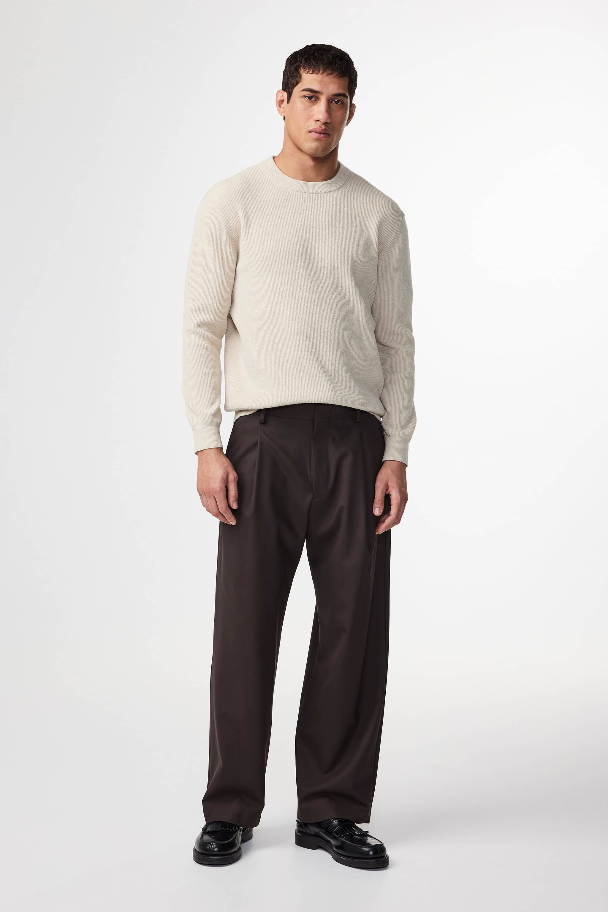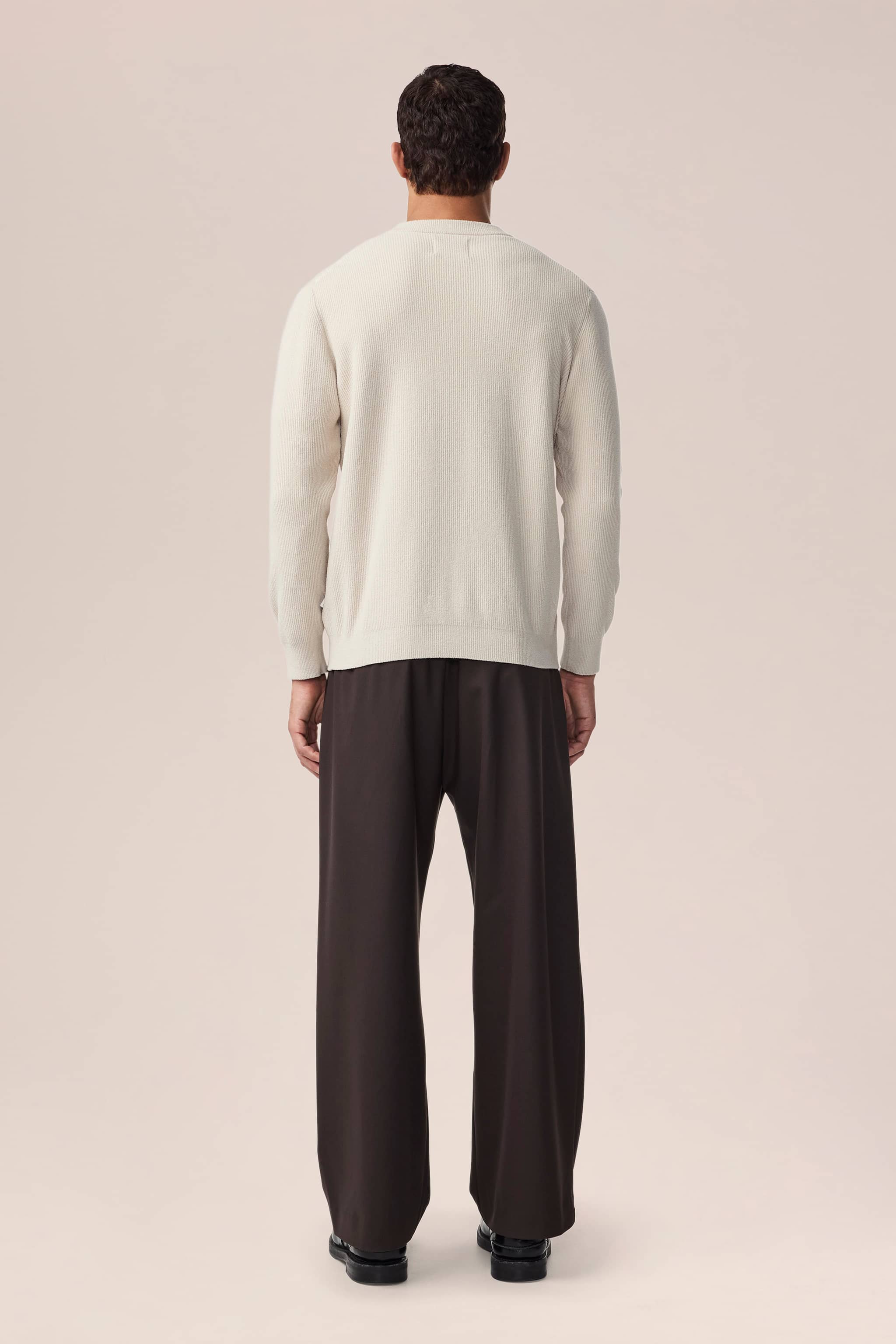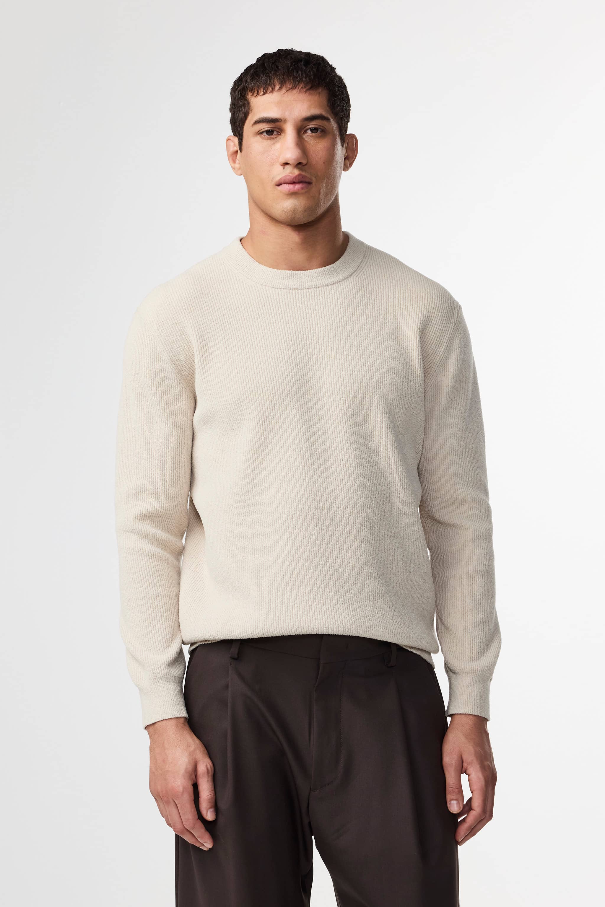 A soft crewneck sweater crafted in a lightweight polyester blend, designed with a neat rib and fashion detailing along the arm and neckline.
