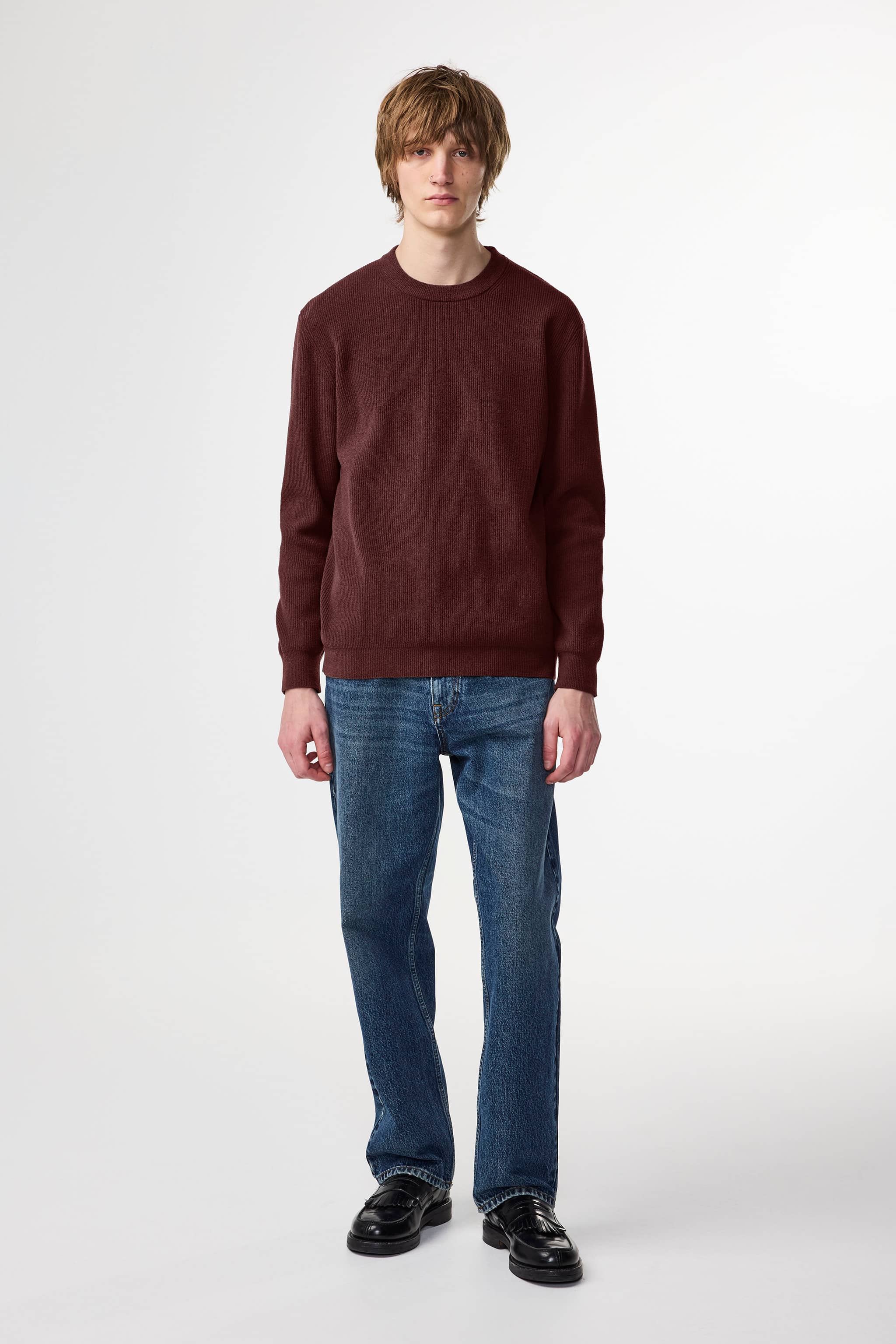 A soft crewneck sweater crafted in a lightweight polyester blend, designed with a neat rib and fashion detailing along the arm and neckline.