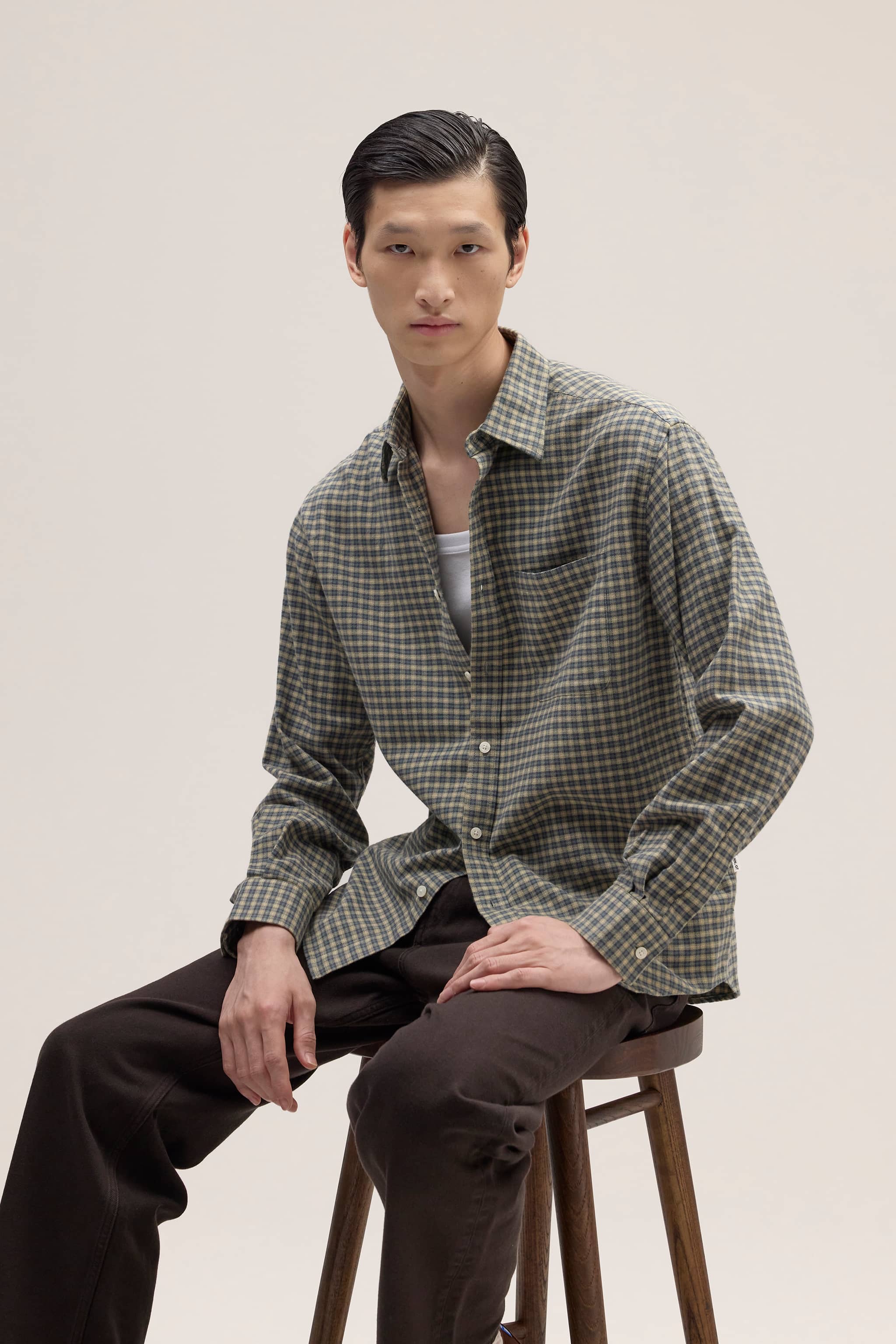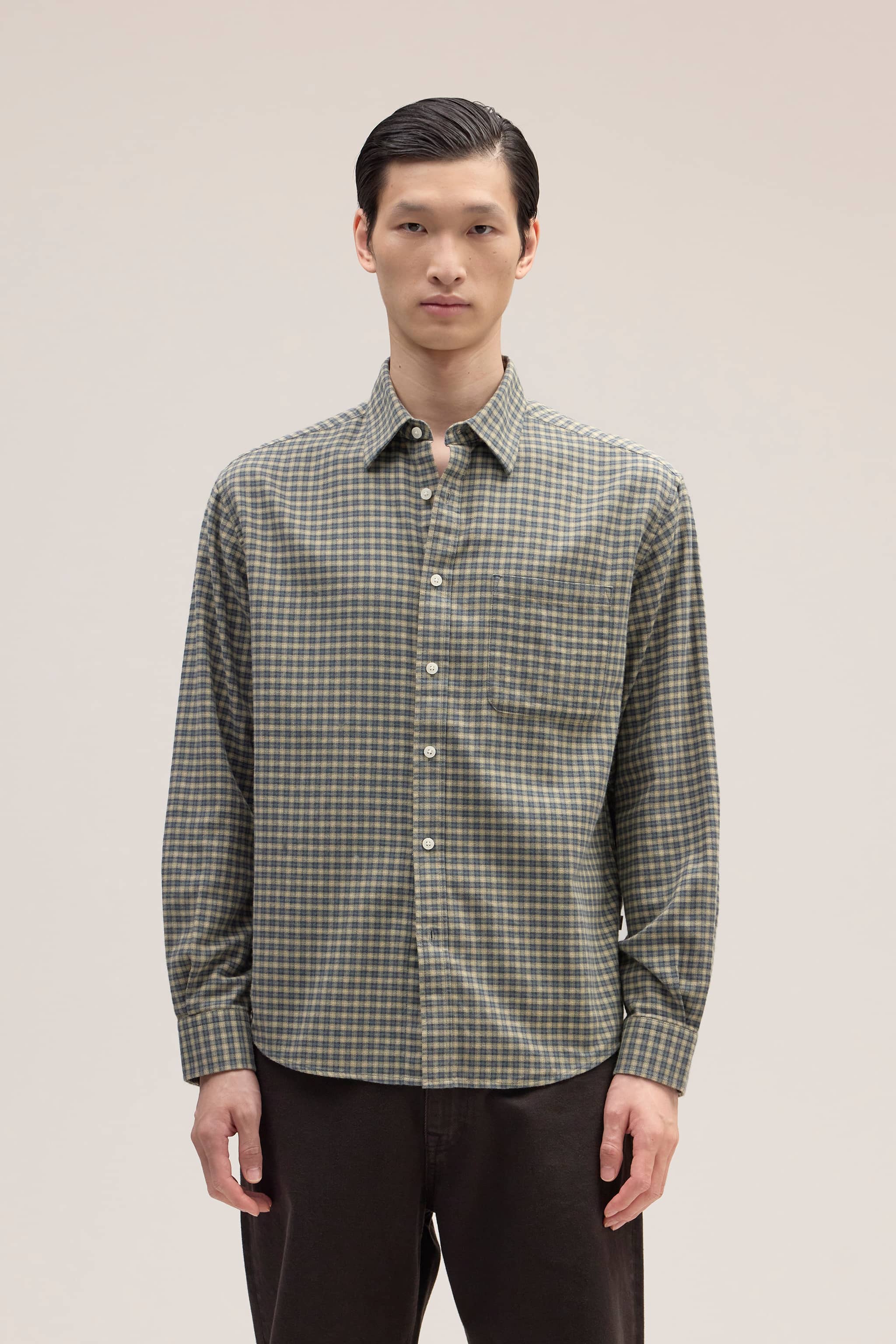 Button-up shirt made in soft cotton and woven in a flannel twill weave. Designed with a single patch pocket and rounded hemline.