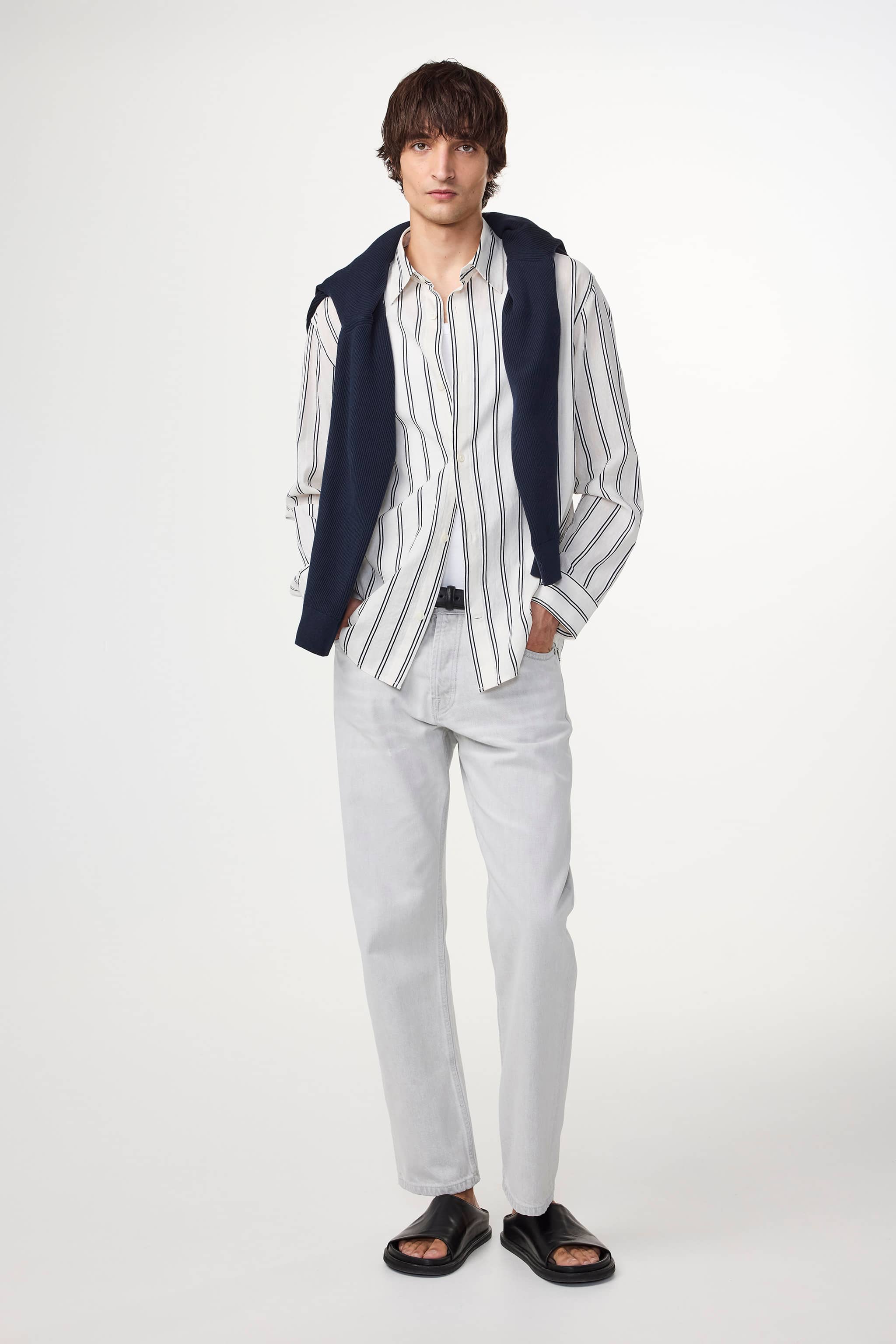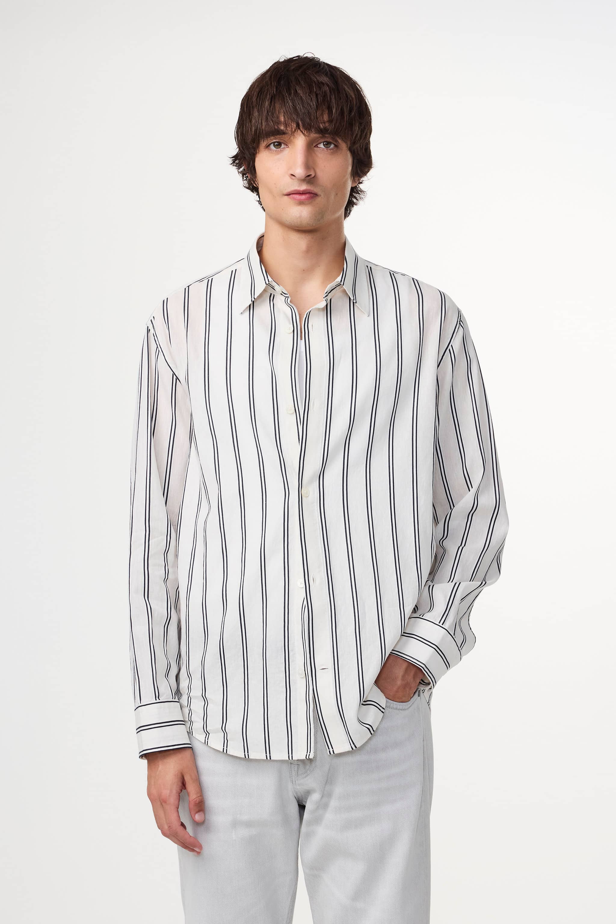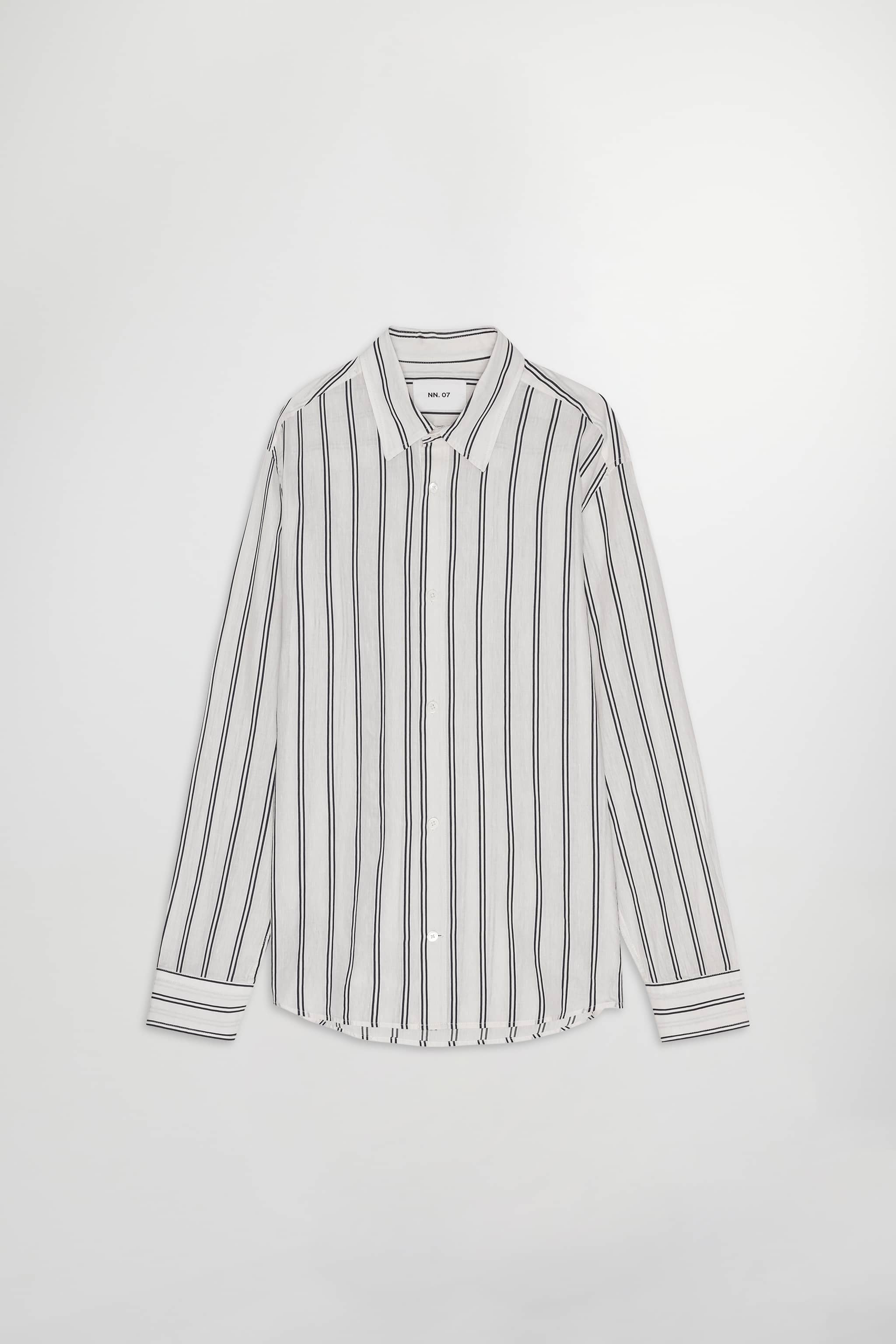 Striped shirt made from a satin weave cotton and linen blend fabric, designed with Mother-of-Pearl buttons.