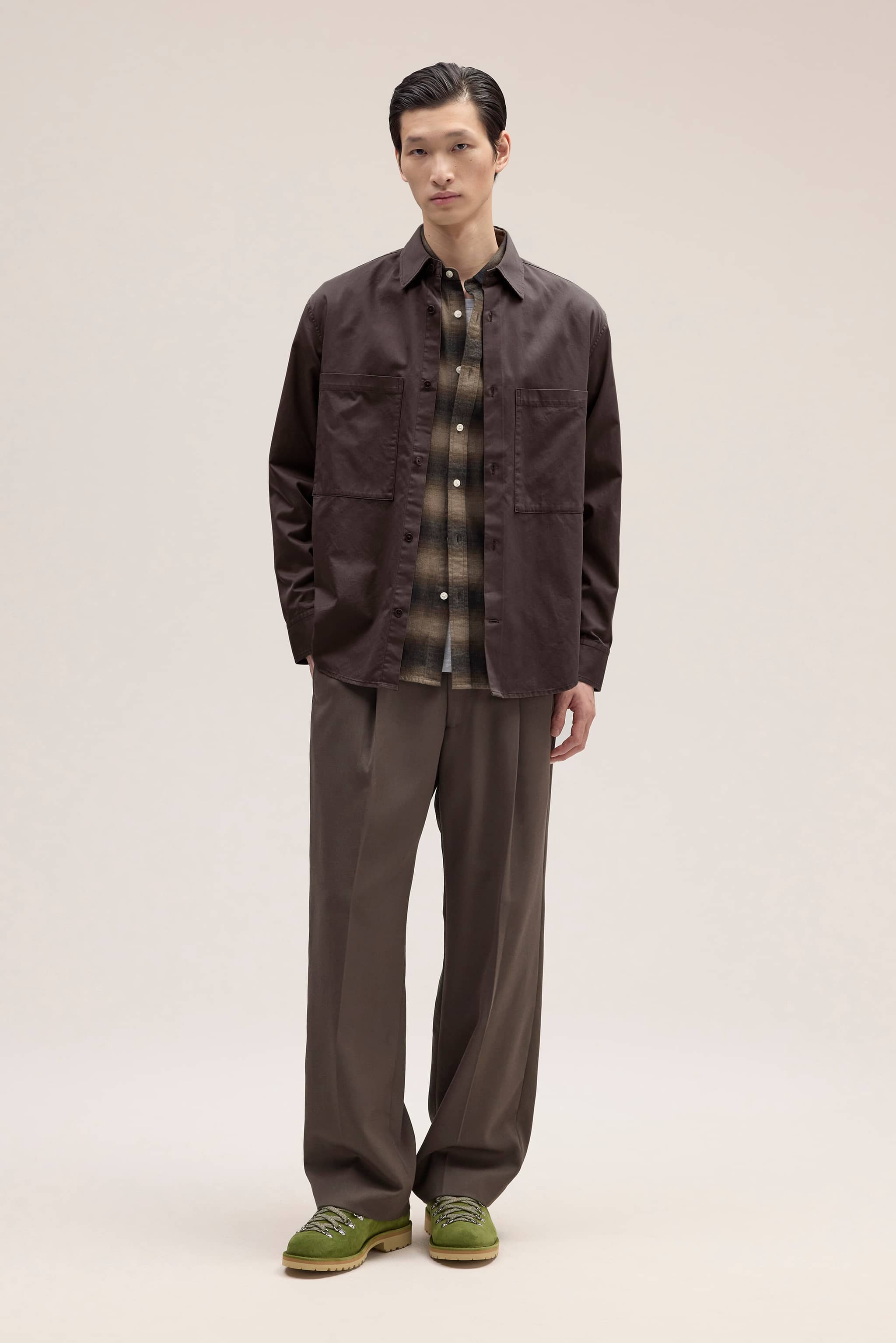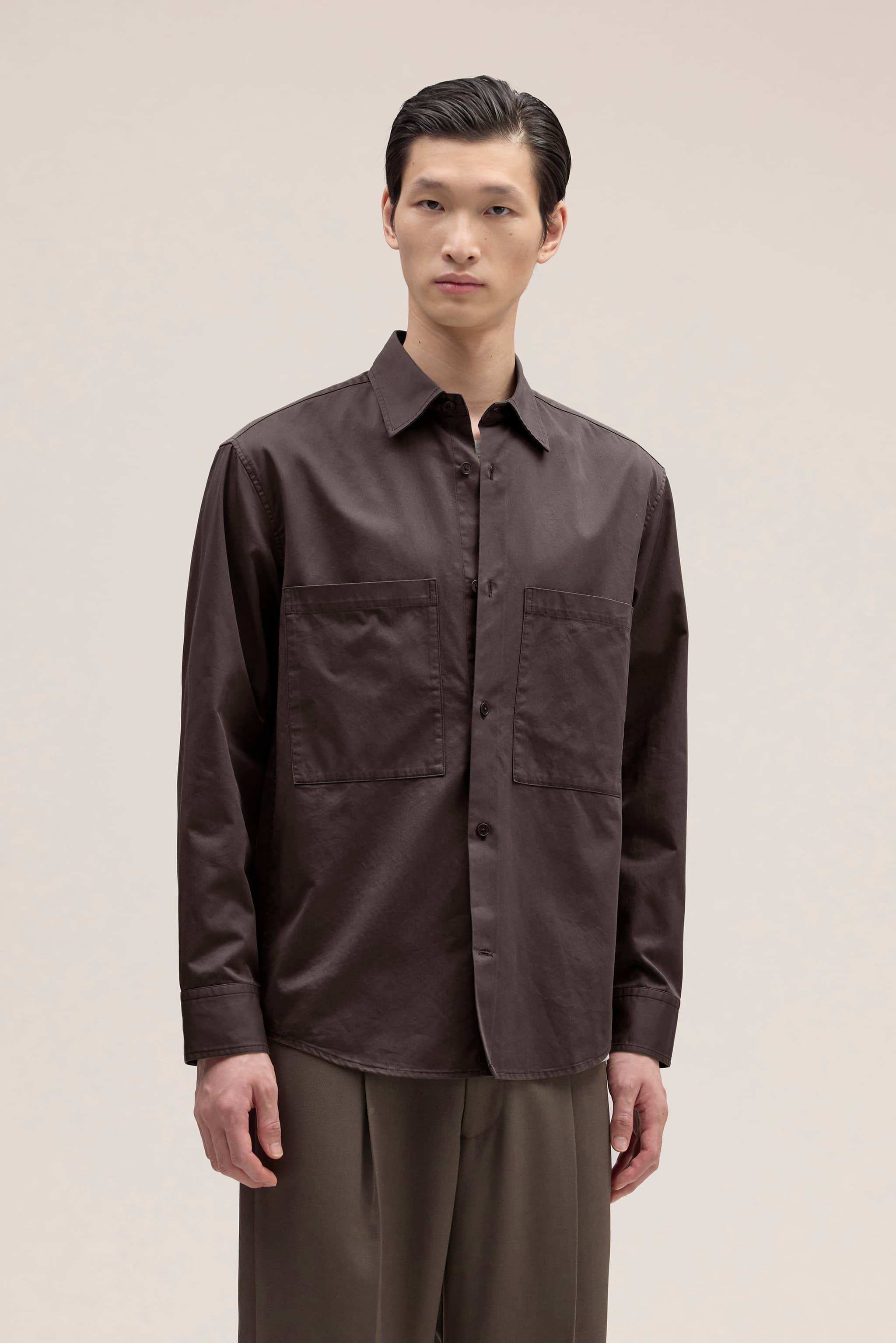 Shirt crafted in an organic cotton blend and woven in a compact twill weave. Designed with workwear-inspired flap pockets. Finished with Mother-of-Pearl buttons.