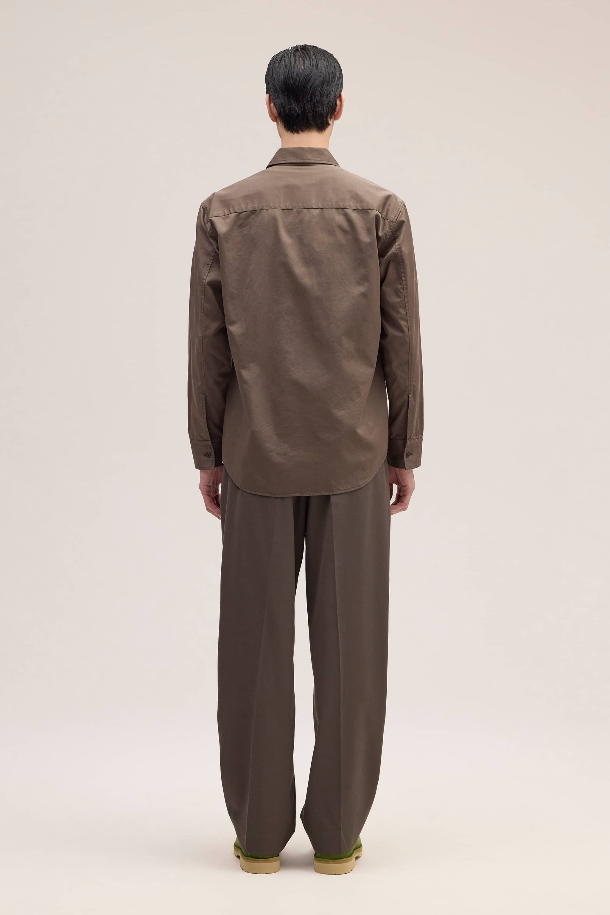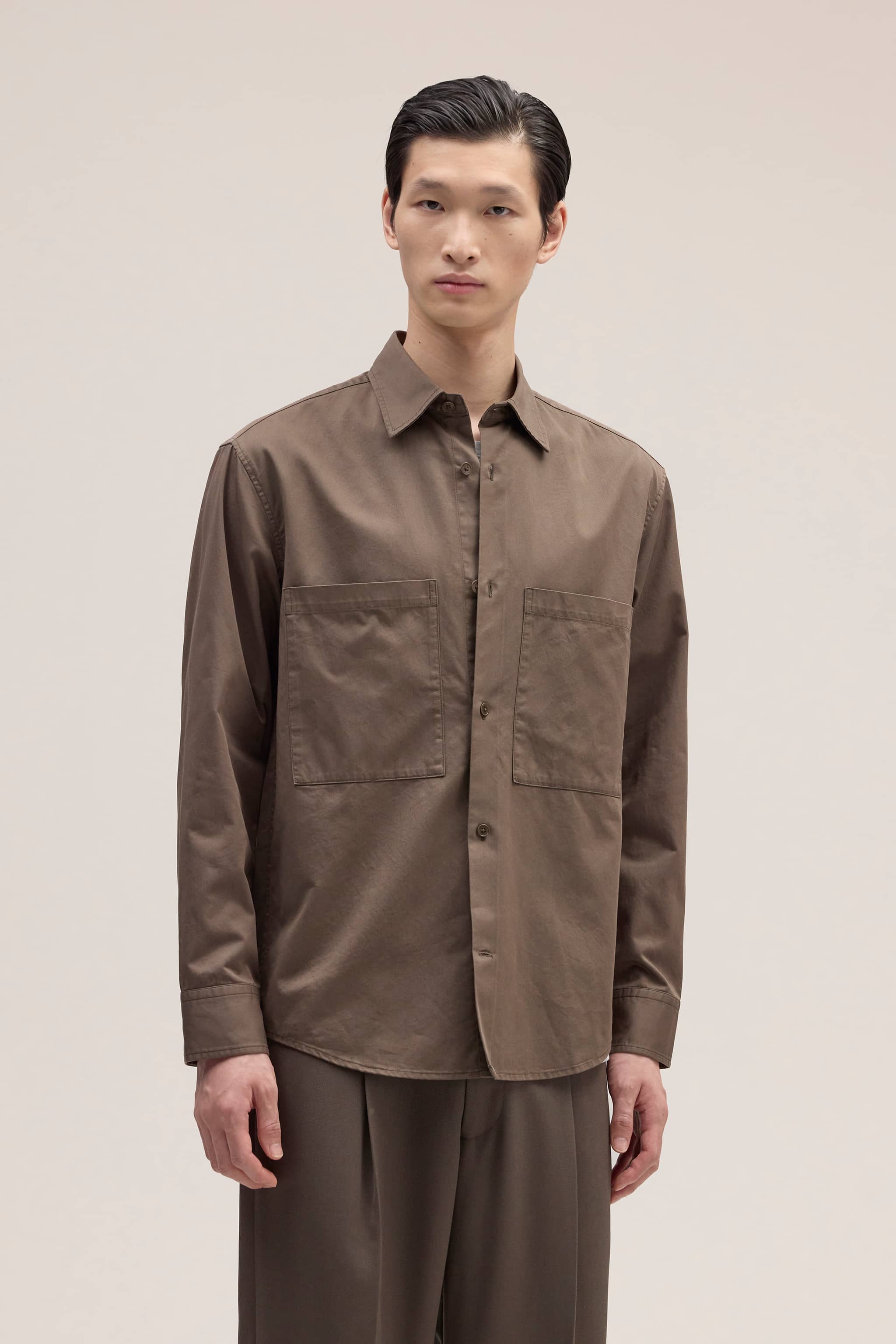 Shirt crafted in an organic cotton blend and woven in a compact twill weave. Designed with workwear-inspired flap pockets. Finished with Mother-of-Pearl buttons.