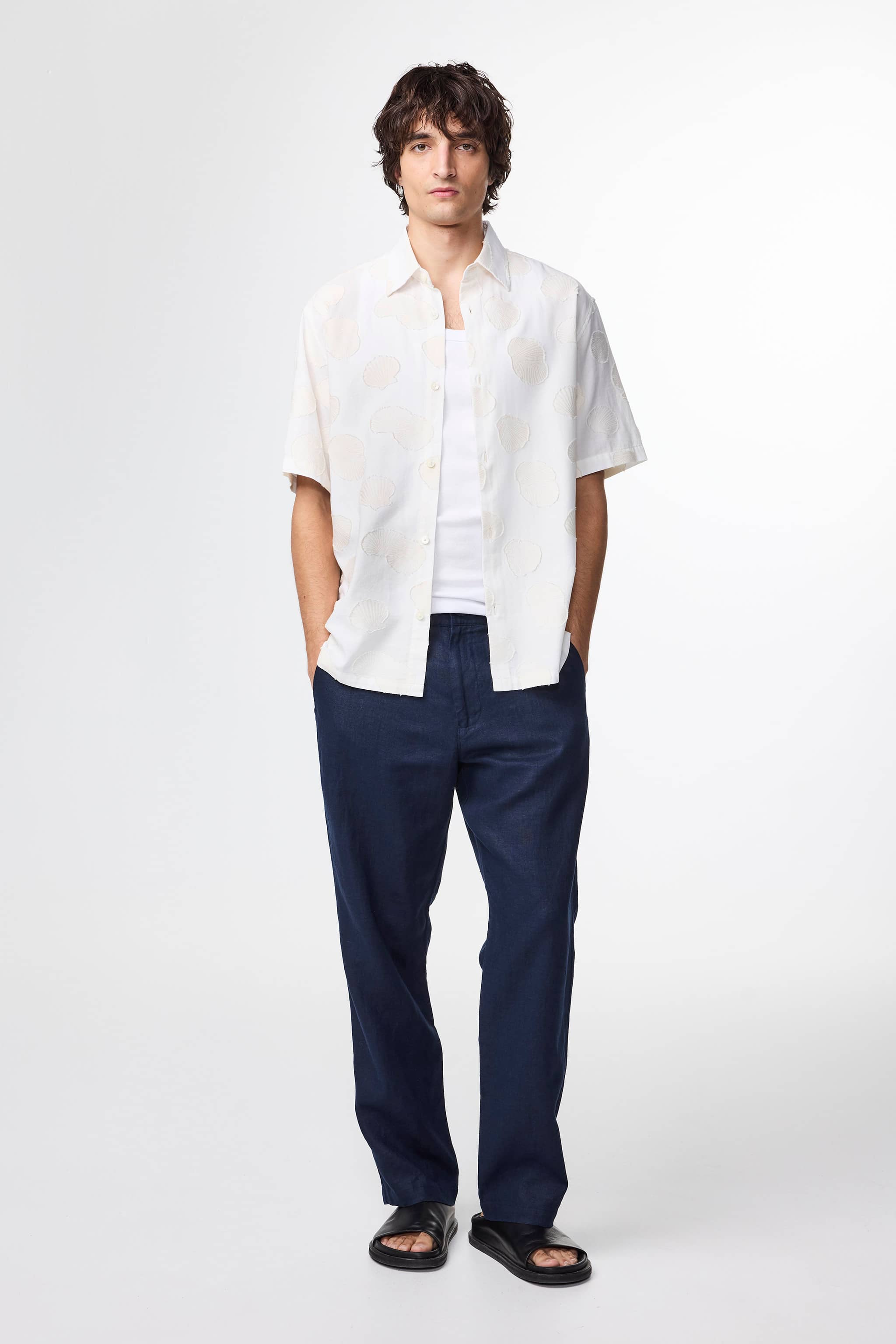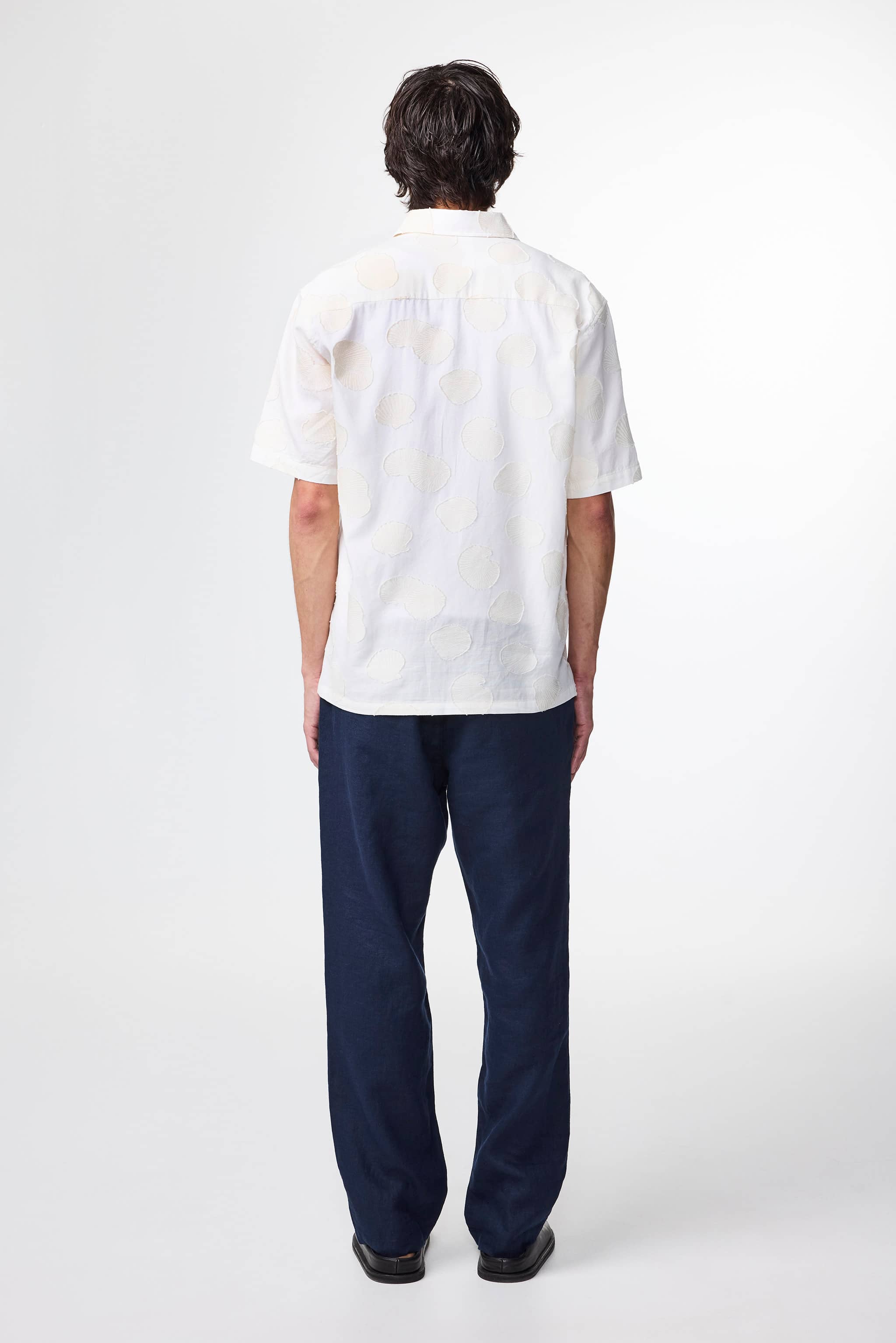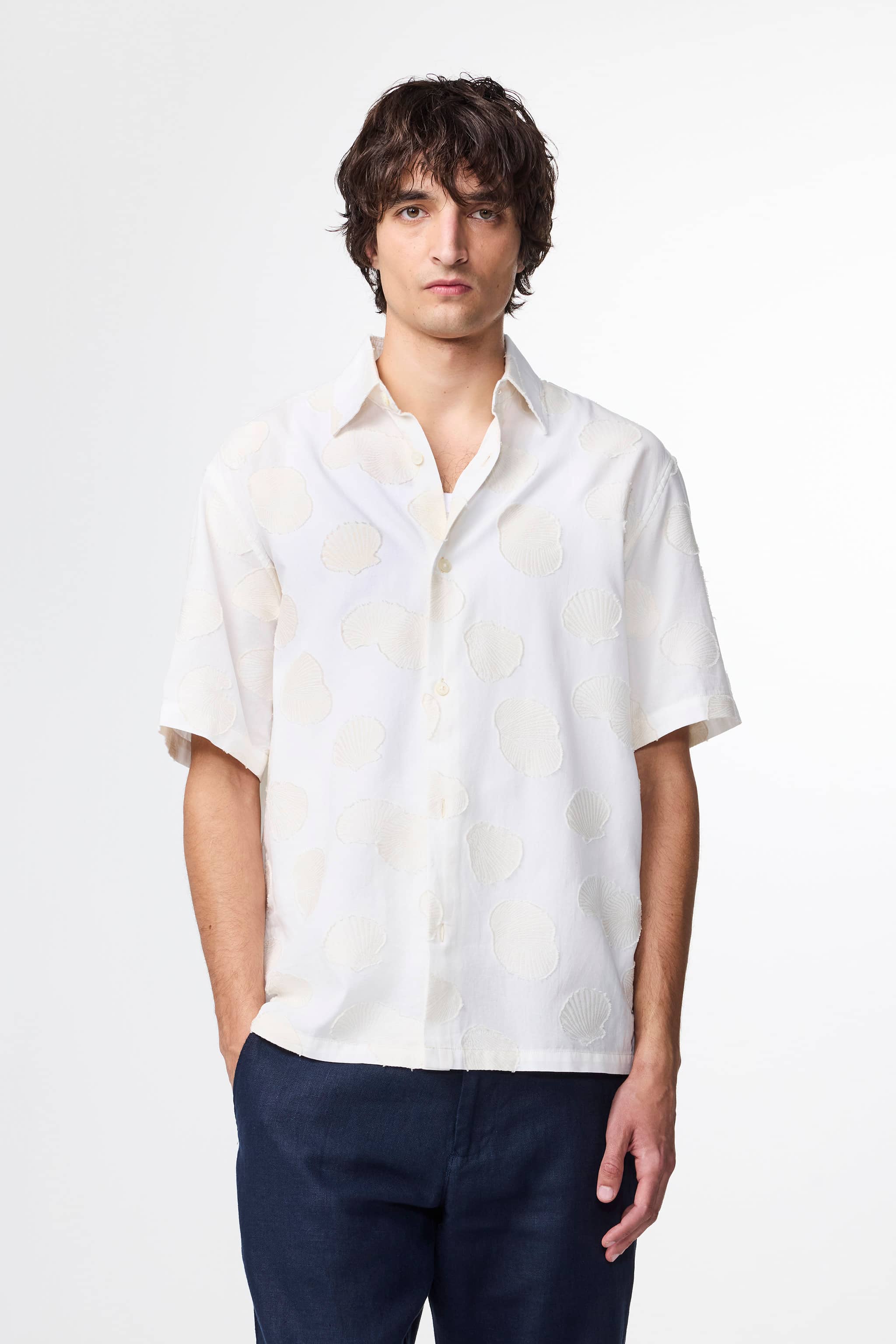 Casual shirt crafted from an organic cotton Fil Coupé jacquard complete with Mother-of-Pearl buttons.