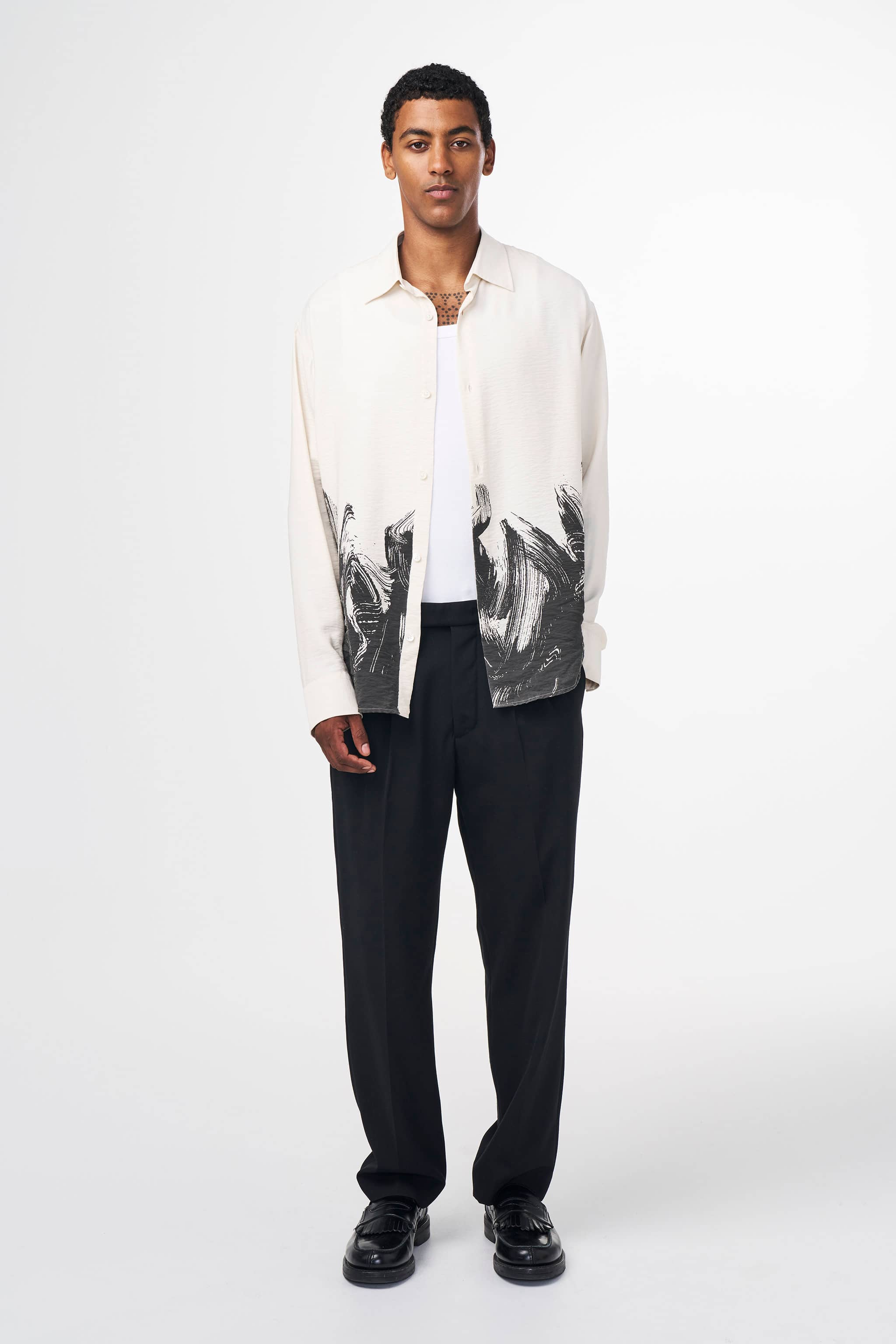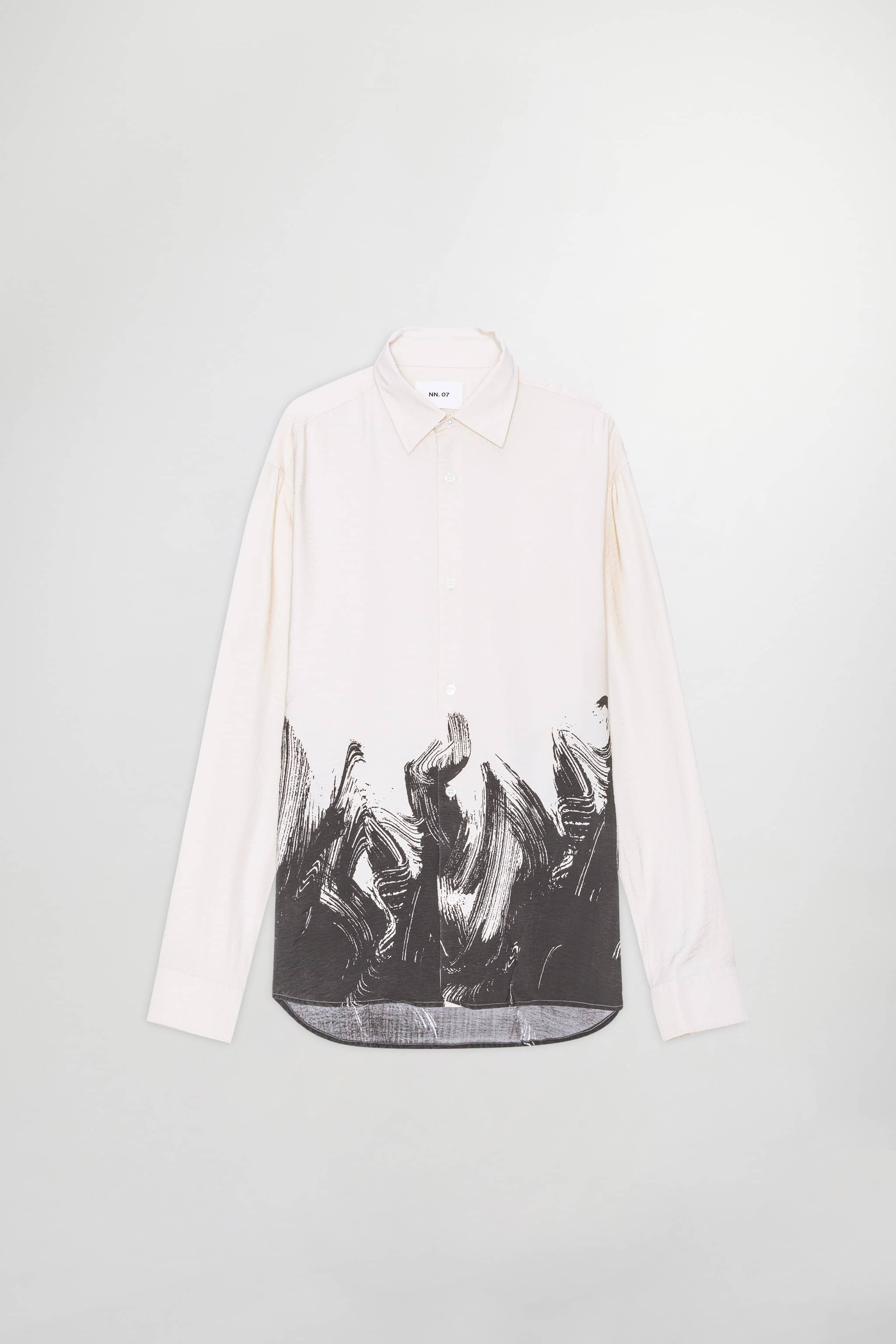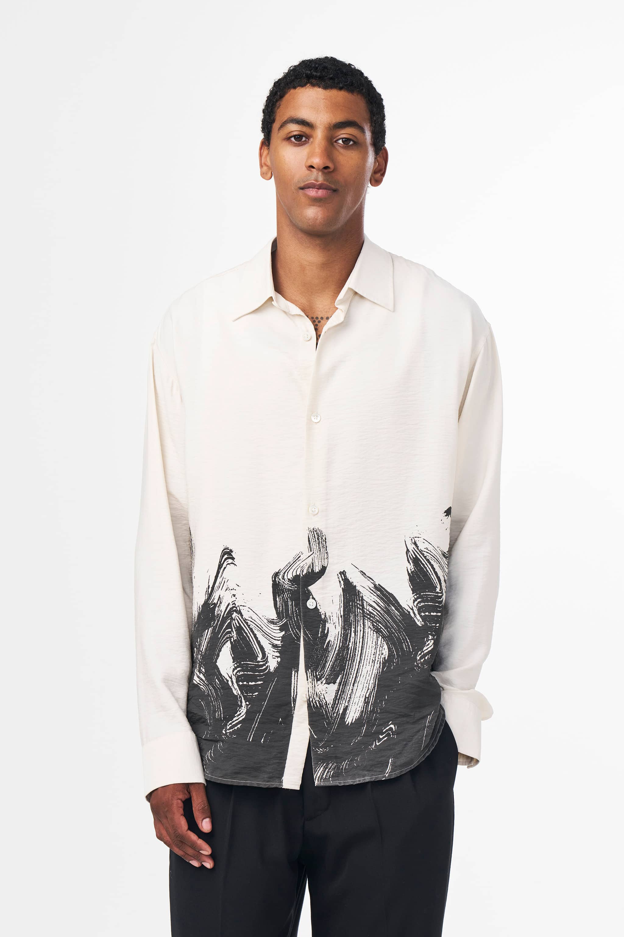 Twill shirt crafted in a crisp, lightweight TENCEL™ modal blend with printed motif on the hem, topped with Mother-of-Pearl buttons.