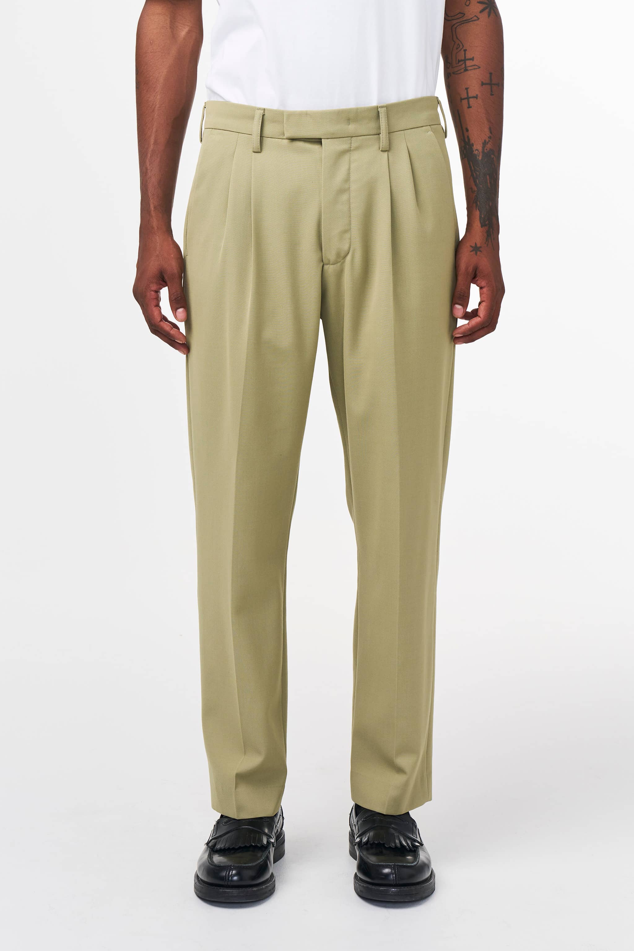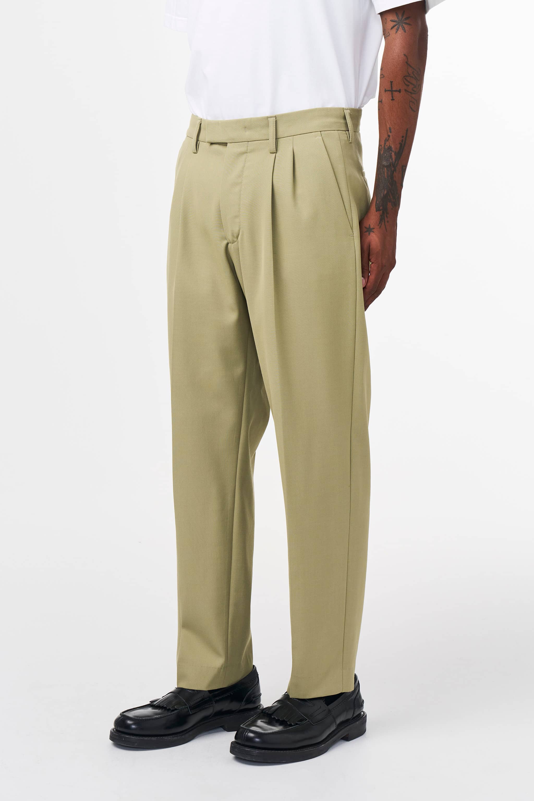 Pleated relaxed trousers with a tapered leg crafted in a soft 350 g/m2 certified wool twill blend. The trousers have a classic crease along the leg, a blind hem, a hidden closure, and are topped with urea buttons.