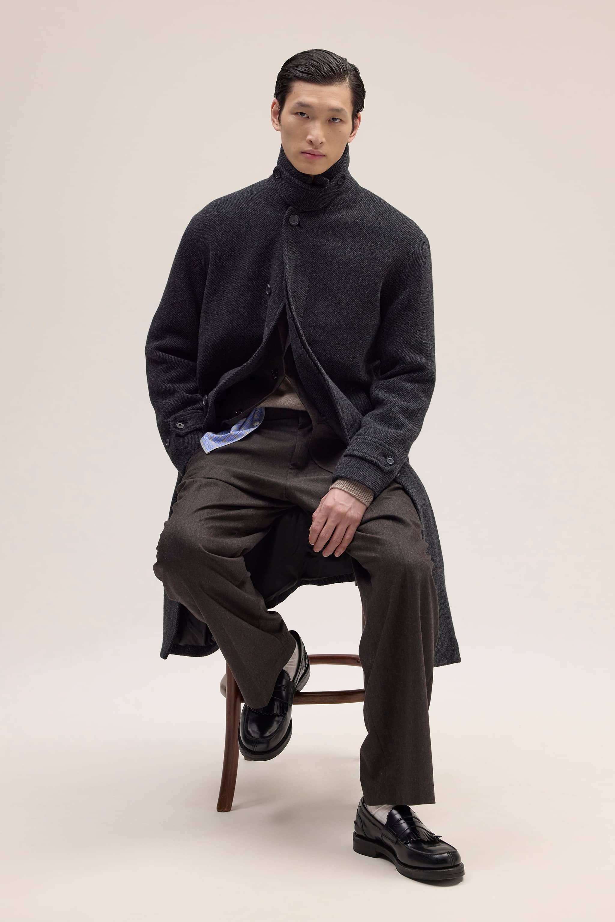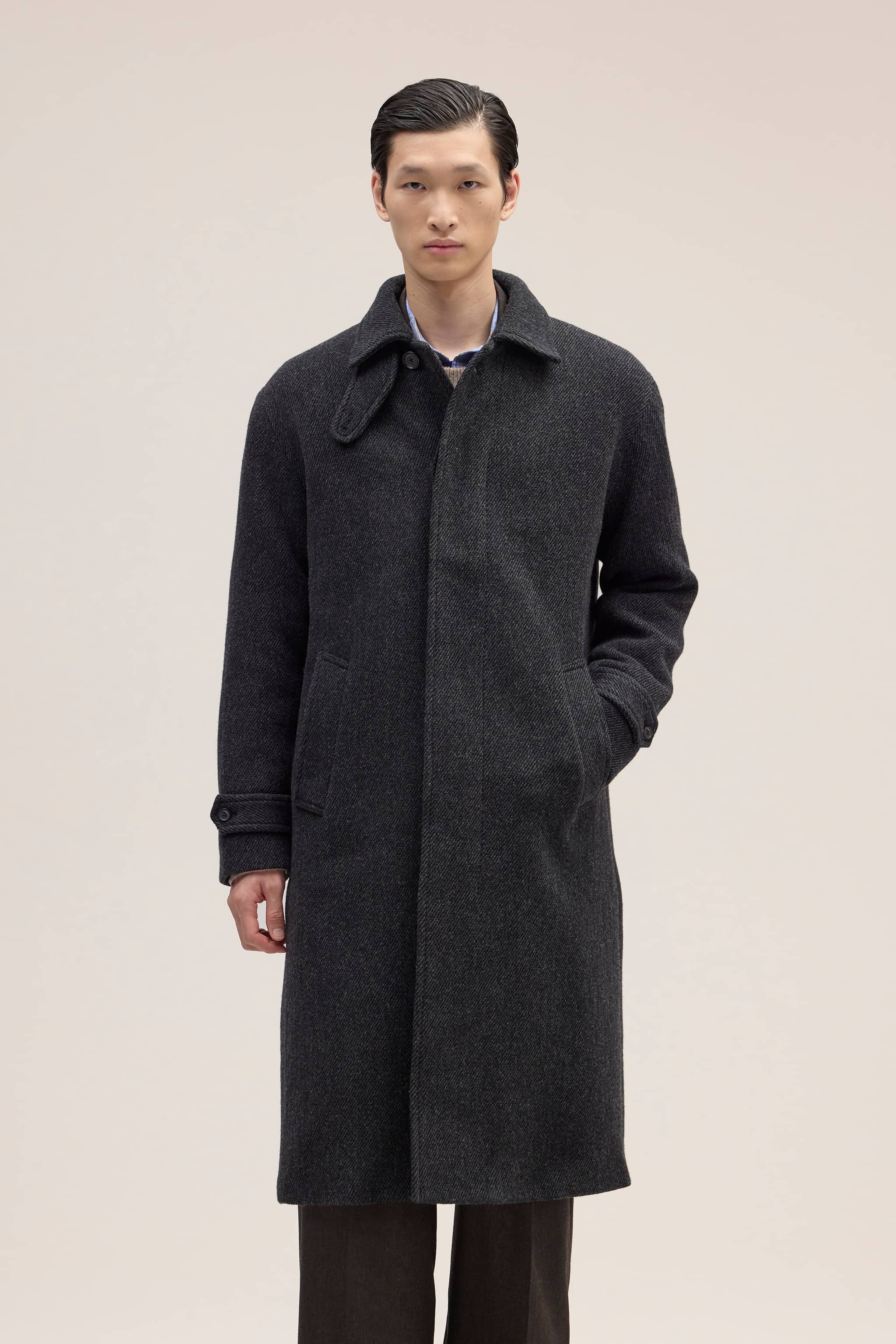 This brushed coat is crafted from heavyweight Italian wool by Manteco in twill weave. Reinforced with Earthhorn buttons, this piece is designed for comfort in chilly weather down to 0°C.