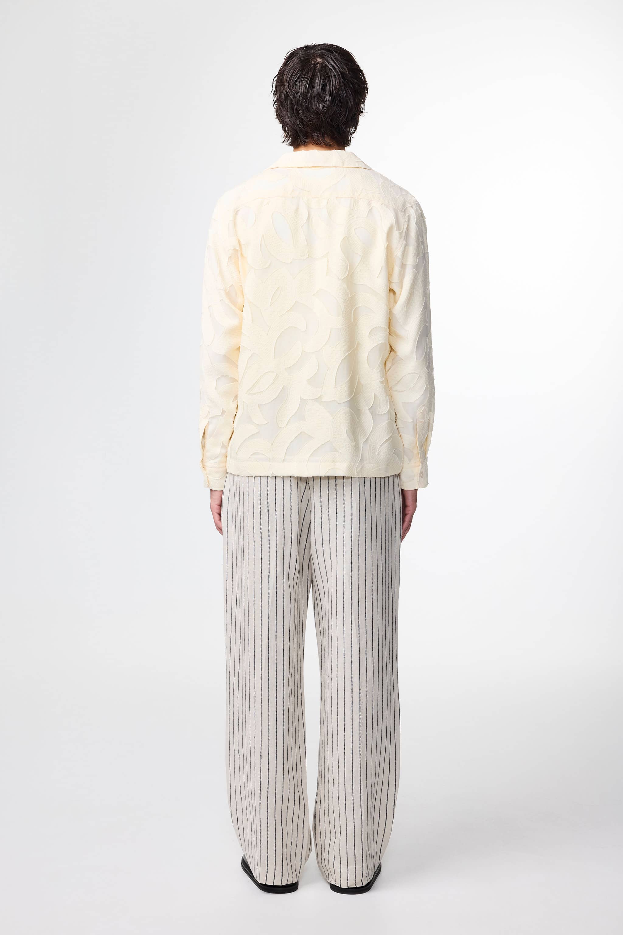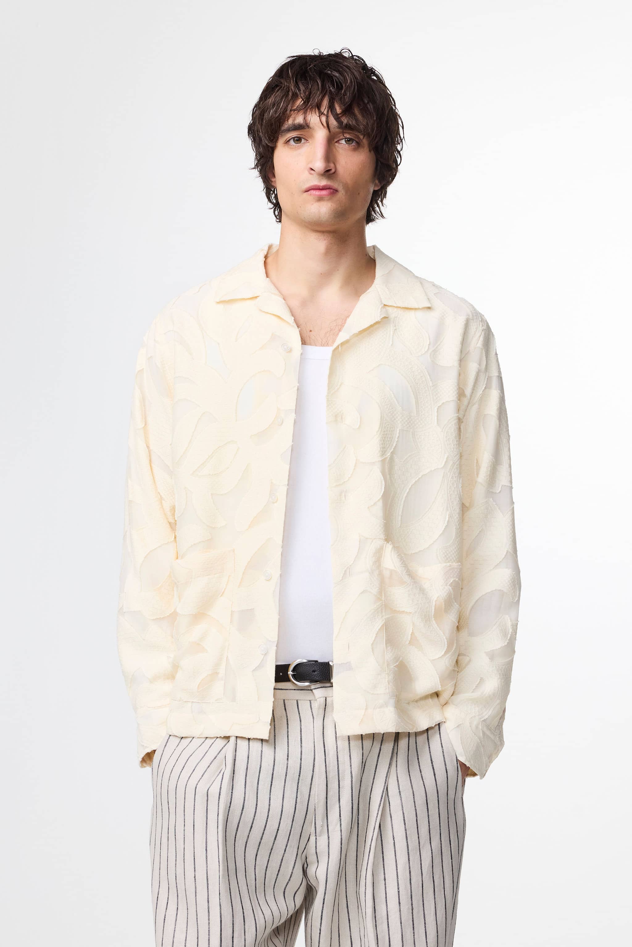 Overshirt made from a fancy fil coupé jacquard in a LENZING™ ECOVERO™ Viscose blend. The shirt has an open collar and patch pockets at the waist.